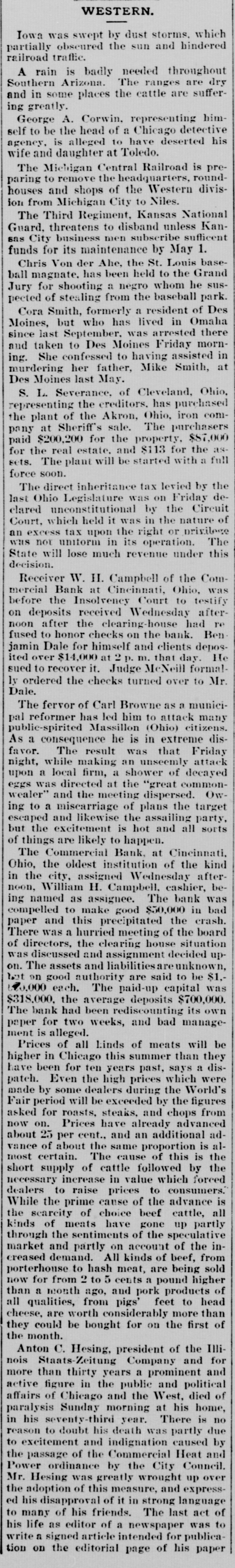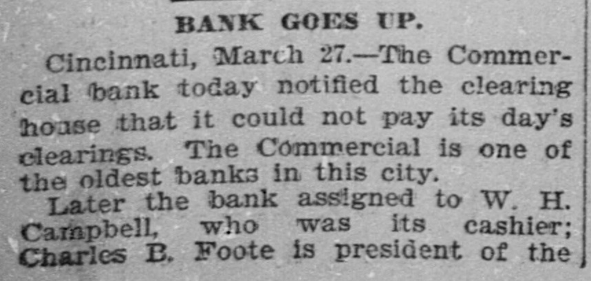 SUSPENDED PAYMENT COMMERCIAL BANK OF CINCINNATI FORCED TO CLOSE. Clearing House Association Refused to Extend Aid-Securities Ample to Pay Depositors. CINCINNATI, O., March 27.-The Commercial Bank to-day notified the clearing house that it could not pay its day's clearings. The Commercial is one of the oldest banks in the city. It is stated that the affairs of the bank have been looked into somewhat by other banks and it was concluded that the banks could no nothing to relieve the situation in connection with the Commercial. Later in the day the bank assigned to W. H. Campbell, who was cashier of the bank. Charles B. Foote is president of the bank and W. H. Campbell cashier. Cashier W. H. Campbell stated that the bank had but temporary suspended payment and would be all right in a few days. There had been an unusually heavy run on the bank to-day and it became absolutely necessary to suspend business. He said further that the bank held ample securities to pay out to all depositors in time. The Commercial Bank was founded in 1831 and succeeded the branch of the United States Bank when the last went out of business, by buying the building, A number of old-time, solid financiers have been identified with the institution, among them Jacob Strader, Captain Hall, Ethan Stone, Elliot H. Pendleton, Hugh Colville, Armstrong and contemporaries. A number of the large estates of the city and of the Ohio valiey are customers of this bank. To-night it is reported that the affairs of the bank will develop badly. The bank has a paid up capital stock of $328,000 and a surplus of $40,000. Its average deposits were $400,000. The stock was divided into shares of $50 each, and though little trading was done in it, it was quoted on the market at 921/2, asked. It has $900,000 bills receivable, but it is claimed that much of this paper is not good, that the trouble was precipitated by the bank being compelled to make $50,000 of bad paper good yesterday. The directors are Charles B. Foote, a relative of the late Senator Pendleton: William Herron, J. B. Specker, A. B. Batterman and A. B. Hall, who did all they could to prevent the run. Although the bank is the oldest in the State, it is the only one in Cincinnati that had to be carried during the panic two years ago. When the present trouble came on the clearing house appointed a committee to investigate it. The adverse report of the clearing house committee to-day precipitated the trouble, and it is the general opinion that the liabilities will greatly exceed the available assets.