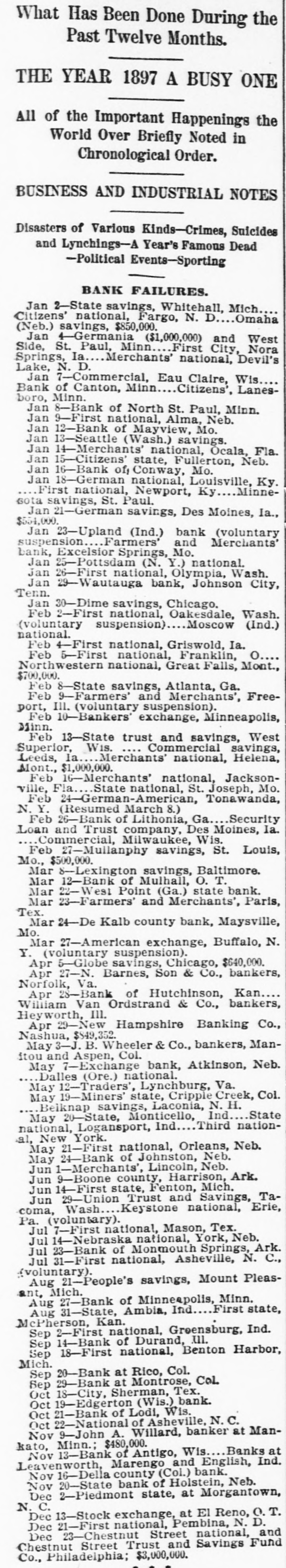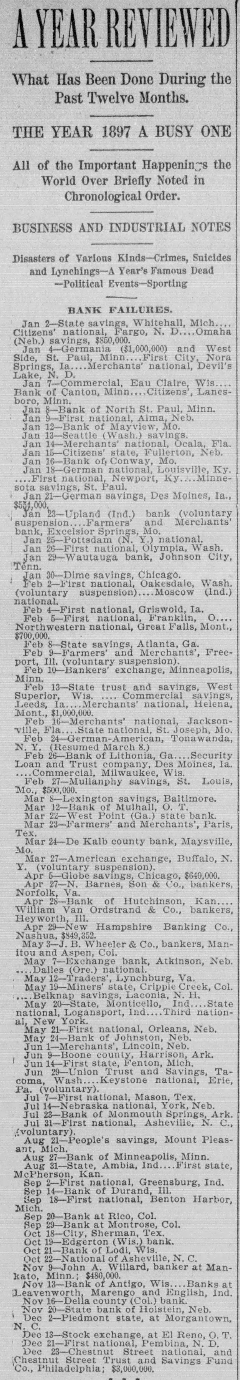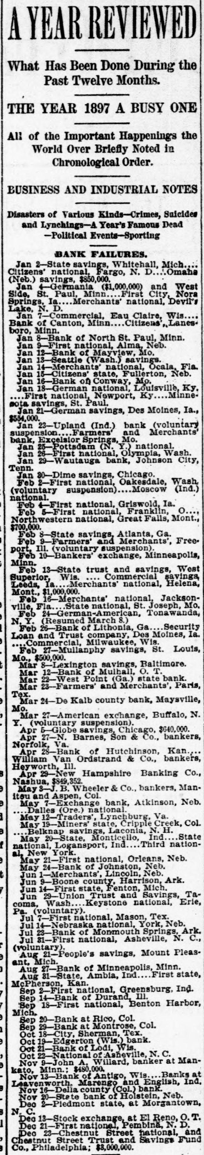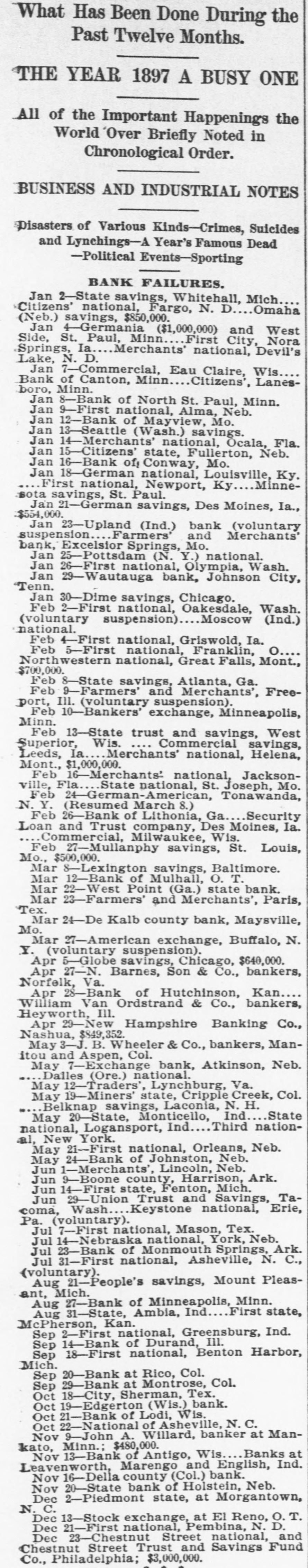A YEAR REVIEWED What Has Been Done During the Past Twelve Months. THE YEAR 1897 A BUSY ONE All of the Important Happenings the World Over Briefly Noted in Chronological Order. BUSINESS AND INDUSTRIAL NOTES Disasters of Various Kinds-Crimes, Suicides and Lynchings-A Year's Famous Dead -Political Events-Sporting BANK FAILURES. Jan 2-State savings, Whitehall, Mich. Citizens' national, Fargo, N. D.. Omaha (Neb.) savings, $850,000. Jan 4-Germania ($1,000,000) and West Side, St. Paul, Minn. First City, Nora Springs, Ia. Merchants' national, Devil's Lake, N. D. Jan 7-Commercial, Eau Claire, Wis Bank of Canton, Minn Citizens', Lanesboro, Minn. Jan 8-Bank of North St. Paul, Minn. Jan 9-First national, Alma, Neb. Jan 12-Bank of Mayview, Mo. Jan 13-Seattle (Wash.) savings. Jan 14-Merchants' national, Ocala, Fla. Jan 15-Citizens' state, Fullerton, Neb. Jan 16-Bank of, Conway, Mo. Jan 18-German national, Louisville, Ky. First national, Newport, Ky Minnesota savings, St. Paul. Jan 21-German savings, Des Moines, Ia., $554,000. Jan 23-Upland (Ind.) bank (voluntary suspension Farmers' and Merchants' bank, Excelsior Springs, Mo. Jan 25-Pottsdam (N. Y.) national. Jan 26-First national, Olympia, Wash. Jan 29-Wautauga bank, Johnson City, Tenn. Jan 30-Dime savings, Chicago. Feb 2-First national, Oakesdale, Wash. (voluntary suspension) Moscow (Ind.) national. Feb 4-First national, Griswold, Ia. Feb 5-First national, Franklin, o Northwestern national, Great Falls, Mont., $700,000. Feb 8-State savings, Atlanta, Ga. Feb 9-Farmers' and Merchants', Freeport, Ill. (voluntary suspension). Feb 10-Bankers' exchange, Minneapolis, Minn. Feb 13-State trust and savings, West Superior, Wis. Commercial savings, Leeds, la. Merchants' national, Helena, Mont., $1,000,000. Feb 16-Merchants' national, Jacksonvine, Fla.State national, S Joseph. Mo. Feb 24-German-American, Tonawanda, N. Y. (Resumed March 8.) Feb 26-Bank of Lithonia, Ga. Security Loan and Trust company, Des Moines, Ia. Commercial, Milwaukee, Wis. Feb 27-Mullanphy savings, St. Louis, Mo., $500,000. Mar 8-Lexington savings, Baltimore. Mar 12-Bank of Mulhall, O. T. Mar 22-West Point (Ga.) state bank. Mar 28-Farmers' and Merchants', Paris, Tex. Mar 24-De Kalb county bank, Maysville, Mo.Mar 27-American exchange, Buffalo, N. Y. (voluntary suspension). Apr 5-Globe savings, Chicago, $640,000. Apr 27-N. Barnes, Son & Co., bankers, Norfolk, Va. Apr 28-Bank of Hutchinson, Kan., William Van Ordstrand & Co., bankers, Heyworth, III. Apr 29-New Hampshire Banking Co., Nashua, $849,352 May 8-J. B. Wheeler & Co., bankers, Manitou and Aspen, Col. May 7-Exchange bank, Atkinson, Neb. Dalles (Ore.) national. May 12-Traders', Lynchburg, Va. May 19-Miners state, Cripple Creek, Col. Belknap savings, Laconia, N. H. May 20-State, Monticello, Ind. State national, Logansport, Ind Third national, New York. May 21-First national, Orleans, Neb. May 24-Bank of Johnston, Neb. Jun 1-Merchants', Lincoln, Neb. Jun 9-Boone county, Harrison, Ark. Jun 14-First state, Fenton, Mich. Jun 29-Union Trust and Savings, Tacoma, Wash... Keystone national, Erie, Pa. (voluntary). Jul 7-First national, Mason, Tex, Jul 14-Nebraska national, York, Neb, Jul 28-Bank of Monmouth Springs, Ark. Jul 81-First national, Asheville, N. C., (voluntary). Aug 21-People's savings, Mount Pleasant, Mich. Aug 27-Bank of Minneapolis, Minn. First state, Aug 31-State, Ambia, Ind. McPherson, Kan. Sep 2-First national, Greensburg, Ind. Sep 14-Bank of Durand, Ill. Sep 18-First national, Benton Harbor, Mich. Sep 20-Bank at Rico, Col. Sep 29-Bank at Montrose, Col. Oct 18-City, Sherman, Tex. Oct 19-Edgerton (Wis.) bank. Oct 21-Bank of Lodi, Wis. Oct 22-National of Asheville, N. C. Nov 9-John A. Willard, banker at Mankato, Minn.; $480,000. Nov 13-Bank of Antigo, Wis. Banks at Leavenworth, Marengo and English, Ind. Nov 16-Della county (Col.) bank. Nov 20-State bank of Holstein, Neb. Dec 2-Pledmont state, at Morgantown, N. C. Dec 13-Stock exchange, at El Reno, O. T. Dec 21-First national, Pembina, N. D. Dec 23-Chestnut Street national, and Chestnut Street Trust and Savings Fund Co., Philadelphia; $8,000,000.