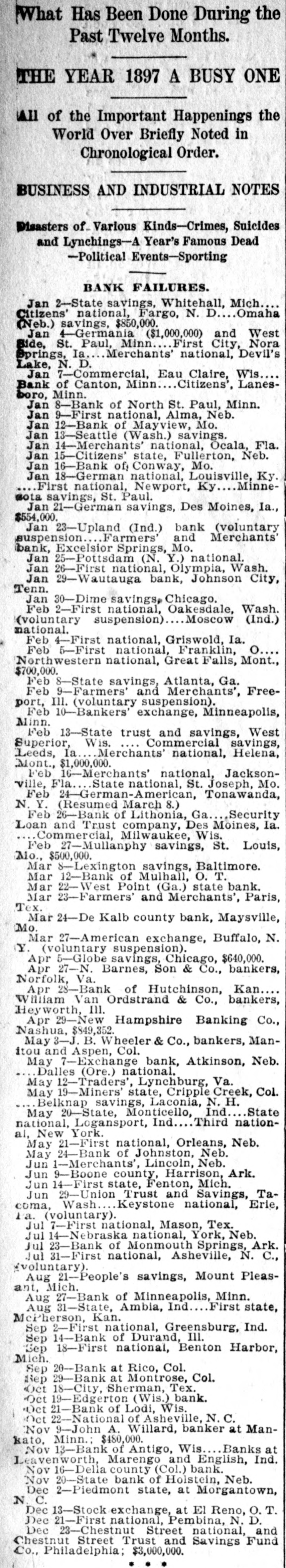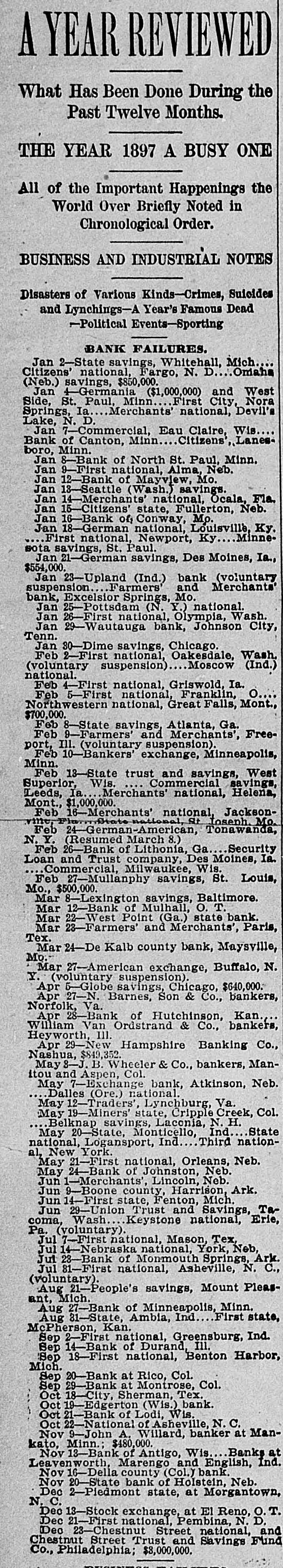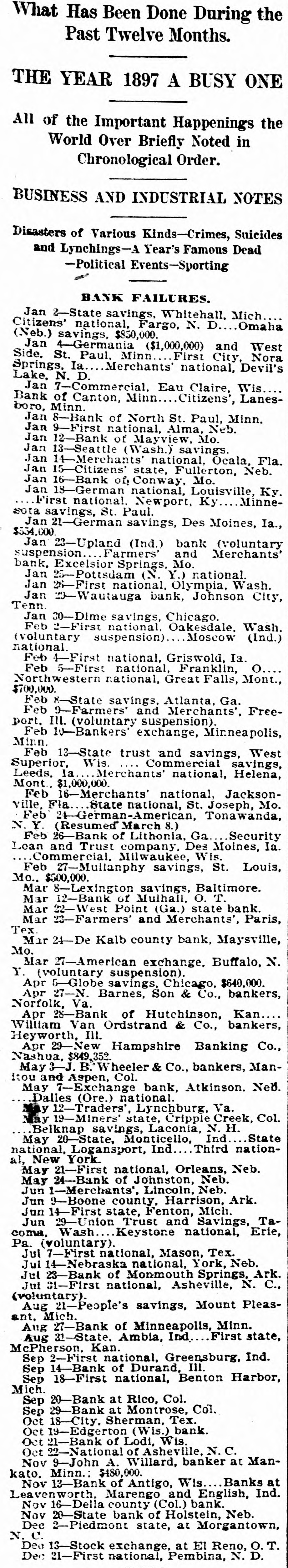 A YEAR REVIEWED What Has Been Done During the Past Twelve Months. THE YEAR 1897 A BUSY ONE All of the Important Happenings the World Over Briefly Noted in Chronological Order. BUSINESS AND INDUSTRIAL NOTES Disasters of Various Kinds-Crimes, Suicides and Lynchings-A Year's Famous Dead -Political Events-Sporting BANK FAILURES. Jan 2-State savings, Whitehall, Mich. Citizens' national, Fargo, N. D.. Omaha (Neb.) savings, $850,000. Jan 4-Germania ($1,000,000) and West Side, St. Paul, Minn. First City, Nora Springs, Ia. Merchants' national, Devil's Lake, N. D. Jan 7-Commercial, Eau Claire, Wis Bank of Canton, Minn Citizens', Lanesboro, Minn. Jan 8-Bank of North St. Paul, Minn. Jan 9-First national, Alma, Neb. Jan 12-Bank of Mayview, Mo. Jan 13-Seattle (Wash.) savings. Jan 14-Merchants' national, Ocala, Fla. Jan 15-Citizens' state, Fullerton, Neb. Jan 16-Bank of, Conway, Mo. Jan 18-German national, Louisville, Ky. First national, Newport, Ky Minnesota savings, St. Paul. Jan 21-German savings, Des Moines, Ia., $554,000. Jan 23-Upland (Ind.) bank (voluntary suspension Farmers' and Merchants' bank, Excelsior Springs, Mo. Jan 25-Pottsdam (N. Y.) national. Jan 26-First national, Olympia, Wash. Jan 29-Wautauga bank, Johnson City, Tenn. Jan 30-Dime savings, Chicago. Feb 2-First national, Oakesdale, Wash. (voluntary suspension) Moscow (Ind.) national. Feb 4-First national, Griswold, Ia. Feb 5-First national, Franklin, o Northwestern national, Great Falls, Mont., $700,000. Feb 8-State savings, Atlanta, Ga. Feb 9-Farmers' and Merchants', Freeport, Ill. (voluntary suspension). Feb 10-Bankers' exchange, Minneapolis, Minn. Feb 13-State trust and savings, West Superior, Wis. Commercial savings, Leeds, la. Merchants' national, Helena, Mont., $1,000,000. Feb 16-Merchants' national, Jacksonvine, Fla.State national, S Joseph. Mo. Feb 24-German-American, Tonawanda, N. Y. (Resumed March 8.) Feb 26-Bank of Lithonia, Ga. Security Loan and Trust company, Des Moines, Ia. Commercial, Milwaukee, Wis. Feb 27-Mullanphy savings, St. Louis, Mo., $500,000. Mar 8-Lexington savings, Baltimore. Mar 12-Bank of Mulhall, O. T. Mar 22-West Point (Ga.) state bank. Mar 28-Farmers' and Merchants', Paris, Tex. Mar 24-De Kalb county bank, Maysville, Mo.Mar 27-American exchange, Buffalo, N. Y. (voluntary suspension). Apr 5-Globe savings, Chicago, $640,000. Apr 27-N. Barnes, Son & Co., bankers, Norfolk, Va. Apr 28-Bank of Hutchinson, Kan., William Van Ordstrand & Co., bankers, Heyworth, III. Apr 29-New Hampshire Banking Co., Nashua, $849,352 May 8-J. B. Wheeler & Co., bankers, Manitou and Aspen, Col. May 7-Exchange bank, Atkinson, Neb. Dalles (Ore.) national. May 12-Traders', Lynchburg, Va. May 19-Miners state, Cripple Creek, Col. Belknap savings, Laconia, N. H. May 20-State, Monticello, Ind. State national, Logansport, Ind Third national, New York. May 21-First national, Orleans, Neb. May 24-Bank of Johnston, Neb. Jun 1-Merchants', Lincoln, Neb. Jun 9-Boone county, Harrison, Ark. Jun 14-First state, Fenton, Mich. Jun 29-Union Trust and Savings, Tacoma, Wash... Keystone national, Erie, Pa. (voluntary). Jul 7-First national, Mason, Tex, Jul 14-Nebraska national, York, Neb, Jul 28-Bank of Monmouth Springs, Ark. Jul 81-First national, Asheville, N. C., (voluntary). Aug 21-People's savings, Mount Pleasant, Mich. Aug 27-Bank of Minneapolis, Minn. First state, Aug 31-State, Ambia, Ind. McPherson, Kan. Sep 2-First national, Greensburg, Ind. Sep 14-Bank of Durand, Ill. Sep 18-First national, Benton Harbor, Mich. Sep 20-Bank at Rico, Col. Sep 29-Bank at Montrose, Col. Oct 18-City, Sherman, Tex. Oct 19-Edgerton (Wis.) bank. Oct 21-Bank of Lodi, Wis. Oct 22-National of Asheville, N. C. Nov 9-John A. Willard, banker at Mankato, Minn.; $480,000. Nov 13-Bank of Antigo, Wis. Banks at Leavenworth, Marengo and English, Ind. Nov 16-Della county (Col.) bank. Nov 20-State bank of Holstein, Neb. Dec 2-Pledmont state, at Morgantown, N. C. Dec 13-Stock exchange, at El Reno, O. T. Dec 21-First national, Pembina, N. D. Dec 23-Chestnut Street national, and Chestnut Street Trust and Savings Fund Co., Philadelphia; $8,000,000.