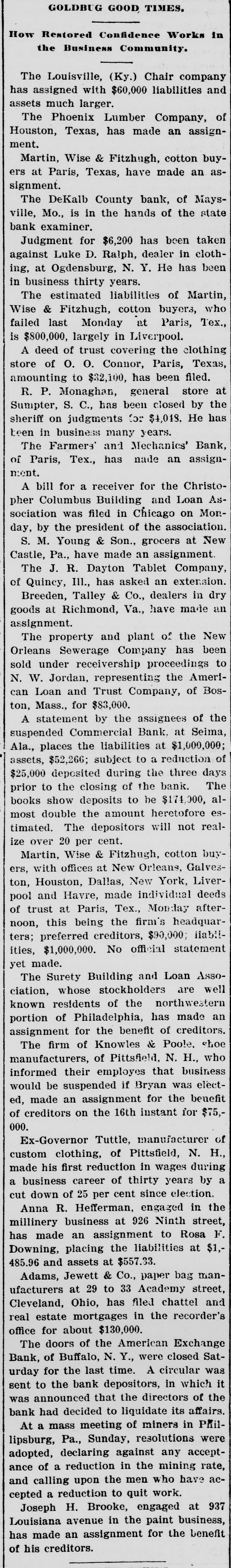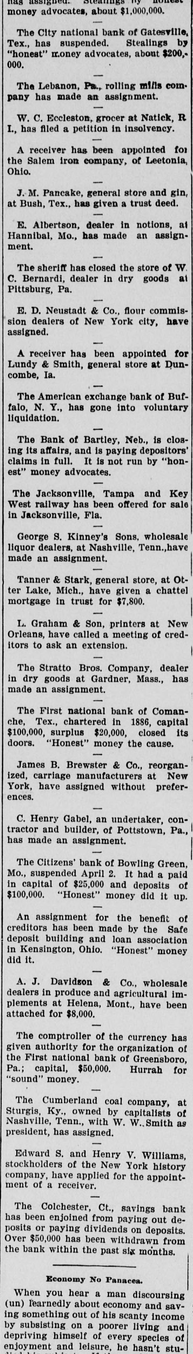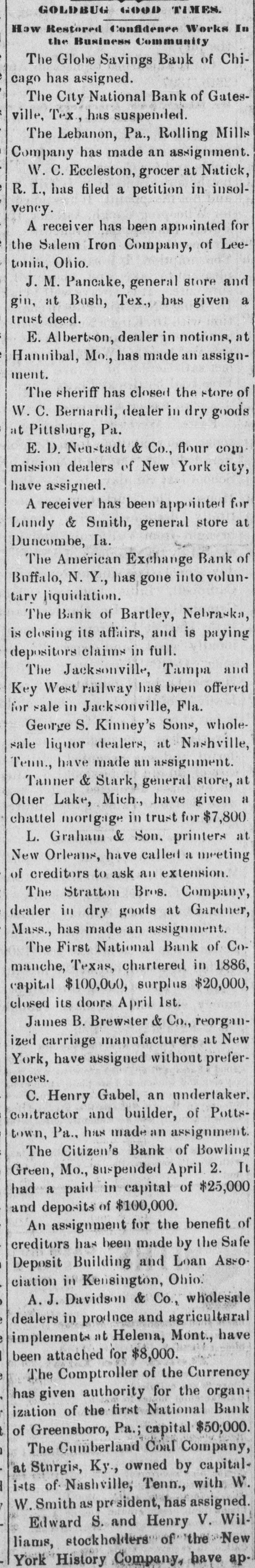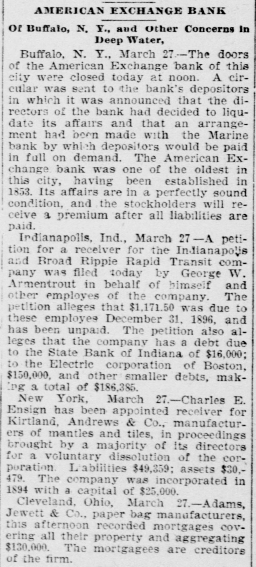 A YEAR REVIEWED What Has Been Done During the Past Twelve Months. THE YEAR 1897 A BUSY ONE All of the Important Happenings the World Over Briefly Noted in Chronological Order. BUSINESS AND INDUSTRIAL NOTES Disasters of Various Kinds-Crimes, Suicides and Lynchings-A Year's Famous Dead -Political Events-Sporting BANK FAILURES. Jan 2-State savings, Whitehall, Mich. Citizens' national, Fargo, N. D.. Omaha (Neb.) savings, $850,000. Jan 4-Germania ($1,000,000) and West Side, St. Paul, Minn. First City, Nora Springs, Ia. Merchants' national, Devil's Lake, N. D. Jan 7-Commercial, Eau Claire, Wis Bank of Canton, Minn Citizens', Lanesboro, Minn. Jan 8-Bank of North St. Paul, Minn. Jan 9-First national, Alma, Neb. Jan 12-Bank of Mayview, Mo. Jan 13-Seattle (Wash.) savings. Jan 14-Merchants' national, Ocala, Fla. Jan 15-Citizens' state, Fullerton, Neb. Jan 16-Bank of, Conway, Mo. Jan 18-German national, Louisville, Ky. First national, Newport, Ky Minnesota savings, St. Paul. Jan 21-German savings, Des Moines, Ia., $554,000. Jan 23-Upland (Ind.) bank (voluntary suspension Farmers' and Merchants' bank, Excelsior Springs, Mo. Jan 25-Pottsdam (N. Y.) national. Jan 26-First national, Olympia, Wash. Jan 29-Wautauga bank, Johnson City, Tenn. Jan 30-Dime savings, Chicago. Feb 2-First national, Oakesdale, Wash. (voluntary suspension) Moscow (Ind.) national. Feb 4-First national, Griswold, Ia. Feb 5-First national, Franklin, o Northwestern national, Great Falls, Mont., $700,000. Feb 8-State savings, Atlanta, Ga. Feb 9-Farmers' and Merchants', Freeport, Ill. (voluntary suspension). Feb 10-Bankers' exchange, Minneapolis, Minn. Feb 13-State trust and savings, West Superior, Wis. Commercial savings, Leeds, la. Merchants' national, Helena, Mont., $1,000,000. Feb 16-Merchants' national, Jacksonvine, Fla.State national, S Joseph. Mo. Feb 24-German-American, Tonawanda, N. Y. (Resumed March 8.) Feb 26-Bank of Lithonia, Ga. Security Loan and Trust company, Des Moines, Ia. Commercial, Milwaukee, Wis. Feb 27-Mullanphy savings, St. Louis, Mo., $500,000. Mar 8-Lexington savings, Baltimore. Mar 12-Bank of Mulhall, O. T. Mar 22-West Point (Ga.) state bank. Mar 28-Farmers' and Merchants', Paris, Tex. Mar 24-De Kalb county bank, Maysville, Mo.Mar 27-American exchange, Buffalo, N. Y. (voluntary suspension). Apr 5-Globe savings, Chicago, $640,000. Apr 27-N. Barnes, Son & Co., bankers, Norfolk, Va. Apr 28-Bank of Hutchinson, Kan., William Van Ordstrand & Co., bankers, Heyworth, III. Apr 29-New Hampshire Banking Co., Nashua, $849,352 May 8-J. B. Wheeler & Co., bankers, Manitou and Aspen, Col. May 7-Exchange bank, Atkinson, Neb. Dalles (Ore.) national. May 12-Traders', Lynchburg, Va. May 19-Miners state, Cripple Creek, Col. Belknap savings, Laconia, N. H. May 20-State, Monticello, Ind. State national, Logansport, Ind Third national, New York. May 21-First national, Orleans, Neb. May 24-Bank of Johnston, Neb. Jun 1-Merchants', Lincoln, Neb. Jun 9-Boone county, Harrison, Ark. Jun 14-First state, Fenton, Mich. Jun 29-Union Trust and Savings, Tacoma, Wash... Keystone national, Erie, Pa. (voluntary). Jul 7-First national, Mason, Tex, Jul 14-Nebraska national, York, Neb, Jul 28-Bank of Monmouth Springs, Ark. Jul 81-First national, Asheville, N. C., (voluntary). Aug 21-People's savings, Mount Pleasant, Mich. Aug 27-Bank of Minneapolis, Minn. First state, Aug 31-State, Ambia, Ind. McPherson, Kan. Sep 2-First national, Greensburg, Ind. Sep 14-Bank of Durand, Ill. Sep 18-First national, Benton Harbor, Mich. Sep 20-Bank at Rico, Col. Sep 29-Bank at Montrose, Col. Oct 18-City, Sherman, Tex. Oct 19-Edgerton (Wis.) bank. Oct 21-Bank of Lodi, Wis. Oct 22-National of Asheville, N. C. Nov 9-John A. Willard, banker at Mankato, Minn.; $480,000. Nov 13-Bank of Antigo, Wis. Banks at Leavenworth, Marengo and English, Ind. Nov 16-Della county (Col.) bank. Nov 20-State bank of Holstein, Neb. Dec 2-Pledmont state, at Morgantown, N. C. Dec 13-Stock exchange, at El Reno, O. T. Dec 21-First national, Pembina, N. D. Dec 23-Chestnut Street national, and Chestnut Street Trust and Savings Fund Co., Philadelphia; $8,000,000.