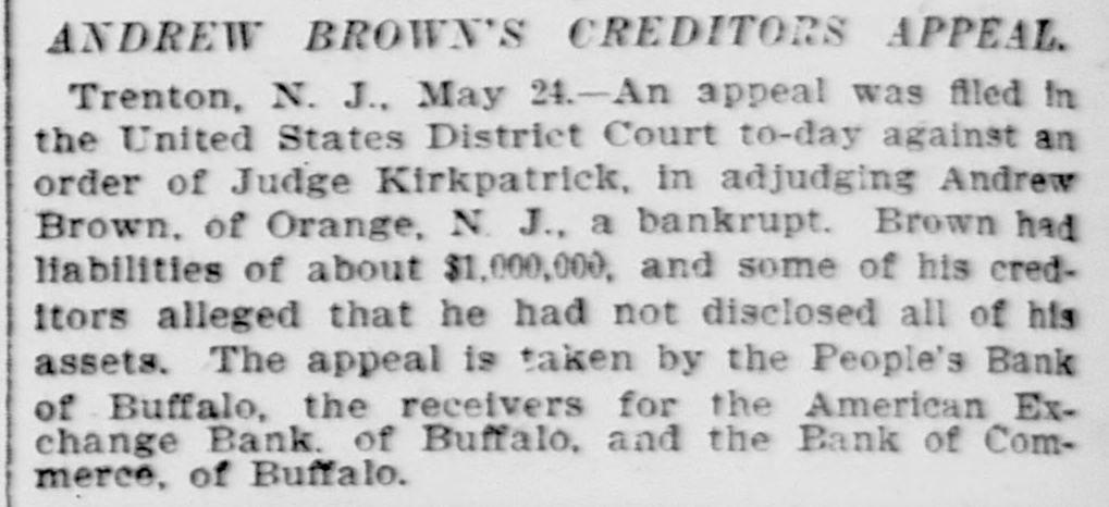 ANDREW BROWN'S CREDITORS APPEAL. Trenton, N. J., May 24.-An - appeal was filed In the United States District Court to-day against an order of Judge Kirkpatrick, in adjudging Andrew Brown. of Orange, N J., a bankrupt. Brown had liabilities of about $1,000,000. and some of his creditors alleged that he had not disclosed all of his assets. The appeal is taken by the People's Bank of Buffalo, the receivers for the American Exchange Bank. of Buffalo, and the Bank of Commerce, of Buffalo.