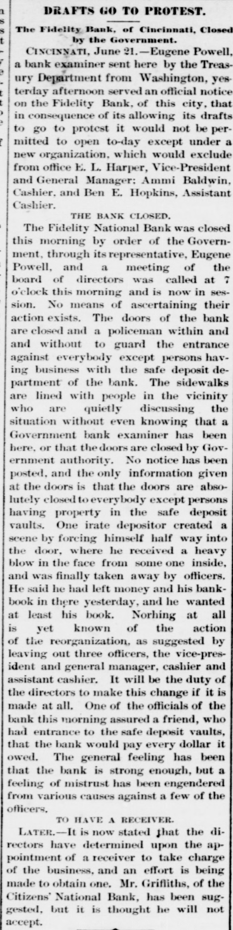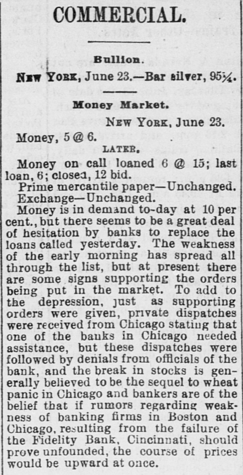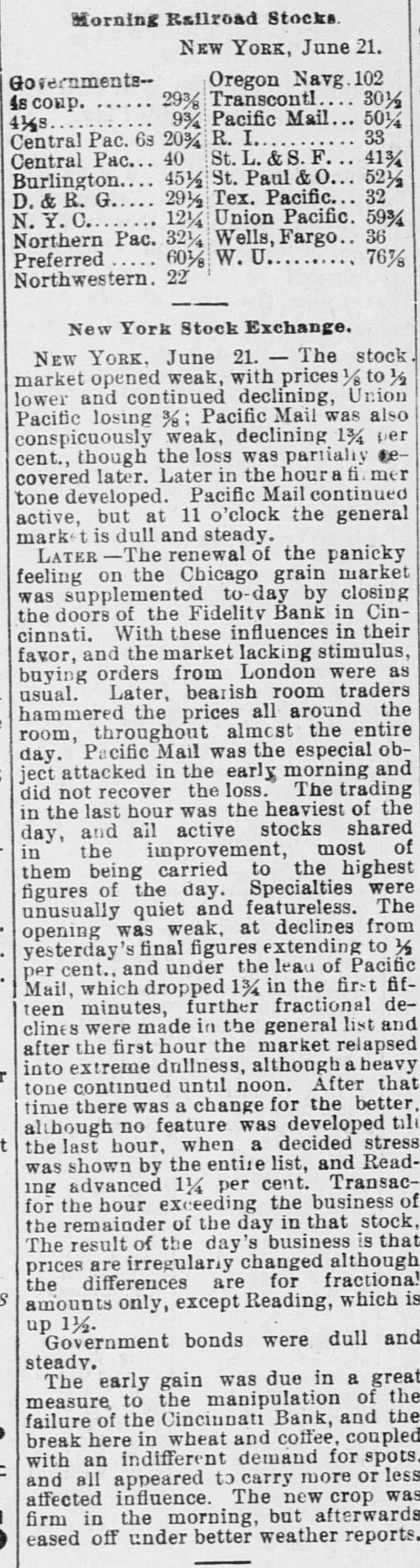 Erie Texas Pacific 396 324 East Tennessee 1314 l'enn Coal & Iron. 3814 Lake Shore Union Pacific 981/2 60% Louisville & Nash. 671/8 New Jersey Cen 804 Memphis & Char... 58 Missouri Pacific. 107 Mobile & Ohio 1396 Western nion. 7734 Cotton Seed Oil Tr.. 50 *Asked. +Bid. The renewal of panicky feeling in the Chicago market was supplemented to-day by closing the doors of the Fidelity Bank of Cincinnati. With these influences in their favor and the market lacking stimulus of moderate buy ing orders from London, usual of late, the bearish room traders hammered prices all around the room throughout almost the entire day Trading, which was dull and feverish. was more purely local than has been seen for some time. Late in the day advices were received that the Fidelity Bank would resume business shortly, and coal stocks, aided by the advance in price of coal in Philadelphia, led to a general recovery, buying of Reading being especially heavy in the last hour. Pacific Mail was special object of attack in the early morning, and did not recover the loss. Trading in the last hour was the heaviest of the day. and all the active stocks shared in the improvement, most of them being carried to the heaviest figures of the day. Specialties were unusually quiet and featureless. The opening was weak at declines from yes. terday final figures, ading to one-half per cent, and under the lead of Pacific Mail, which dropped 14 in the first fifteen minutes, further fractional declines were made in the general list. After the first half hour the market relapsed into extreme dullness, although a heavy tone continued until noon. After that time there was a change for the better in tone and speculation, although no feature was developed until the last hour, when decided strength was shown by the entire list, and Reading vanced 11/4 per cent. Total sales were 196,000 shares. Net result of the day's business is that prices are irregularly changed, although the differences are for fractional amounts only, except for Reading, which is up 11/2 per cent. Cotton. NEW YORK. June Greene & Co's report on cotton futures says "It has beena feverish market all day, and while cost on the old erop ranged to 10 points at times the advance was not maintained, and the early gain was due in great measure to manipulation on the part of the "bull" combination, through which local scalpers on the "short" side were induced to cover, but during the afternoon buy ers became scarce and there was a reactionary feeling. There was failure of a Cincinnati bank and the break here in wheat and coffee, coupled with the indifferent demand for spots, all appeared to earry more or less reflected influence. The erop was firm in the morning. but afterward eased somewhat under better weather reports. Afternoon report Cotton Net and gross reeipts, 3,035. Futuresclosed steadp; sales, 11 Jnue, 10 76@10 78 July 10 78 August, 10 83 @ 10 84; September, 10 45@10 46 October, 10 02 @10 03 November. 9 85@9 86 December, 9 84@9 85; January, 9 89@9 90 February, 9 96 @997; March, 1003@ 10 04; April 10 11@10 Cotton quiet; sales today 163 Middling Uplands, 11; Orleans 11 3-16; net receipts, 324; exports to Great Britain 669; to the Continent, 1,117; stock, 297,581. GALVESTON, June 21. Cotton nominal: middling, 10 9-16; net receipts, gross, -; sales, 67: stock, 5,739; exports coastwise, NORFOLK, June 31. Cotton quiet: middling. 11: net receipts, 3 gross receipts, 3: sales, stock, 3,048; exports coastwise, 38. BALTIMORE, June 21. Cotton firm mid dling, 11% net receipts, gross, sales, stock, 3,254; exports to Creat Britain, coastwise, BOSTON, June 21. Cotton quiet middling, 11Β½; net receipts, 86; gross receipts, 340 sales, none; stock, exports to Great Britain, WILMINGTON, June 21. Cotton firm middling, 11 net receipts, 2: gross receipts, : sales, none; stock, 1,603; exports coastwise PHILADELPHIA, June 21. Cotton quiet: middling, 11%; net receipts, gross receipts, stock, 13,875; exports to Great Britain, SAVANNAH, June 21. Cotton firm middling, 10% net receipts, 28; gross, 28 sales, : stock, 3,229; exports coastwise, NEW ORLEANS, June 21. Cotton dull middling, 10 11-16; net receipts 181; gross receipts, 181: sales, 750; stock, 89,030; exports to Great Britain, to the Continent, coastwise, none. MOBILE, June 21.- Cotton easy; middling, 1034: net receipts, 2: gross receipts, = sales, i stock, 382: exports coastwise, MEMPHIS, June 21. Cotton quiet middling, 104 net receipts, 63; gross receipts, 64; shipments, 125; stock,"8,190. AUGUSTA, June 21. Cotton quiet; middling, 10 15 16; net receipts, 10; gross receipts, sales, CHARLESTON. June 21. Cotton quiet but firm middling, 10%; net receipts, = gross receipts, 2: sales. stock, 724; exports coastwise, General Markets. CHICAGO, June 31.-An oppressively weak feeling prevailed in wheat at the opening, and traders were feeling decidedly blue July opened 3/4e lower at 69%, but some little effort was made to sustain the market, and a few minutes later July was selling at 69%c. The support was only temporary, however, and bank wheat being put on the market, July soon reacted to 69%, around which figure it held steady during the first hour of the session. At the end of that time "tailers" found they had sold themselves short, and began to cover, and July went up to 70% under this influence. Marketing bank wheat again caused July to ease back to 60% There was no let up in sales of wheat for account of banks to-day, and realizing continued straight up to the close of the session. The effect of the general selling was to break wheat from 6916 to 6834 for July, the latter figure being reacted about noon at bottom price. There were many good buying orders, and the reaction sent the price of July up to 69%, at which the morning session closed. Heavy exports from seaboard and covering by short interest made the afternoon market stronger. July sold up to 70% and closed at 20. Fluctuations in June were not very marked. It opened at 68% and 69. 