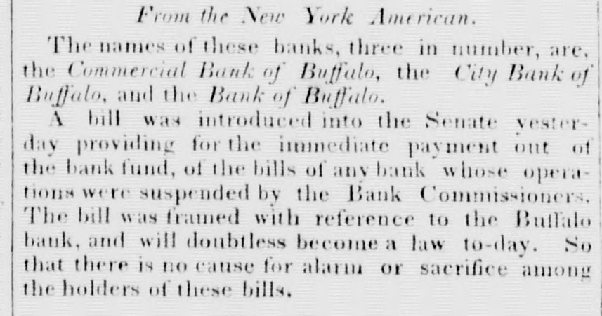 From the New York American. The names of these banks, three in number, are, the Commercial Bank of Buffulo, the City Bank of Buffalo, and the Bank of Buffalo. A bill was introduced into the Senate vesterday providing for the immediate payment out of the bank fund, of the bills of any bank whose operations were suspended by the Bank Commissioners. The bill was framed with reference to the Buffalo bank, and will doubtless become a law to-day. So that there is no cause for alarm or sacrifice among the holders of these bills.