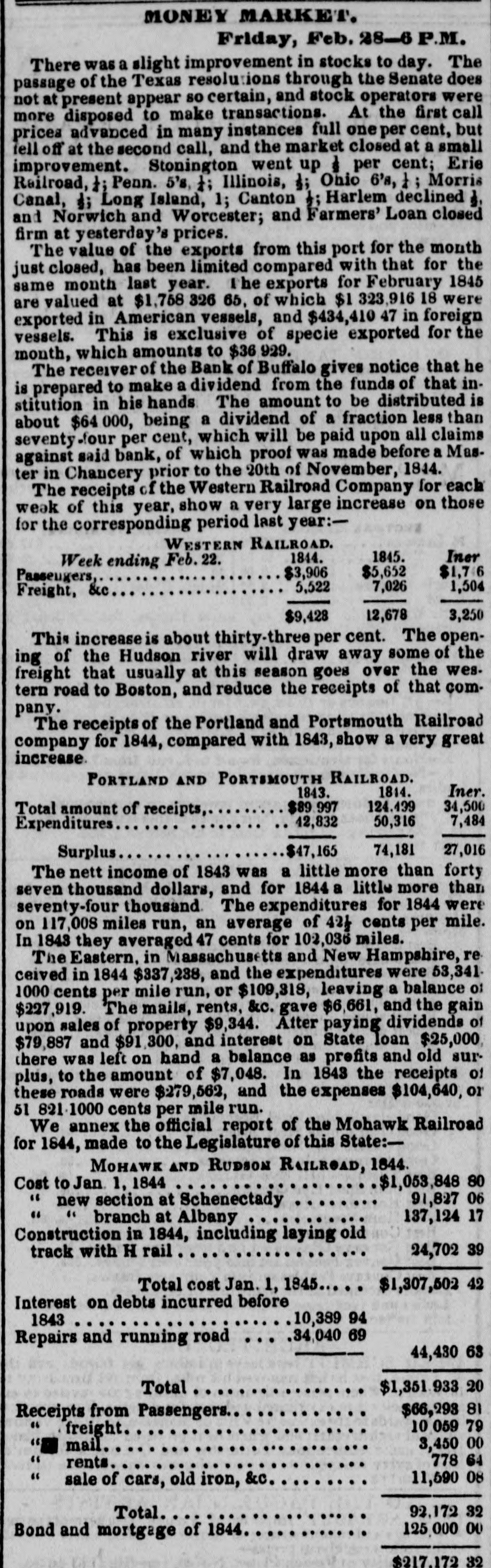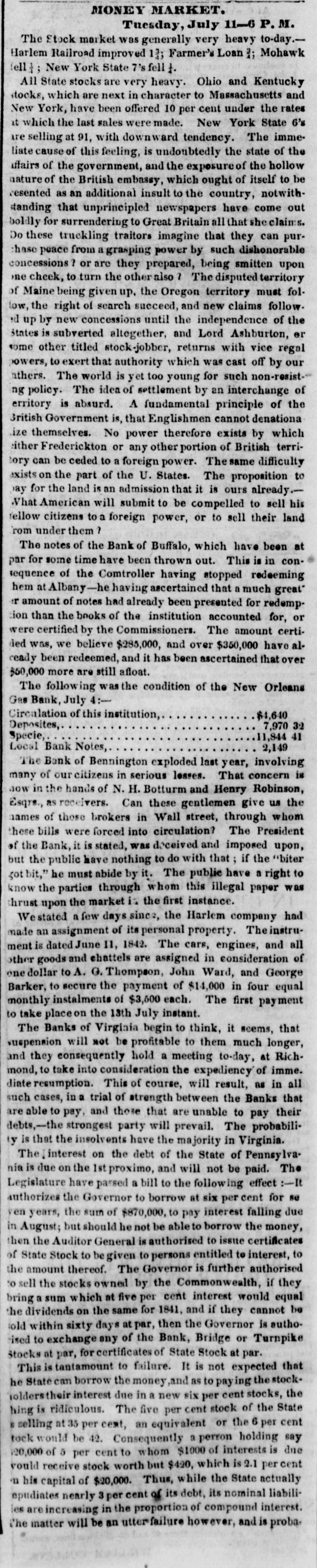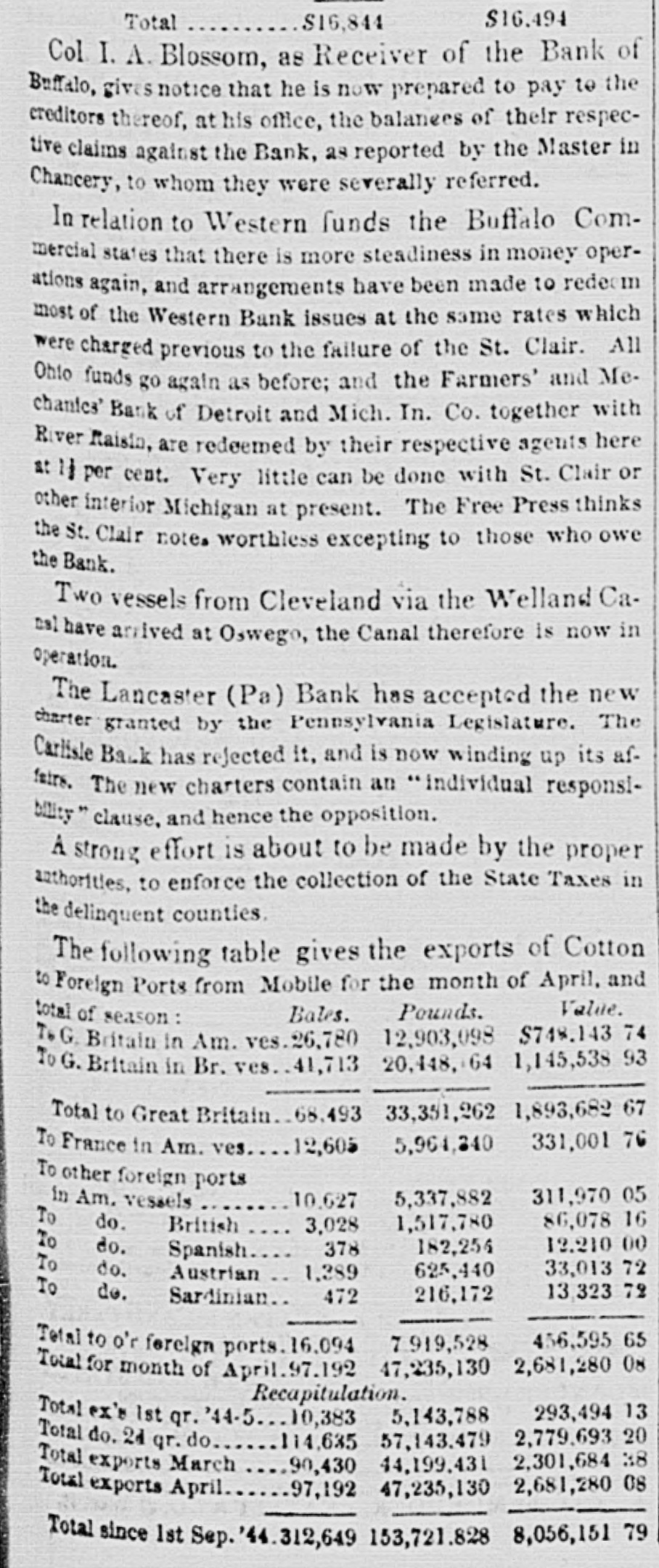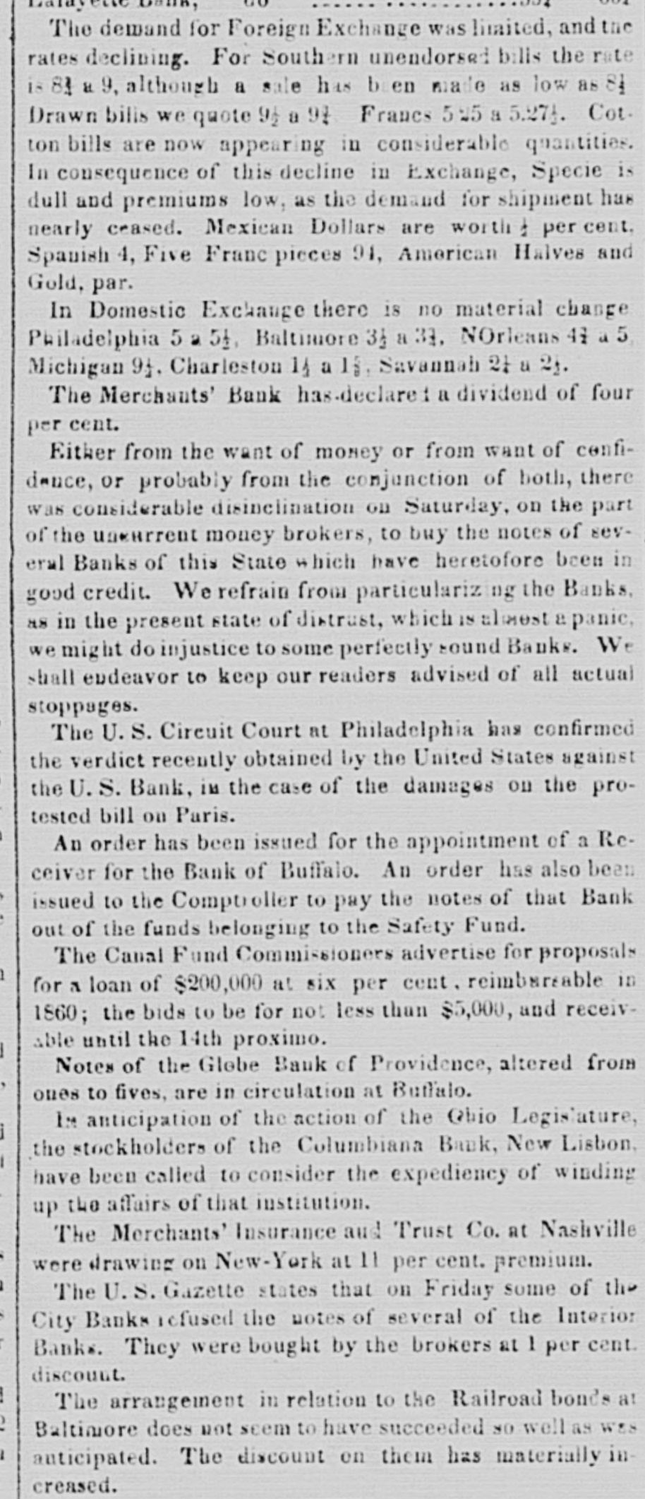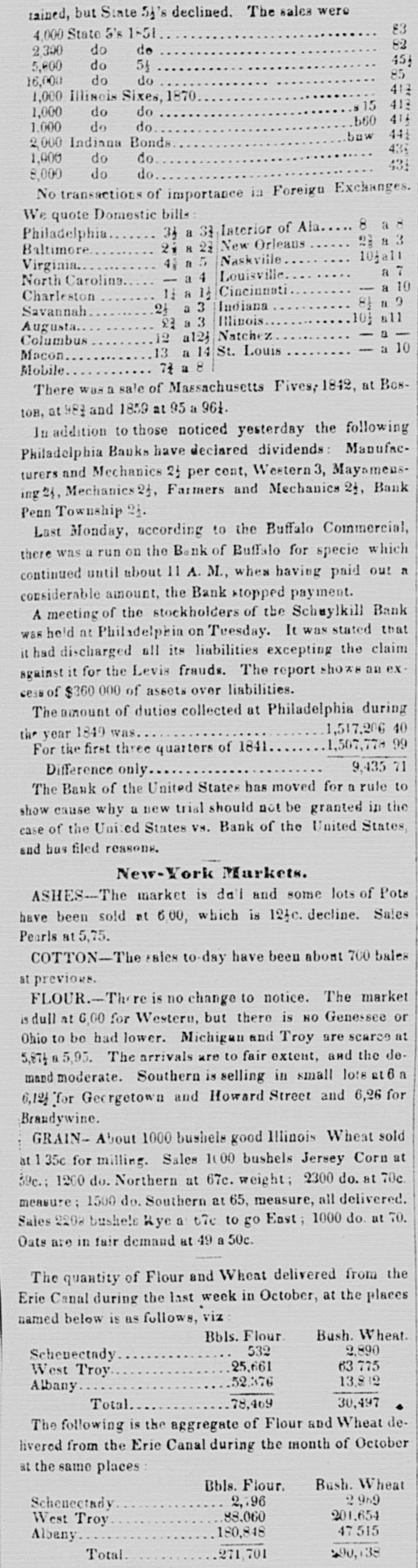 tained, but State 51's declined. The sales were 83 4,000 State 5's 1-51 82 2,300 do de 45 5,000 do 51 85 16,000 do do 413 1,000 Illinois Sixes, 1870 413 15 1,000 do do 414 660 1.000 do do 441 bow 2,000 Indiana Bonds 433 1,000 do do 431 8,000 do do No transactions of importance in Foreign Exchanges. We quote Domestic bills 8 a 8 Interior of Ala 34 a 33 Philadelphia 23 a 3 New Orleans 21 a 23 Baltimore 10gall Naskville 4 a 5 Virginia. a 7 Louisville - 4 North Carolina - a 10 Cincinnati 11 a 1) Charleston 8} I Indiana 2f 3 Savannah 10 all Illinois 23 3 Augusta - a Natchez 12 a12) Columbus - a 10 St. Louis 13 a 14 Macon 74 a 8 Mobile There was a sale of Massachusetts Fives; 1842, at Bos108, at 983 and 1859 at 95 a 961. In addition to those noticed yesterday the following Philadelphia Bauks have declared dividends Manufacturers and Mechanics 21 per cent, Western 3, Mayamensing21, Mechanics 21, Farmers and Mechanics 21, Bank Penn Township 21. Last Monday, according to the Buffalo Commercial, there was a run on the Bank of Buffalo for specie which continued until about 11 A. M., when having paid out a considerable amount, the Bank >topped payment. A meeting of the stockholders of the Schuylkill Bank W&R held at Philadelphia on Tuesday. It was stated that it had discharged all its liabilities excepting the claim against it for the Levis frauds. The report shows an excess of $360 000 of assets over liabilities. The amount of duties collected at Philadelphia during 1,517,206 40 the year 1840 was 1,507,778 99 For the first three quarters of 1841 9,435 71 Difference only The Bank of the United States has moved for a rule to show cause why a new trial should not be granted in the case of the United States Vs. Bank of the United States, and has filed reasons. New-York Markets. ASHES-The market is dal and some lots of Pots have been sold at 6,00, which is 123c. decline. Sales Pearls at 5,75. COTTON- sales to-day have been about 700 bales at previous. FLOUR.- Ther is no change to notice. The market is dull at 6,00 for Western, but there is NO Genessee or Ohio to be had lower. Michigan and Troy are scarce at 5,87 5,95. The arrivals are to fair extent, and the demand moderate. Southern is selling in small lote at 6 a 6,12 for Georgetown and Howard Street and 6,26 for Braudywine. GRAIN- About 1000 bushels good Illinois Wheat sold at 1 35c for milling. Sales 1000 bushels Jersey Corn at 59c.; 1200 do. Northern at 67c. weight; 2300 do. at 70c. measure; 1500 do. Southern at 65, measure, all delivered. Sales 2208 bushels Kye a 67c to go East 1000 do. at 70. Oats are in fair demand at 49 a 50c. The quantity of Flour and Wheat delivered from the Eric Canal during the last week in October, at the places named below is as follows, viz Bush. Wheat. Bbls. Flour 2.890 532 Schewectudy 63 775 25,661 West Troy 52.376 13,812 Albany 30,497 Total 78,469 The following is the aggregate of Flour and Wheat delivered from the Eric Canal during the month of October at the same places Bush. Wheat Bbls. Flour. 2969 2,:96 Schenectady 201.654 88.060 West Troy 47515 180,848 Albany $90,138 Total 271,701