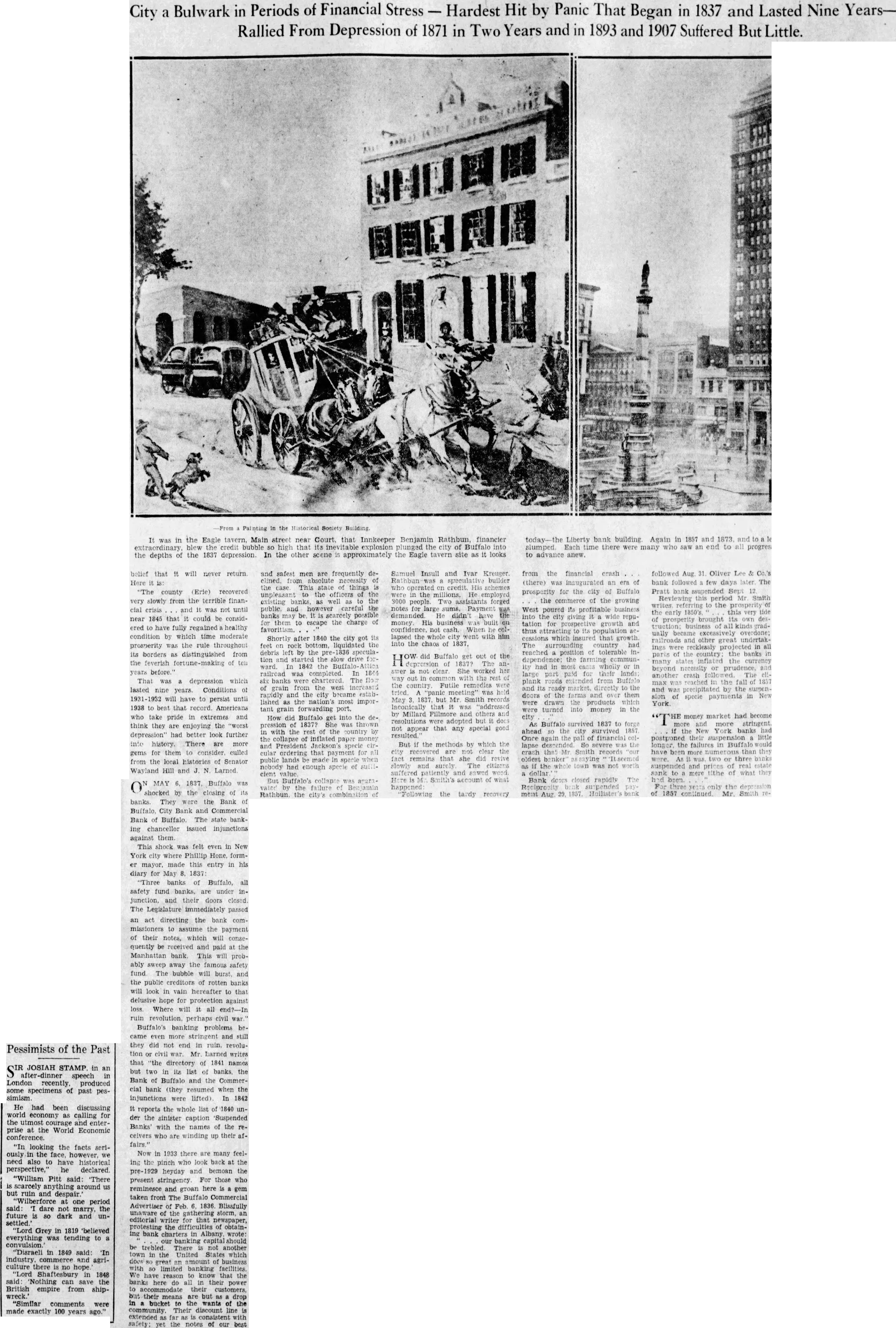 HOW BUFFALO CONQUERED HARD TIMES By MONTGOMERY CURTIS TEADILY prices went down. down, down. Failure, bankruptcy and disaster were the order of the day. Banks failed everywhere. As speculation had probably reached its climax in Buffalo so there the universal reaction was more strongly felt. Fortunes disappeared almost in a night. Mortgages were foreclosed on every hand Does that sound like a concentrated version of Buffalo's post-1929 commercial record? For those citizens who take perverted pride in bragging about the current distress as the "world's worst depression" it will be rude shock to learn that the paragraph above is summary of Buffalo business in 1837. Three times, 1837, 1857 and 1871, Buffalo bent double under the burden of economic collapse. She remained in that painful position for several years each time. Then the city straightened up to advance surely into new and prosperous eras Those souls who writhe in the certainty of utter doom should look to the records. Depressions do have mysterious way of disappearing impossible as it may seem to some And the period which began late in 1929 belongs in the same pigeonhole with 1837, 1857 and 1871. The city suffered its share of the national doldrums in 1893 and again in 1907 but the comparative brevity of those disturbed periods forbids comparison with their predecessors. That history has pleasant habit of repeating itself is proven by a study of H. Perry Smith's "History of Buffalo and Erie County, Mr. Smith, who wrote the quoted paragraph above. faithfully recorded Buffalo's descent, survival and rise in three major depressions In scholarly fashion he revelled in 1837. Here are some more paragraphs from the record to compare with 1929. "In the disastrous financial revulsion and panic which swept the country in 1835-1836, Buffalo suffered as severely as most places similar in size and character. The inhabitants had raised themselves and their city to high financial and speculative altitude. and the fall was proportionately destructive the city recovered from the horrors of the cholera epidemic of 1832. and from the destructive fire only to plunge into the abyes of financial ruin. "THE year 1836 dawned with prospects of brilliant promise. with dazzling visions of easilyacquired wealth it closed under cloud of almost universal bank"Fortunes disappeared more rapidly than they had been acquired: mortgages were foreclosed on all sides and land that had been eagerly bought at $30 or $40 per foot would scarcely bring as much per acre. Land is known in the city which sold early in 1835 at $2 foot-about $500 an acre. It was sold and resold in parcels during the excitement. until 12 months after it sold at the rate of $10,000 an acre. In 1865 the same land was worth $18 foot." For those who might dismiss that panic as victimizing speculators only, Mr. Smith extends his remarks: "Even in the country towns the reaction produced great distress and some who had deemed themselves rich suffered for the necessaries of life. "In the course of 1837. matters probably got about as bad as they could be, so that after that they did not grow any worse: but was several years before there was any sensible recovery from the Hard Times' as that era was universally called. Unquestionably the designation was a correct one: for never has the country, and especially this part of it, known so disastrous financial Such is what Mr. Smith called "the great wreck of 1837." Then ne wrote paragraph unintentionally but nonetheless specifically directed at the mourners who now weep at the bier of prosperity in the gloomy City a Bulwark in Periods of Financial Stress - Hardest Hit by Panic That Began in 1837 and Lasted Nine Years— Rallied From Depression of 1871 in Two Years and in 1893 and 1907 Suffered But Little. belief that it will never return. Here "The county (Erie) recovered very slowly from the terrible financial crisis and it was not until near 1845 that it could be considered to have fully regained healthy condition by which time moderate prosperity was the rule throughout its borders as distinguished from the feverish fortune-making of ten years before That was a depression which lasted nine years. Conditions of 1931-1932 will have to persist until 1938 to beat that record Americans who take pride in extremes and think they are enjoying the "worst depression" had better look further into history. There are more gems for them to consider, culled from the local histories of Senator Wayland Hill and J. N. Larned MAY 6, 1837, Buffalo was shocked by the closing of its banks. They were the Bank of Buffalo, City Bank and Commercial Bank of Buffalo. The state banking chancellor issued injunctions against them. This shock was felt even in New York city where Phillip Hone. former mayor, made this entry in his diary for May 8. 1837 "Three banks of Buffalo, all safety fund banks are under injunction, and their doors closed. The Legislature immediately passed an act directing the bank commissioners to assume the payment of their notes, which will consequently be received and paid at the Manhattan bank. This will probably sweep away the famous safety fund The bubble will burst, and the public creditors of rotten banks will look in vain hereafter to that delusive hope for protection against loss. Where will it all end?-In ruin revolution, perhaps civil war." Buffalo's banking problems became even more stringent and still they did not end in ruin. revolution or civil war. Mr Larned writes that "the directory of 1841 names but two in its list of banks, the Bank of Buffalo and the Commercial bank (they resumed when the injunctions were lifted). In 1842 it reports the whole list of 1840 under the sinister caption Suspended Banks' with the names of the receivers who are winding up their affairs." Now in 1933 there are many feeling the pinch who look back at the pre-1929 heyday and bemoan the present stringency. For those who reminesce and groan here is gem taken from The Buffalo