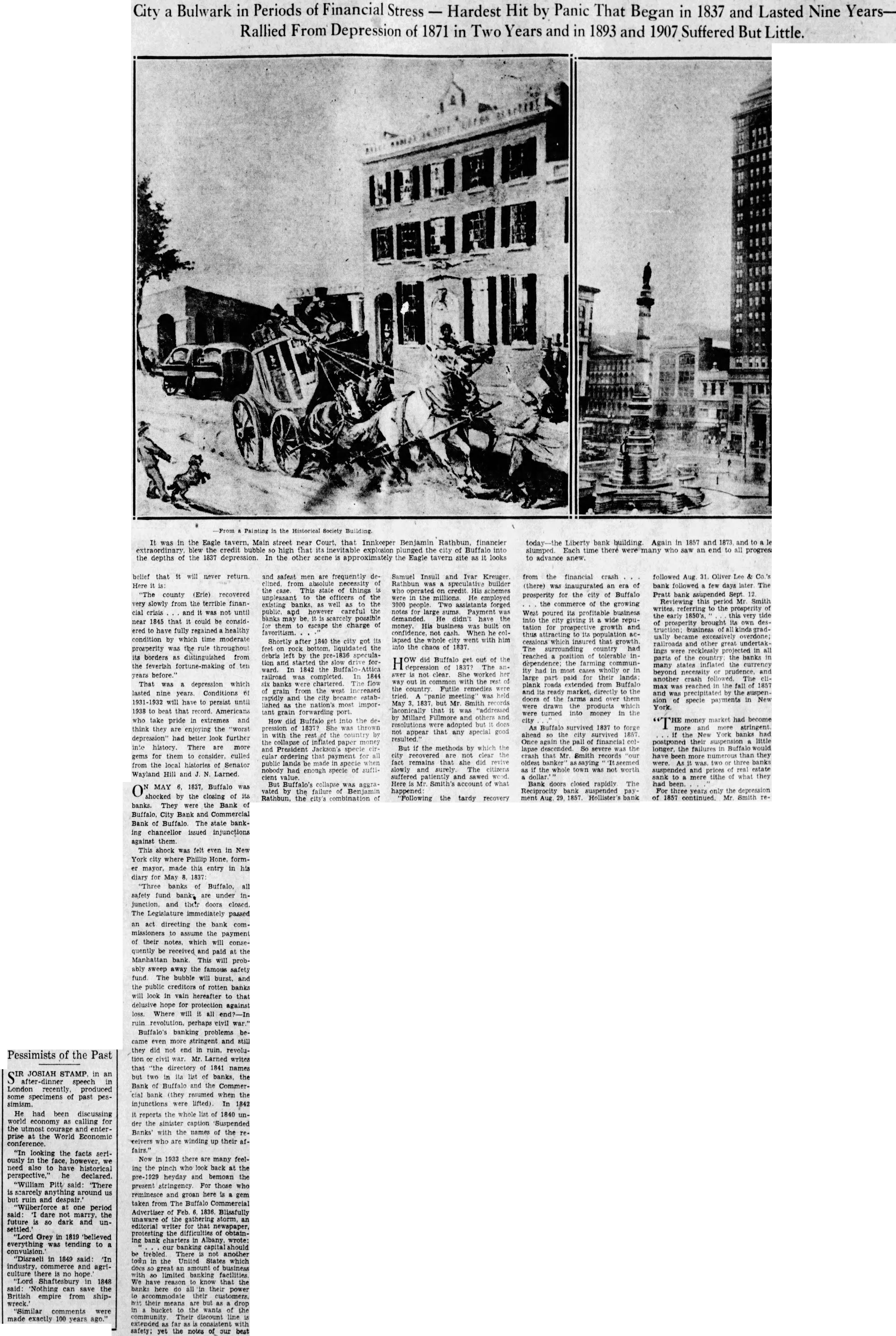 Pessimists of the Past OIR JOSIAH STAMP in an after-dinner speech in London recently. produced some specimens of past pessimism. He had been discussing world economy as calling for the utmost courage and enterprise at the World Economic conference. "In looking the facts seriously in the face, however, we need also to have historical perspective,' he declared. "William Pitt said: "There is scarcely anything around us but ruin and despair.' 'Wilberforce at one period said: dare not marry. the future is so dark and unsettled.' "Lord Grey in 1819 'believed everything was tending to a convulsion. "Disraeli in 1849 said: 'In industry. commerce and agriculture there no hope. "Lord Shaftesbury in 1848 said: "Nothing can save the British empire from ship"Similar comments were made exactly 100 years ago." City a Bulwark in Periods of Financial Stress - Hardest Hit by Panic That Began in 1837 and Lasted Nine YearsRallied From Depression of 1871 in Two Years and in 1893 and 1907 Suffered But Little. belief that it will never return. Here is: "The county (Erie) recovered very slowly from the terrible financial crisis and it was not until near 1845 that it could be considered to have fully regained healthy condition by which time moderate prosperity was the rule throughout its borders as distinguished from the feverish fortune-making of ten years before. That was a depression which lasted nine years. Conditions of 1931-1932 will have to persist until 1938 to beat that record. Americans who take pride in extremes and think they are enjoying the "worst depression" had better look further into history. There are more gems for them to consider. culled from the local histories of Senator Wayland Hill and J. N. Larned. MAY 6, 1837, Buffalo was shocked by the closing of its banks. They were the Bank of Buffalo, City Bank and Commercial Bank of Buffalo. The state banking chancellor issued injunctions against them. This shock was felt even in New York city where Phillip Hone, former mayor, made this entry in his diary for May 8, 1837 "Three banks of Buffalo, all safety fund bank are under injunction, and their doors closed. The Legislature immediately passed an act directing the bank commissioners to assume the payment of their notes. which will consequently be received and paid at the Manhattan bank. This will probably sweep away the famous safety fund The bubble will burst, and the public creditors of rotten banks will look in vain hereafter to that delusive hope for protection against loss. Where will it all end?-In ruin revolution perhaps civil war." Buffalo's banking problems became even more stringent and still they did not end in ruin, revolution or civil war. Mr. Larned writes that "the directory of 1841 names but two in its list of banks, the Bank of Buffalo and the Commercial bank (they resumed when the injunctions were lifted). In 1842 it reports the whole list of 1840 under the sinister caption Suspended Banks' with the names of the rereivers who are winding up their affairs." Now in 1933 there are many feeling the pinch who look back at the pre-1929 heyday and bemoan the present stringency. For those who reminesce and groan here is gem taken from The Buffalo Commercial Advertiser of Feb. 1836. Blissfully unaware the gathering storm, an editorial writer for that newspaper, protesting the difficulties of obtaining bank charters in Albany, wrote: our banking capital should be trebled There not another town in the United States which does so great amount of business with 80 limited banking facilities We reason to know that the banks here do all in their power to accommodate their customers. hut their means are but as drop in bucket wants of the community Their discount line is extended as far as consistent with safety; yet the notes of our best and safest men are frequently declined from absolute necessity of the case This state of things is unpleasant to the officers of the existing banks. as well as to the public and careful the banks may be possible for them to escape the charge of favoritism. Shortly after 1840 the city got its feet rock bottom. liquidated the debris left by the pre-1836 speculation and started the slow drive forward. In 1842 the Buffalo- Attica railroad was completed. In 1844 six banks were chartered. The flow of grain from the west increased rapidly and the city became established as the nation's most important grain forwarding port. How did Buffalo get into the depression of 1837? She was thrown in with the rest of the country by the collapse of inflated paper money and President Jackson's specie circular ordering that payment for all public lands made specie when nobody had enough specie of sufficient But Buffalo's collapse was aggra. vated by the failure of Benjamin Rathbun, the city's combination of Samuel Insull and Ivar Kreuger. Rathbun was speculative builder who operated on credit His schemes were in the millions He employed 3000 people Two assistants forged notes for large sums Payment was demanded He didn't have the money. His business was built on confidence. not cash. When he collapsed the whole city went with him into the chaos of 1837. OW did Buffalo get out of the depression 1837? The answer not She worked her way out in common with the rest of the country Futile remedies were tried. "panic meeting' was held May 1837. but Mr. Smith records laconically that it was "addressed by Millard Fillmore and others and resolutions were adopted but does not appear that any special good resulted. But if the methods by which the city recovered are not clear fact remains that she did revive slowly and surely. The citizens suffered patiently and sawed wood. Here is Mr. Smith's account of what happened Following the tardy recovery from the financial crash (there) was inaugurated an era of prosperity for the city of Buffalo the commerce of the growing West poured its profitable business into the city giving it wide reputation for prospective growth and thus to its population acwhic