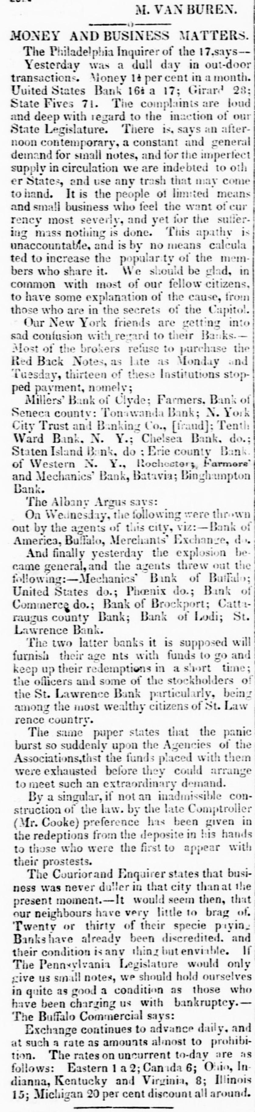 M. VAN BUREN. MONEY AND BUSINESS MATTERS. The Philadelphia Inquirer of the 17,says-Yesterday was a dull day in out-door transactions. Money 14 per cent in a month. United States Bank 16: a 17; Girard 28: State Fives 71. The complaints are loud and deep with regard to the inaction of our State Legislature. There is, says an afternoon contemporary, a constant and general demand for small notes, and for the imperfect supply in circulation we are indebted to oth er States, and use any trash that may come to hand. It is the people of limited means and small business who feel the want of cur rency most severly, and yet for the suffering mass nothing is done. This apathy is unaccountable, and is by no means calcula ted to increase the popular ty of the members who share it. We should be glad, in common with most of our fellow citizens, to have some explanation of the cause, from those who are in the secrets of the Capitol. Our New York friends are getting into sad confusion with regard to their Banks.Most of the brokers refuse to purchase the Red Back Notes, as late as Monday and Tuesday, thirteen of these Institutions stopped payment, nomely; Millers' Bank of Clyde; Farmers. Bank of Seneca county: Tonawanda Bank; N. York City Trust and Banking Co., [fraud]; Tenth Ward Bank. N. Y.; Chelsea Bank. do.: Staten Island Bank, do : Erie county Bank of Western N. Y., Rochester; Farmers' and Mechanics' Bank, Batavia; Binghampton Bank. The Albany Argus savs: On Wednesday, the following were thrown out by the agents of this city, viz:-Bank of America, Buffalo, Merchants' Exchange, do. And finally yesterday the explosion became general,and the agents threw out the following:-Mechanics' Bank of Buffalo; of United States do.; Phoenix do.; Bank Commerce do.; Bank of Brockport; Catteraugus county Bank; Bank of Lodi; St. Lawrence Bank. The two latter banks it is supposed will furnish their age nts with funds to go and keep up their redemptions in a short time; the officers and some of the stockholders of the St. Lawrence Bank particularly, being among the most wealthy citizens of St. Law rence country. The same puper states that the panic burst so suddenly upon the Agencies of the Associations,thst the funds placed with them were exhausted before they could arrange to meet such an extraordinary demand. By a singular, if not an inadmissible construction of the law. by the late Comptroller r. Cooke) preference has been given in the redeptions from the deposite in his hands to those who were the first to appear with their prostests. The Couriorand Enquirer states that business was never duller in that city than at the present moment.--It would seem then, that our neighbours have very little to brag of. Twenty or thirty of their specie paying Bankshave already been discredited. and their condition is any thing but enviable. If The Pennsylvania Legislature would only give us small notes, we should hold ourselves in quite as good a condition as those who have been charging us with bankruptcy.The Buffalo Commercial says: Exchange continues to advance daily. and at such a rate as amounts almost to prohibition. The rates on uncurrent to-day are as follows: Eastern 1 a 2; Can da 6; Ohio, In dianna, Kentucky and Virginia, 8; Illinois 15; Michigan 20 per cent discount all around.