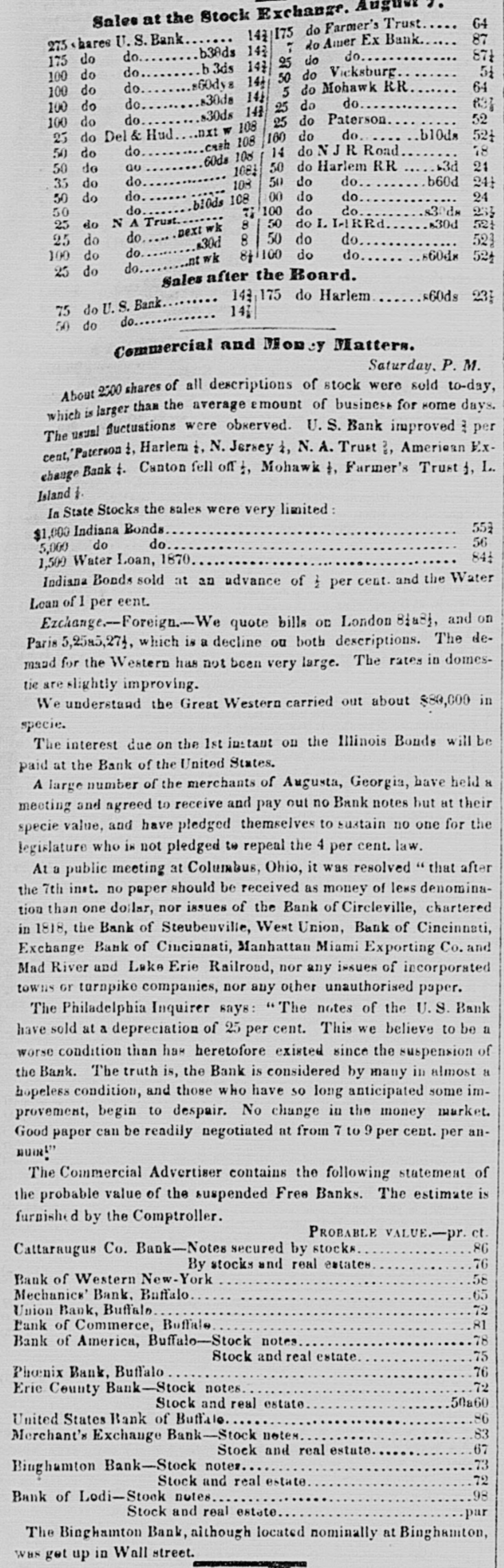 .. Sales at the Stock Exchange. August 64 142 175 do Farmer's Trust 87 275 hares U. S. Bank 7 do Amer Ex Bank b30ds 143 do 871 do 175 do do 25 147 b 3ds do 51 100 do 14 50 do Vicksburg $60dys 64 do 5 do Mohawk RR 100 do 14) 30da 631 100 do do 30ds 143 25 do do 52 25 do Paterson 100 do do 108 b10ds 524 25 do Del & Hud nxt cash 108 160 do do 18 14 do NJR Road 50 do do 108 60ds 21 33 50 do Harlem RR 50 do GO 1081 do do b60d 50 24) 35 do do 108 do 24 00 do do 50 do b10ds 108 do s30ds 50 233 it 100 do do 50 do I. I-RRd 8 25 do N A Trust 30d 521 wk next do 50 do do do 8 25 523 30d do 100 do do 81 100 do 660dx 524 wk .nt 25 do do Sales after the Board. 143 175 do Harlem <60ds 23) 75 do U. S. Bank 141 50 do do Commercial and Money Matters. Saturday. P. M. About 2500 shares of all descriptions of stock were sold to-day, which is larger than the average amount of business for some days. The usual fluctuations were observed. U.S. Bank improved are per cent, Paterson 1, Harlem 1. N. Jersey 1, N. A. Trust 3, Ameriean Exchange Bank Canton fell off 1, Mohawk 1. Farmer's Trust 1, I. Island i. In State Stocks the sales were very limited: 553 $1,000 Indiana Bonds 56 5,000 do do 841 1,500 Water Loan, 1870 Indiana Bonds sold at an advance of 123 per cent. and the Water Loan of 1 per cent. Ezchange.--Foreign.-We quote bills OC London 81a81, and on Paris 5,25a5,271, which is a decline ou both descriptions. The demaad for the Western has not been very large. The rates in domestie are slightly improving. We understand the Great Western carried out about $80,000 in specie. The interest due on the 1st instant on the Illinois Bonds will be paid at the Bank of the United States. A large number of the merchants of Augusta, Georgia, have held a meeting and agreed to receive and pay out no Bank notes but at their specie value, and have pledged themselves to sustain no one for the legislature who is not pledged to repeal the 4 per cent. law. At a public meeting at Columbus, Ohio, it was resolved "that after the 7th inst. no paper should be received as money of lews denomination than one dollar, nor issues of the Bank of Circleville, chartered in 1818, the Bank of Steubenville, West Union, Bank of Cincinnati, Exchange Bank of Cincinnati, Manhattan Miami Exporting Co. and Mad River and Lake Erie Railroad, nor any issues of incorporated towns or turnpike companies, nor any other unauthorised paper. The Philadelphia Inquirer says: "The notes of the U.S. Bank have sold at a depreciation of 25 per cent. This we believe to be a worse condition than has heretofore existed since the suspension of the Bank. The truth is, the Bank is considered by many in almost a hopeless condition, and those who have so long anticipated some improvement, begin to despair. No change in the money market. Good paper can be readily negotiated at from 7 to 9 per cent. per anBUIRD" The Commercial Advertiser contains the following statement of the probable value of the suspended Free Banks. The estimate is furnished by the Comptroller. PROBABLE VALUE.-pr. ct. 86 Cattaraugus Co. Bank-Notes secured by stocks 76 By stocks and real estates 58 Bank of Western New-York 65 Mechanics' Bank. Baffalo 72 Union Bank, Buffalo 81 Bank of Commerce, Buffale 78 Bank of America, Buffalo-Stock notes 75 Stock and real estate 76 Phonix Bank, Buffalo 72 Eric County Bank-Stock notes 50a60 Stock and real estate 86 United States Bank of Buffalo 83 Merchant's Exchange Bank-Stock notes 67 Stock and real estate 73 Binghamton Bank-Stock notes 72 Stock and real estate 98 Bank of Lodi-Stock notes Stock and real estate par The Binghamton Bank, although located nominally at Binghamton, was get up in Wall street.