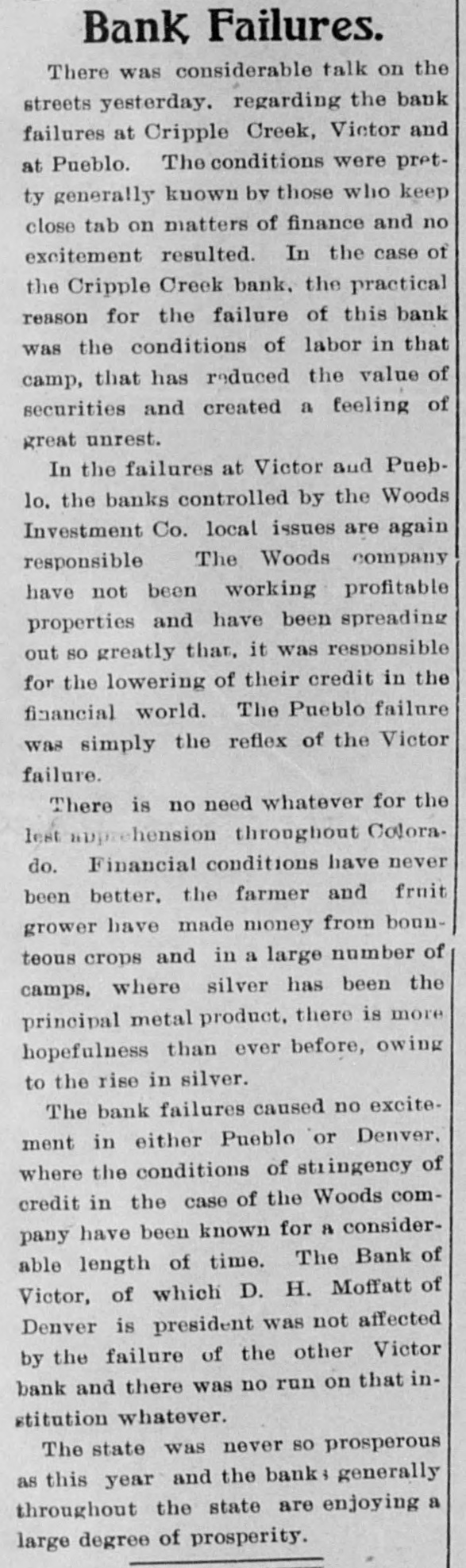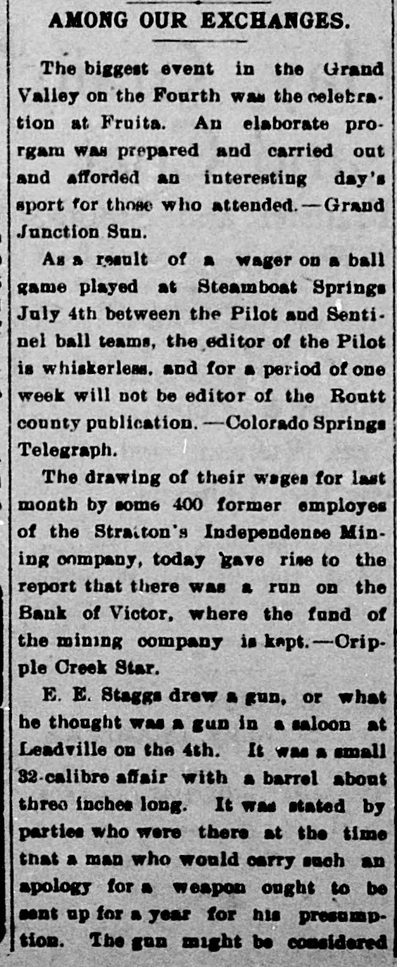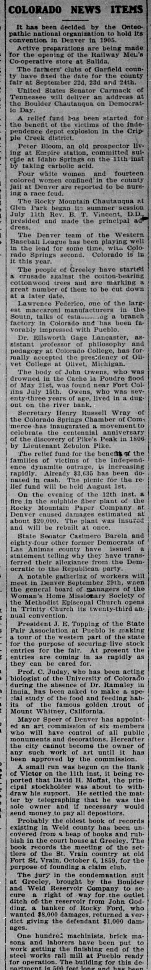 COLORADO NEWS ITEMS It has been decided by the Onteopathic national organization to hold its convention in Denver in 1905. Active preparations are being made for the opening of the Railway Men's Co-operative store at Salida. The farmers' clubs of Garfield county have fixed the date for the county fair at September 22d, 23d and 24th. United States Senator Carmack of Tennessee will deliver an address at the Boulder Chautauqua on Democratic Day. A relief fund has been started for the benefit of the victims of the Independence depot explosion in the Cripple Creek district. Peter Bloom, an old prospector living at Empire station, committed suicide at Idaho Springs on the 11th inst by taking carbolic acid. Four white women and fourteen colored women confined in the county jail at Denver are reported to be nursing a race feud. The Rocky Mountain Chautauqua at Glen Park began its summer session July 11th Rev. B. T. Vincent, D.D., presided and made the principal address. The Denver team of the Western Baseball League has been playing well in the lead for some time, with Colorado Springs second. Colorado is in it this year. The people of Greeley have started a crusade against the cotton-bearing cottonwood trees and are marking a great number of them to be cut down at a later date. Lawrence Federico, one of the largest maccaroni manufacturers in the South, talks of estables.ng a branch factory in Colorado and has been favorably impressed with Pueblo. Dr. Ellsworth Gage Lancaster, assistant professor of philosophy and pedagogy at Colorado College, has formally accepted the presidency of Olivet College at Olivet, Michigan. The body of John Owens, who was drowned in the Cache la Poudre flood of May 21st, was found near Fort Coliins July 15th. Owens, who was sev-Snp B u] рели 'aSe JO Rears out on the river bank. Secretary Henry Russell Wray of the Colorado Springs Chamber of Commerce-has inaugurated a movement to celebrate the centennial anniversary of the discovery of Pike's Peak in 1806 by Lieutenant Zebulon Pike. The relief fund for the benefit of the families of victims of the Independence dynamite outrage, is increasing rapidly. Already $3,635 has been donated in cash. The pienic for the relief fund will be held August 1st. On the evening of the 12th inst. a fire in the sulphide fiber plant of the Rocky Mountain Paper Company at Denver caused damages estimated at about $20,000. The plant was insured and will be rebuilt at once. State Senator Casimero Barela and eighty-four other former Democrats of Las Animas county have issued a statement telling why they have transferred their allegiance from the Democratic to the Republican party. A notable gathering of workers will meet in Denver September 29th, when the general board of managers of the Woman's Home Missionary Society of the Methodist Episcopal Church opens in Trinity Church its twenty-third an3 nual convention. An President J. E. Topping of the State $ Fair Association at Pueblo is making a tour of the western part of the state for the purpose of securing live stock entries for the fair. At present the : entries are coming in as rapidly as they can be cared for. t Prof. C. Juday, who has been acting biologist of the University of Colorado during the absence of Dr. Ramaley in e India, has been asked to make a special study of the food and feeding habits of the famous golden trout of 1 Mount Whitney, California. Mayor Speer of Denver has appointed an art commission of six members 1 who will have control of all public monuments and decorations. Hereafter the city cannot become the owner of any such work of art until it has been approved by the commission. € A small run was begun on the Bank € of Victor on the 11th inst, it being re2 ported that David H. Moffat, the principal stockholder was about to withdraw his support. He settled the matter by telegraphing that he was the sole owner and if necessary would 1 send money to pay all depositors. Probably the oldest book of records existing in Weld county has been uncovered from a heap of books and rub-
