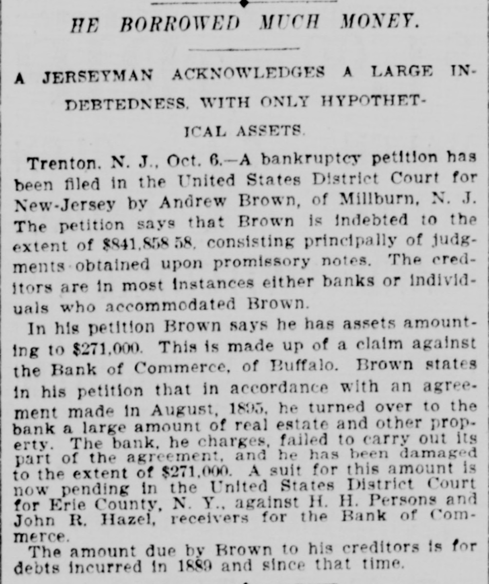 # HE BORROWED MUCH MONEY. A JERSEYMAN ACKNOWLEDGES A LARGE INDEBTEDNESS, WITH ONLY HYPOTHETICAL ASSETS. Trenton. N. J., Oct. 6.-A bankruptcy petition has been filed in the United States District Court for New-Jersey by Andrew Brown, of Millburn, N. J. The petition says that Brown is indebted to the extent of $841,858.58, consisting principally of judgments obtained upon promissory notes. The creditors are in most instances either banks or individuals who accommodated Brown. In his petition Brown says he has assets amounting to $271,000. This is made up of a claim against the Bank of Commerce, of Buffalo. Brown states in his petition that in accordance with an agreement made in August, 1895, he turned over to the bank a large amount of real estate and other property. The bank, he charges, failed to carry out its part of the agreement, and he has been damaged to the extent of $271,000. A suit for this amount is now pending in the United States District Court for Erie County, N. Y., against H. H. Persons and John R. Hazel, receivers for the Bank of Commerce. The amount due by Brown to his creditors is for debts incurred in 1889 and since that time.