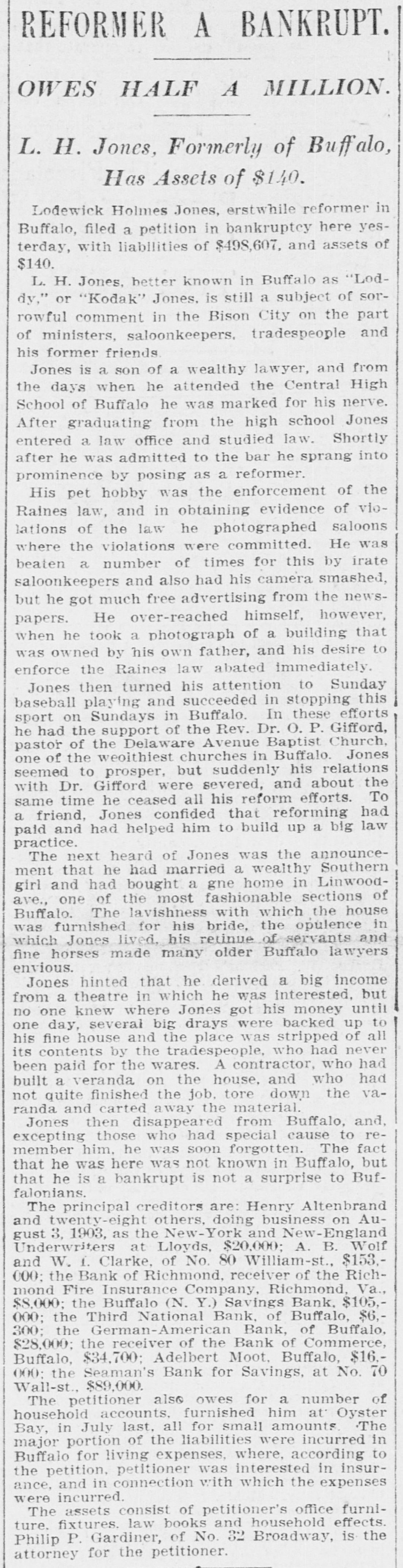 # REFORMER A BANKRUPT. OWES HALF A MILLION. L. H. Jones, Formerly of Buffalo, Has Assets of $140. Lodewick Holmes Jones, erstwhile reformer in Buffalo, filed a petition in bankruptcy here yesterday, with liabilities of $498,607, and assets of $140. L. H. Jones, better known in Buffalo as "Loddy," or "Kodak" Jones, is still a subject of sorrowful comment in the Bison City on the part of ministers, saloonkeepers, tradespeople and his former friends. Jones is a son of a wealthy lawyer, and from the days when he attended the Central High School of Buffalo he was marked for his nerve. After graduating from the high school Jones entered a law office and studied law. Shortly after he was admitted to the bar he sprang into prominence by posing as a reformer. His pet hobby was the enforcement of the Raines law, and in obtaining evidence of violations of the law he photographed saloons where the violations were committed. He was beaten a number of times for this by irate saloonkeepers and also had his camera smashed, but he got much free advertising from the newspapers. He over-reached himself, however, when he took a photograph of a building that was owned by his own father, and his desire to enforce the Raines law abated immediately. Jones then turned his attention to Sunday baseball playing and succeeded in stopping this sport on Sundays in Buffalo. In these efforts he had the support of the Rev. Dr. O. P. Gifford, pastor of the Delaware Avenue Baptist Church, one of the wealthiest churches in Buffalo. Jones seemed to prosper, but suddenly his relations with Dr. Gifford were severed, and about the same time he ceased all his reform efforts. To a friend, Jones confided that reforming had paid and had helped him to build up a big law practice. The next heard of Jones was the announcement that he had married a wealthy Southern girl and had bought a gne home in Linwood-ave., one of the most fashionable sections of Buffalo. The lavishness with which the house was furnished for his bride, the opulence in which Jones lived, his retinue of servants and fine horses made many older Buffalo lawyers envious. Jones hinted that he derived a big income from a theatre in which he was interested, but no one knew where Jones got his money until one day, several big drays were backed up to his fine house and the place was stripped of all its contents by the tradespeople, who had never been paid for the wares. A contractor, who had built a veranda on the house, and who had not quite finished the job, tore down the veranda and carted away the material. Jones then disappeared from Buffalo, and, excepting those who had special cause to remember him, he was soon forgotten. The fact that he was here was not known in Buffalo, but that he is a bankrupt is not a surprise to Buffalonians. The principal creditors are: Henry Altenbrand and twenty-eight others, doing business on August 3, 1903, as the New-York and New-England Underwriters at Lloyds, $20,000; A. B. Wolf and W. 1. Clarke, of No. 80 William-st., $153,000; the Bank of Richmond, receiver of the Richmond Fire Insurance Company, Richmond, Va., $8.000; the Buffalo (N. Y.) Savings Bank, $105,000; the Third National Bank, of Buffalo, $6,300; the German-American Bank, of Buffalo, $28,000; the receiver of the Bank of Commerce, Buffalo, $34,700; Adelbert Moot, Buffalo, $16,000; the Seaman's Bank for Savings, at No. 70 Wall-st., $89,000. The petitioner also owes for a number of household accounts, furnished him at Oyster Bay, in July last, all for small amounts. The major portion of the liabilities were incurred in Buffalo for living expenses, where, according to the petition, petitioner was interested in insurance, and in connection with which the expenses were incurred. The assets consist of petitioner's office furniture, fixtures, law books and household effects. Philip P. Gardiner, of No. 32 Broadway, is the attorney for the petitioner.