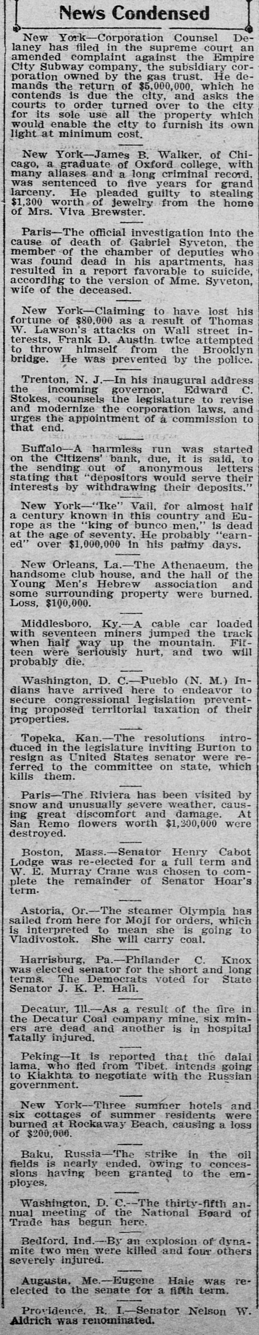 News Condensed New York-Corporation Counsel Delaney has filed in the supreme court an amended complaint against the Empire City Subway company. the subsidiary corporation owned by the gas trust. He demands the return of $5,000,000. which he contends is due the city, and asks the courts to order turned over to the city for its sole use all the property which would enable the city to furnish its own light at minimum cost. New York-James B. Walker, of Chicago, a graduate of Oxford college, with many aliases and a long criminal record. was sentenced to five years for grand larceny. He pleaded guilty to stealing $1,300 worth of Jewelry from the home of Mrs. Viva Brewster. Paris-The official investigation into the cause of death of Gabriel Syveton, the member of the chamber of deputies who was found dead in his apartments, has resulted in a report favorable to suicide, according to the version of Mme. Syveton, wife of the deceased. New York-Claiming to have lost his fortune of $80,000 as a result of Thomas W. Lawson's attacks on Wall street interests. Frank D. Austin twice attempted to throw himself from the Brooklyn bridge. He was prevented by the police. Trenton, N. J.-In his inaugural address C. the incoming governor, Edward Stokes, counsels the legislature to revise and modernize the corporation laws, and urges the appointment of a commission to that end. Buffalo-A harmless run was started on the Citizens' bank, due, it is said, to the sending out of anonymous letters stating that "depositors would serve their interests by withdrawing their deposits.' New York-"Ike" Vail, for almost half a century known in this country and Europe as the "king of bunco men," is dead at the age of seventy. He probably "earned" over $1,000,000 in his palmy days. New Orleans, La.-The Athenaeum. the handsome club house, and the hall of the Young Men's Hebrew association and some surrounding property were burned. Loss, $100,000. Middlesboro, Ky.-A cable car loaded with seventeen miners jumped the track when half way up the mountain. Fifteen were seriously hurt, and two will probably die. Washington, D. (N. M.) Indians have arrived here to endeavor to secure congressional legislation preventing proposed territorial taxation of their properties. Topeka, Kan.-The resolutions introduced in the legislature inviting Burton to resign as United States senator were referred to the committee on state, which kills them. Paris-The Riviera has been visited by snow and unusually severe weather, causing great discomfort and damage. At San Remo flowers worth $1,200,000 were destroyed. Boston, Mass.-Senator Henry Cabot Lodge was re-elected for a full term and W. E. Murray Crane was chosen to complete the remainder of Senator Hoar's term. Astoria, Or.-The steamer Olympia has sailed from here for Moji for orders, which is interpreted to mean she is going to Vladivostok. She will carry coal. Harrisburg, Pa.-Philander C. Knox was elected senator for the short and long terms. The Democrats voted for State Senator J. K. P. Hali. Decatur, Ill.-As a result of the fire in the Decatur Coal company mine, six miners are dead and another is in hospital Tatally injured. Peking-It is reported that the dalai lama, who fied from Tibet. intends going to Kiakhta to negotiate with the Russian government. New York--Three summer hotels and six cottages of summer residents were burned at Rockaway Beach, causing a loss of $200,000. Baku, Russia-The strike in the oil fields is nearly ended. owing to concessions having been granted to the employes, Washington, D. C.-The thirty-fifth annual meeting of the National Board of Trade has begun here. Bedford, Ind.-By an explosion of dynamite two men were killed and four others severely injured. Augusta, Me.-Eugene Hale was reelected to the senate for a fifth term. Providence, R. I.-Senator Nelson W. Aldrich was renominated.