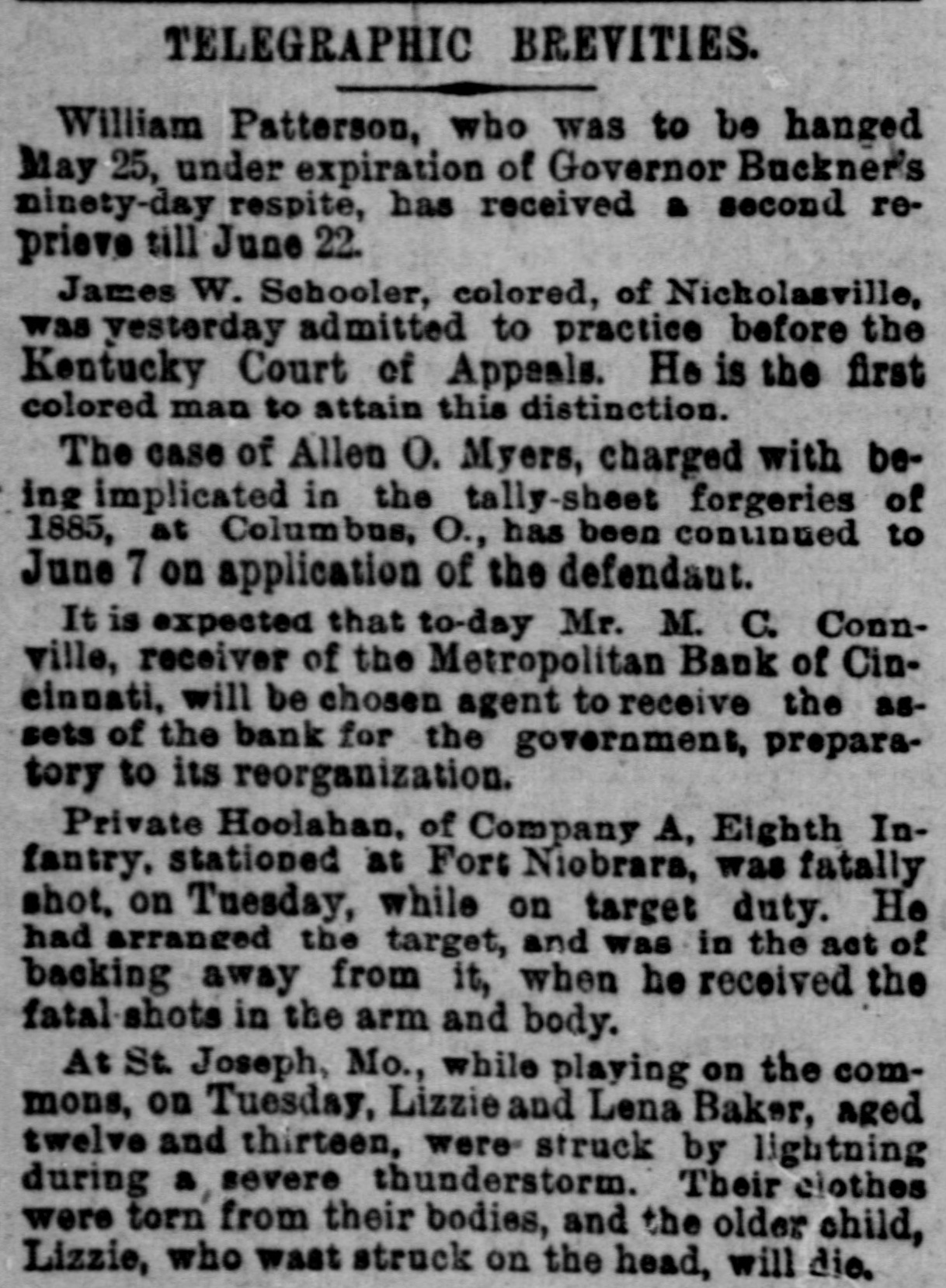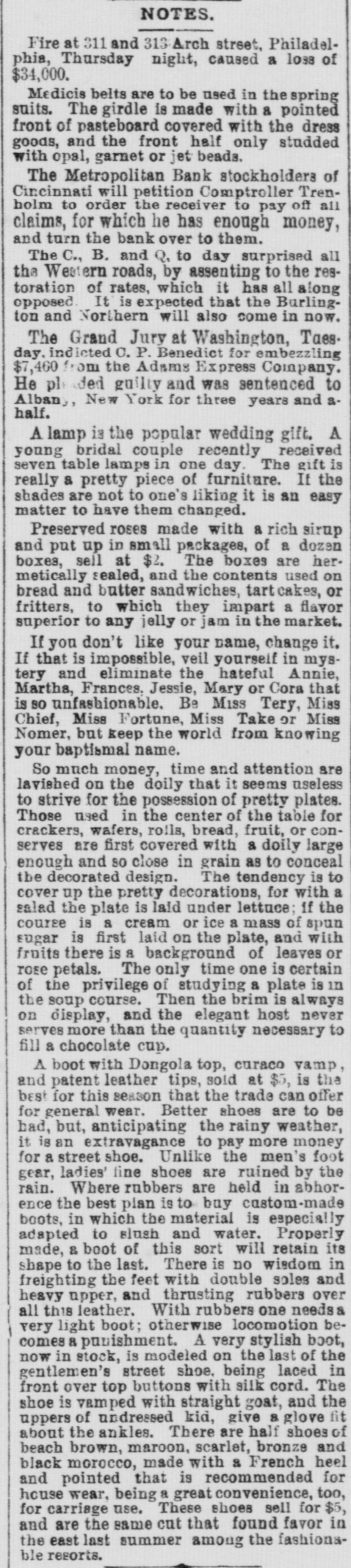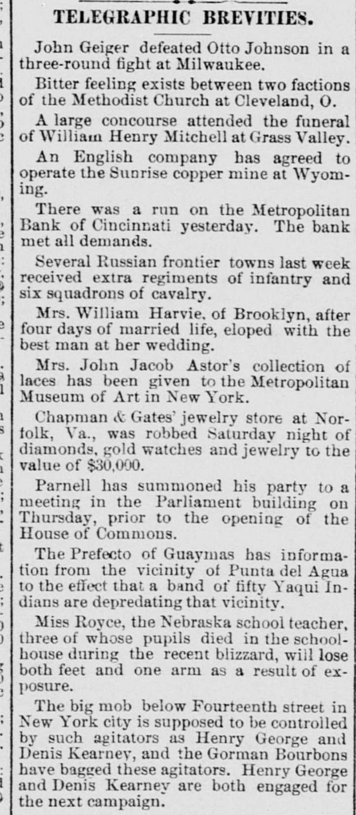 pieces and forty other persons injured, fourteen seriously. Immense damage was done, several tons of powder being exploded. EIGHT hundred marble workers of Boston have struck for nine hours' work at ten hours' pay. THE WEST. THE Methodist Church at Fremont, O., was destroyed by fire recently and two persons in the parsonage adjoining were injured by falling walls. Loss, $35,000. Br the explosion of a burr stone of a corn mill at Broadhead, Champaign County, IIL, recently, two men were killed and two fatally hurt. A SENSATIONAL feature of the failure of the Metropolitan Bank, of Cincinnati, was the arrest on the 7th of Hon. William Means. its president. Other arrests were expected. THE North Chicago rolling mill at South Chicago resumed work on the 6th after two months' idleness. THE lockout of the Cincinnati shoemakers has practically been settled by the giving way of the employes under the persuasion of the district master workman. A RECEIVER has been appointed for the firm of E. A. Spyer & Co., wholesale teas and coffees, of Chicago. The principal cause of their embarrassment is said to be the recent decline in the coffee market. The liabilities have not been made known. TWENTY-FIVE prominent persons of Chicago have taken steps to erect a crematory. OIL was struck at Lehigh, I. T., recently at a depth of 917 feet and is flowing at the rate of a barrel an hour. By the derailing of an accommodation train near Athens, III., the other night, eight passengers were injured and six freight cars ditched. THE people of Albuquerque have subscribed $40,000 in cash to the Rio Grande & Utah railroad. THE striking Cincinnati shoemakers have been ordered to return to work. THE Territorial miners' convention at Helena denounced the Northern Pacific. McCLELLAN & Co., insolvent Minneapolis stove dealers, schedule shows assets, $3,262, and liabilities, $5,296. THE Springfield, O., Manufacturing Company has been placed in the hands of a receiver. THE National Convention was in session in Cincinnati on the Sth. AGENT KINNEY'S Dakota blizzard stories have been again contradicted. THE Manitoba railroad bridge across the Missouri river at Great Falls, Dak., has been completed. It is 900 feet long. D. R. LOCKE, "Petroleum V. Nasby," of the Toledo (0.) Blade, was reported on the 8th to be dying of consumption. A DISASTROUS cable accident occurred at Kansas City, Mo., on the night of the Sth, on the incline at the Union Depot, caused by the grip breaking. Two persons were fatally injured and seven others were hurt, one quite seriously. The incline had been noted for several bad accidents previously to the late disaster. A PHASE in the railroad war on the Sth was a cut of $3.00 in the passenger rate from Chicago to Kansas City. THE American Newspaper Publishers' Union held its annual meeting in Indianapolis, Ind., on the Sth. AMOS S. SNELL, a capitalist worth $3,000,000, was murdered by burglars in his residence, 425 Washington boulevard, Chicago, on the morning of the Sth. One arrest was made. What the robbers succeeded in taking away was not known, excepting that with the property was a check for $5,000 made by A. J. Stone, Sne:l's son-inlaw. THE Oklahoma convention met in Kansas City, Mo., on the Sih at the Board of Trade Hall with a large attendance, Governor Morehouse, of Missouri, occupying the chair. A memorial to Congress was adopted as well as resolutions looking to the opening of the Indian Territory and favoring the Springer bill for the creation of the Territory of Oklahoma. FIRE in Cleveland, 0., the other day, caused $65,000 damage to J. L. Hudson's clothing store. Cause, electric light wires. BENJAMIN EGGLESTON, ex-member of Congress and one of the most prominent of Ohio political leaders, died recently in Cincinnati, aged seventy-two. J. C. EVANS, of Harlem, Mo., has been elected treasurer and Parker Earl, of Cobden, III., president of the American Horticultural Society. THE Andrew Jackson Club, of Chicago, has taken steps to call a meeting of Democratic Clubs of America in Chicago June 1. FIVE cases of trichincsis have occurred in the family of William Man, a resident of Toledo, 0. All five were in a dangerous condition. BENSLEY BROS., of the Chicago Board of Trade, failed ou the 9th. Liabilities were not definitely known, but were thought to amount to $300,000. THE Columbia Theater, of Chicago, IS reported in financial difficulties. GEORGE W. CLARK. a real estate dealer of Duluth, Minn., formerly a newspaper writer under the late Daniel Manning on the Albany Argus, died recently. WOLVES have become dangerously numerous in the vicinity of St. Cloud, Minn. The other night several made a raid on a pig pen, almost within the city limits, and destroyed nearly 2,000 pounds of live hogs. IN Liberty township. Wabash Coun y, Ind., recently J. I. Smith and Joel Hale were killed by the explosion of the boiler of a portable engine. The explosion was caused by pumping cold water into the superheated boiler. Two men were recently digzing up some dynamite which had been buried to protect it until wanted to use in a gas well near Bellevue, O., when one of them struck the explosive material with his pick. The explosion instantly killed the two men. WILLIAM DONALDSON & Co.. dealers in pictures and frames, Cincinnati, have failed with $75,000 liabilities and $40,000 assets. THE SOUTH THE people of Arkansas are preparing remonstrances against the Dawes bill to levy a tax on lard manufactured by the aid of cotton seed oil. THE Commercial Printing Company. of
