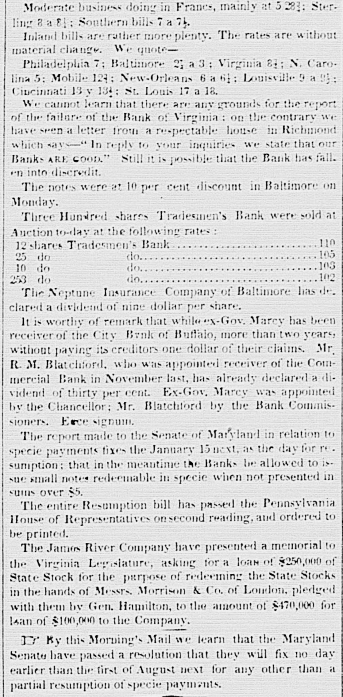 Moderate business doing in Francs, mainly at 5 283; Sterling 8 a 81; Southern bills 7 a 71. Inland bills are rather more plenty. The rates are without material change. We quote- Philadelphia 7; Baltimore 21 a 3; Virginia 81; N. Carolina 5: Mobile 124; New-Orleans 6 a 61; Louisville 9 a 95; Cincinnati 13 y 184: St. Louis 17 a 18. We cannot learn that there are any grounds for the report of the failure of the Bank of Virginia: on the contrary we have seen a letter from a respectable house in Richmond which says" In reply to your inquiries we state that our Banks ARE COoD." Still it is possible that the Bank has fallen into discredit. The notes were at 10 per cent discount in Baltimore on Monday. THREE HUNDRED SHARES TRADESMEN'S BANK WERE SOLD AT AUCTION TO-DAY AT THE FOLLOWING RATES: 12 shares Tradesmen's Bank 110 25 do do 105 10 do do 103 253 do do 102 The Neptune Insurance Company of Baltimore has declared a dividend of nine dollar per share. It is worthy of remark that while ex-Gov. Marcy has been receiver of the City Bank of Buffalo, more than two years, without paying its creditors one dollar of their claims. Mr. R. M. Blatchford, who was appointed receiver of the Commercial Bank in November last, has already declared a dividend of thirty per cent. Ex-Gov. Marcy was appointed by the Chancellor; Mr. Blatchford by the Bank Commissioners. Erce signum. The report made to the Senate of Maryland in relation to specie payments fixes the January 15 next, as the day for resumption; that in the meantime the Banks be allowed to issue small notes redeemable in specie when not presented in sums over $5. The entire Resumption bill has passed the Pennsylvania House of Representatives on second reading, and ordered to be printed. The James River Company have presented a memorial to the Virginia Legislature, asking for a loan of $250,000 of State Stock for the purpose of redeeming the State Stocks in the hands of Messrs. Morrison & Co. of London, pledged with them by Gen. Hamilton, to the amount of $470,000 for loan of $100,000 to the Company. By this Morning's Mail we learn that the Maryland Senate have passed a resolution that they will fix no day earlier than the first of August next for any other than a partial resumption of specie payments.