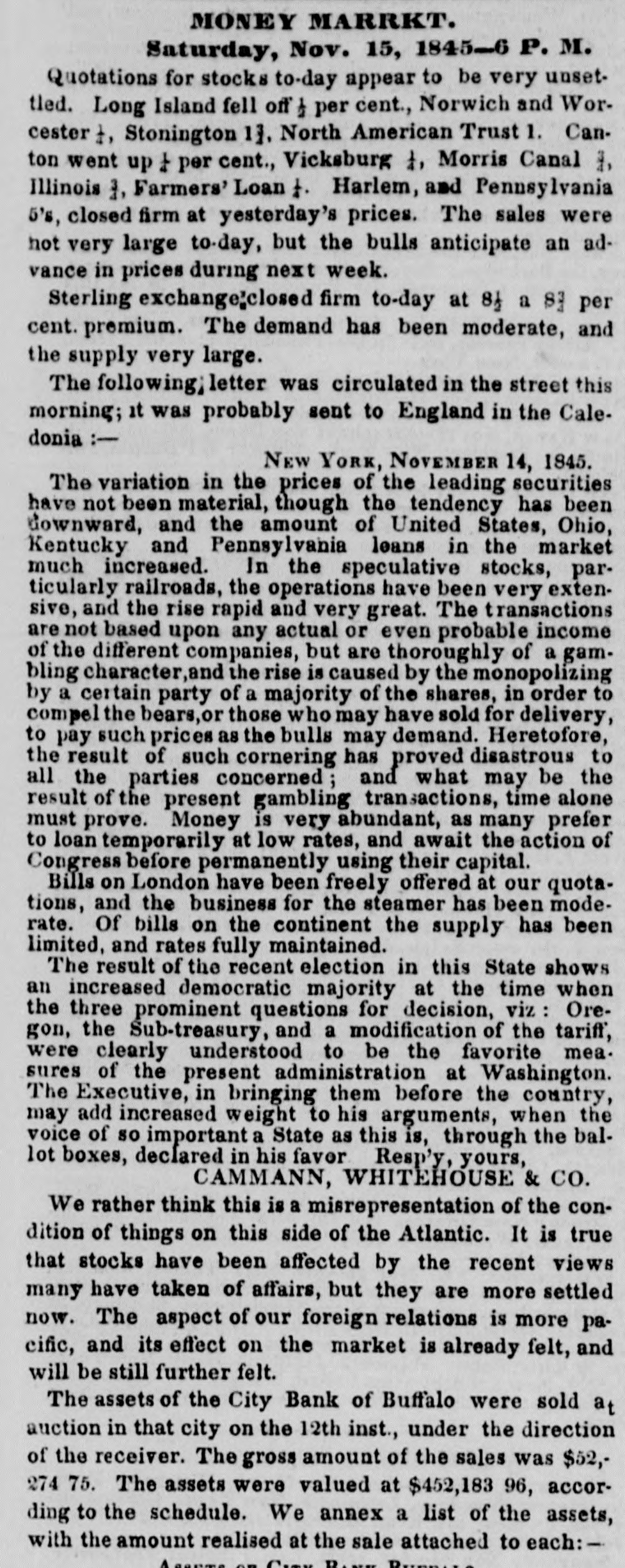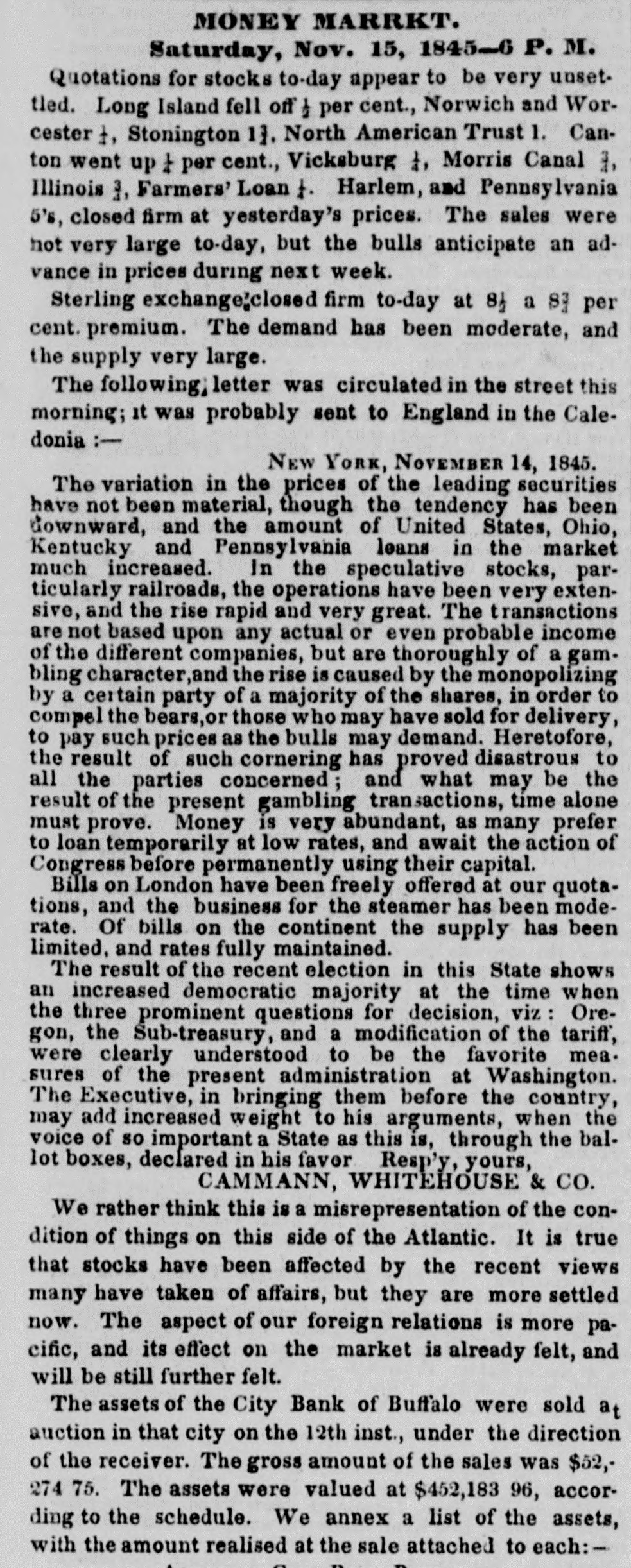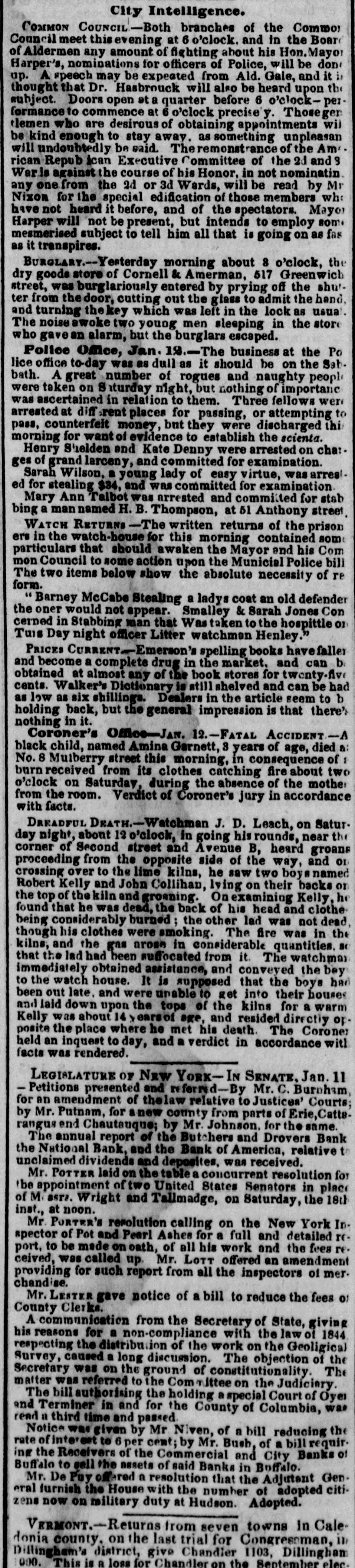 City Intelligence. COMMON Council-Both branches of the Common Council meet thisevening at 6 o'clock. and in the Boar Aldermen any amount of fighting about his Hon. Mayor Harper's, nominations for officers of Police, will be don up. A speech may be expeated from Ald. Gale, and it thought that Dr. Hasbrouck will also be heard upon the subject. Doors open at a quarter before 6 o'clock-performance to commence at 6 o'clock precise y. Thoseger temen who are desirous of obtaining appointments wil e kind enough to stay away. as something unpleasan will undoubtedly be said. The remonstran of the Am rican Repub ican Executive Committee of the 2d and War is against the course of his Honor, in not nominatin one from the 2d or 3d Wards, will be read by Mr any Nixon for the special edification of those members wh: have not heard it before, and of the spectators. Mayor Harper will not be present, but intends to employ som. mesmerised subject to tell him all that is going on as fas as it transpires. BURGLARY.--Yesterdr morning about 8 o'clock, the dry goods store of Cornell & Amerman, 517 Greenwich street, was burglariously entered by prying off the shuter from the door, cutting out the glass to admit the hand. and turning thekey which was left in the lock as usual. store The noise awoke two young men sleeping in the who gavean alarm, but the burglars escaped. Police Office, Jan. 19.-The business at the Po lice office to-day was as dull as it should be on the Sabbath. A great number of rogues and naughty people were taken on Saturday night, but nothing of importance was ascertained in relation to them. Three fellows were arrested at diff rent places for passing, or attempting this to pass, counterfeit money, but they were discharged morning for want of evidence to establish the scienta. Henry Shelden and Kate Denny were arrested on cha: ges of grand larceny, and committed for examination. Sarah Wilson, a young lady of easy virtue, was arres ed for stealing $34, and was committed for examination Mary Ann Talbotwas arrested and commited for stab bing a man named .B. Thompson, at 51 Anthony street. WATCH RETURNS- written returns of the prison ers in the watch-bouse for this morning contained some particulars that should awaken the Mayor and his Com mon Council to some action upon the Municial Police bill The two items below show the absolute necessity of re form. Barney McCabe Stealing a ladys coat an old defender the oner would not appear. Smalley & Sarah Jones Con cerned in Stabbing man that Vastaken to the hospittle 01 Twis Day night officer Litter watchmen Henley." PRICES CURRENT.-Emerson's spelling books have faller and become a complete drug in the market, and can b obtained at almost any of the book stores for twenty-flv cents. Walker's Dictionary still shelved and can be had b low as six shillings. Dealers in the article seem to holding back, but the general impression is that there's nothing in it. Coroner's Office-JAN. 12.-FATAL ACCIDENT black child, named Amina Garnett, 3 years of age, died a: No. 8 Mulberry street this morning, in consequence of burn received from its clothes catching about two o'clock on Saturday, during the absence of the mother from the room. Verdict of Coroner's jury in accordance with facts. DREADFUL DRATH.-Watchman J. D. Leach, on Satur. day night, about 12 o'clock, in going hisrounds, near the corner of Second street and Avenue B, heard groans proceeding from the opposite side of the way, and 01 crossing over to the lime kilns, he saw two boys named Robert Kelly and John Collihan, lying on their backs or he the top of thekiln and grossing. On examining Kelly, found that he was dead, the back of his head and clothe being considerably burned the other lad was not dead though his clothes were smoking. The fire was in the so kilns, and the gns arose in considerable quantities. that the lad had been suffocated from it. The watchman immediately obtained assistance, and conveyed the bey to the watch house. It is supposed that the boys had been out late. and were unable to get into their houses and laid down upon the tops of the kilns for a warm Kelly was about ears of age, and resided directly or posite the place where he met his death. The Coroner held an inquest to day, and a verdict in accordance with facts was rendered. LEGISLATURE OF New YORK-IN SENATE. Jan. 11 Petitions presented and referred-By Mr. C. Burnham, for - an amendment of thelaw relative to Justices' Courts; by Mr. Putnam, for anew county from parts of Erie, Cattsrangus end Chautauque; by Mr. Johnson. for the same. The annual report of the Butchers and Drovers Bank the National Bank, and the Bank of America, relative unclaimed dividends and deposites, was received. Mr. POTTER laid on the table a concurrent resolution for be appointment of two United States Senators in place of M asrs. Wright and Tallmadge, on Saturday, the 18th inst., at noon. Mr. PORTER'S repolution calling on the New York In spector of Pot and Pearl Ashes for a full and detailed re port, to be made on oath, of all his work and the fees re ceived, was called up. Mr. LOTT offered an amendment providing for such report from all the inspectors of merchandise. Mr. LESTER gave notice of a bill to reduce the fees of County Clerks. A communication from the Secretary of State, giving his reasons for a non-compliance with the law of 1844 respecting the distribution of the work on the Geoligical Survey, caused a long discussion. The objection of The the Secretary was on the ground of constitutionality. matter was referred to the Committee on the Judiciary. The bill authorising the holding a special Court of Oye and Terminer in and for the County of Columbia, was read a third time and passed. Notice was given by Mr Niven, of a bill reducing the rate of interest to per cent; by Mr. Bush, of a bill requir- of ing the Receivers of the Commercial and City Banks Buffalo to sell the assets of said Banks in Boffalo. Mr. De Puy offered a resolution that the Adju