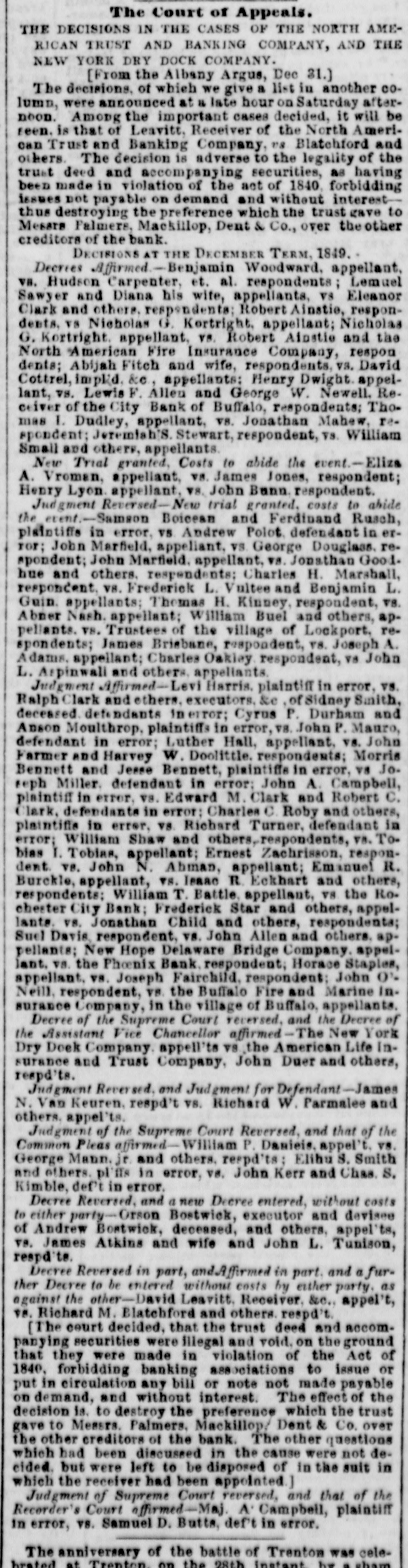 The Court of Appeals. THE DECISIONS IN THE CASES OF THE NORTH AMERICAN TRUST AND BANKING COMPANY, AND THE NEW YORK DRY DOCK COMPANY. [From the Albany Argus, Dec 31.) The decisions. of which we give a list in another cowere announced at a late hour on Saturday after- be lumn, Among the important cases decided, it will noon. is that of Leavitt, Receiver of the North Ameri- and reen. Trust and Banking Company, vs Blatchford the can The decision is adverse to the legality of and accompanying as in violation of the act of issues not payable on demand and trust been others. made deed securities, without 1840 forbidding interest having to thus destroying the preference which the trust gave Mesars Falmers, Mackillop, Dent & Co., over theother creditors of the bank. DECISIONS AT THE DECEMBER TERM, 1849. Decrees Afformed Benjamin Woodward, appellant, Hudson Carpenter, et. al. respondents; Lemuel Sawyer VR. and Diana his wife, appellants, vs Eleanor Clark and others. respondents: Robert Ainstie, respondents. vs Nicholas G. Kortright, appellant; Nicholas the G. Kortright. appellant, vs. Robert Aiostie and North American Fire Insurance Company, respon David dents; Abijah Fitch and wife, respondents, vs. Cottrel, implid. &c. appellants: Henry Dwight. appel- Re. lant, vs. Lewis F. Allen and George W. Newell. Thoceiver of the City Bank of Buffalo, respondents; mas 1. Dudley, appellant, VS. Jonathan Mahew, respendent; Jeremiah'S Stewart, respondent, vs. William Small and others, appellants New Trial granted, Costs to abide the event.-Eliza Vroman, appellant, VA. James Jones, respondent; A. appellant, vs. John Bann. Reversed-New trial granted. costs Henry Judgement Lyon Ferdinand respondent. to abide the rent.-Samson Boicean and Rusch, erplaintiffs in error. vs Andrew Polot defendant in John Marfield, appeliant. VS George Douglass. reJohn Marfield. appellant, vs. and others. respondents; Charles FOR: spondent; hue Jonathan H. Benjamin Marshall, Good. L. respondent VR. Frederick L. Vultee and Guin. appellants; Thomas H. Kinney, respondent, vs. Abner Nash. appellant; William Buel and others, appellants. vs. Trustees of the village of Lockport, re- A. spondents; James Brisbane, respondent, V8. Joseph Adams. appellant; Charles Oakley respondent, VA John L. Arpinwali and others. appellants, Levi Harris. lark and others. executors. & defendants in error; Cyrus P. Halph deceased Judgement Affirmed- plaintiff of Sidney Durham in error, Mauro, Smith, and vs. Anson Moulthrop, plaintiffs in error, V8. John P. defendant in error; Luther Hall, appellant, vs. John Farmer and Harvey W. Doolittle. respondents; Morris Jo. Bennett and Jesse Bennett, plaintiffs in error, vs reph Miller. defendant in error: John A. Campbell, C. plaintiff in error. vs. Edward M. Clark and Robert Clark, defendants in error: Charles C. Roby and others, plaintiffe in error. vs. Richard Turner, defendant To- in error; William Shaw and others, respondents, vs. Tobias, appellant; Ernest Zachrisson. responJohn N. Ahman, appellant; vs. Tease R Eckhart bias dent Burckle, 1. vs. appellant, Eminuel and the others, Ro. R. respondents: William T. Battle appellant, VS chester City Bank; Frederick Star and others, appelvs. Jonathan Child and others, respondents; vs. John Allen New Hope Delaware Bridge the Phoenix Bank respondent, Suel lants. lant. pellants; Davis vs. respondent, Company and Horace others. John Staples, appel- ap- O'vs. Joseph Fairchild. respondent: VS. the Buffalo Fire and in the village of Buffalo, surance appellant. Neill, respondent, Company, the appellants Marine Decree in- of Decree of the Supreme Court recersed, and the Assistant Vice Chancellor affirmed The New York inDry Deek Company. appell'te VS the American Life surance and Trust Company, John Duer and others, reapd'ts. Judgment Reversed. and Judgement for Defendant-James N. Van Keuren. respd't vs. Richard W. Parmalee and others. the Supreme Court Reversed, and Pleas affirmed William P. George jr. and others. respd'ts; Common Judgement appel'ts. Mann. of Daniels. Elihu appel't. that S. Smith of vs. the and others. pl'ffs in error, vs. John Kerr and Chas S. Kimble, def't in error. Decree Reversed, and a new Decree entered, without costs to either party Orson Bostwick, executor and devisee of Andrew Bostwick, deceased, and others. appel'ts, vs. James Atkins and wife and John L. Tunison, respd te. Decree Reversed in part, and-Afformed in part. and a further Decree to be entered without costs by either party. as against the David Leavitt. Receiver. &c., appel't, ve. Richard M. Blatchford and others. respd't [The court decided, that the trust deed and accompanying securities were illegal and void. on the ground that they were made in violation of the Act of forbidding banking associations to issue or in circulation any bill or note not and without interest. put on 1840, demand, The which made effect the payable of trust the decision is. to destroy the preference to Measrs. Palmers. Mackillop/ Dent & Co. over the gave other creditors of the bank. The other questions which had been discussed in the cause were not deeided. but were left to be disposed of in the suit in which the receiver had been appointed.) Judgement of Supreme Court reversed, and that of the Recorder's Court formed-Maj. A Campbell, plaintiff in error, vs. Samuel D. Butts, def't in error. hrated at Trenton on the 28th instant he a sham The anniversary of the battle of Trenton was cele-