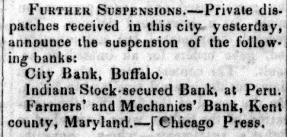 Loss OF THE STEAMER YANKEE BLADE.-The steamer Yankee Blade left San Francisco, Sept. 30, with 800 passengers and $153,000 in specie. Oct. 1, at 31 o'clock, P. M., whilst encompassed in a dense fog, she ran upon a reef of rocks, off Point Arguilla, and in less than twenty-five minutes sank in water below the promenade deck. The boats were immediately manned and all the passengers taken from the wreck, but one of the boats unfortunately stranding about thirty lives were lost. The next morning the steamer Goliath made her appearance and succeeded in picking up the survivors yet on the sea, amounting to six hundred, and landed them at San Diego, whither she was bound. Five hundred and thirty-six were left there until a vessel could be sent to bear them on their homeware journey. On her return the remaining part of the passengers and crew left were taken on board and landed at San Francisco. WRECK OF THE STEAMSHIP NEW ERA-TERRIBLE LOSS OF LIFE.-The packet ship New Era, of Bath, Maine, on her passage from Bremen to New York, with over two hundred and sixty passengers on board, in a dense fog, on Sunday night, went ashore off Deal, on the Jersey shore, and will probably prove a total wreck. The latest n'elligence received, states that the ship was breaking up, and more than one half of the passengers had been drowned in between the decks and overboard, and many were yet clinging to the wreck with but little prospect of being saved; the sea constantly breaking over the wreck and running so high that even a life boat could not out ride the waves. The passengers were all Dutch or German. BROKEN BANKS.-The following is a list of banks which have recently burst up, and are today rejected by our brokers. Each day adds new ones to the list. Where it will end cannot be determined. There is now but one safe rule and that is to take as little paper money as possible, unless you know that the bills are secured by safe stocks, and keep no others on hand.This is a necessary finale to such an increase of banks as we have had for the last few years.-So great an expansion of the currency was sure to bring a crash, and notwithstanding the repeated warnings, the banks have continued to increase in an unprecedented ratio. Here is the list: Maine-Bank of Hollowell, Shipbuilder's Bank. Indiana-All free banks. Ohio-All banks except State Bank and branches. Connecticut-Woodbury bank, Middletown bank. New York-Lewis County bank, Exchange bank of Buffalo, City bank of Buffalo. Kentucky-All banks. Illinois-Phoenix bank, Farmers bank, Merchants and Mechanies' bank, City bank, of Chicago; Elgin bank, Ottawa bank, Dupage bank, Bellvidere bank, Rock Island, Naperville bank, of Rockford. LATER.--We learn to-night, that the State banks and branches of Ohio and Indiana are refused by the brokers of this city. If this is generally done, the effect will be far reaching, and it would not surprise us to see a very general suspension by the banks of the country. Stand from under those that can. [Grand Rapids Enquirer.