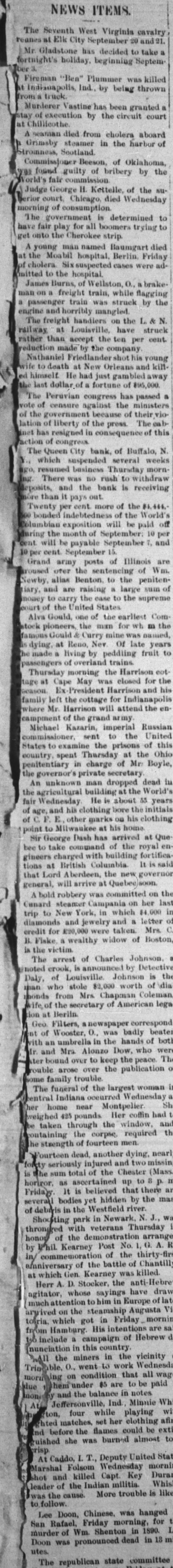 NEWS ITEMS West The Seventh Virginia City Elk Mr. decided Gladstone holiday beginning Ben" Fireman Plummer Ind. thrown being truck truck. has been granted by the court circuit nt Chillioothe died from aboard cholera of steamer harbor Grimsby Sootland. Beeson Oklahoma, of was the by guilty H. of the Kettelle Serior of morning The for all have the Cherokee's A man young named Moat the Berlin hospital. luitted James train, freight by train passenger and horribly engine N the The freight handlers Louisville, railway at accept the coduction company young Nathaniel rather than made by the shot his Friedlander at wife and kill New death He had just himself of last dollar fortune The has Peruvian of vote the ministers censure against of of the their because government of of the The lation liberty press. in of has net this resigned of congress of The City bank Queen Buffalo, which suspended mornbusiness Thursday no There rush the is bank receiving pays of cent more Twenty of the be will of the month September: be will and payable September cent 15. 10 per September of Grand posts army Illinois of the ofer the ulian Newby Benton. sum and are large raising iary. to the the Com one Gould earliest for tock the pioneers famous Gould Curry of Ner late fruit trains seengers dying, a at living Reno. by peddling made of the morning Thursday Harrison for was closed May and arrison tage at Cape President Indianap family arrison acason. left Ex the cottage will for attend the army campment Russian Michael where Mr. of the grand imperial Kazarin, to sent United the of the prisons at the Ohio country in charge penitentiary the States to spent Thursday Mr Boyle private dead An dropped unknown the World' building Arricultural 55 He about E other fair the age, Wednesday and his clothing marks home Milwaukee at Que Sir Dash George of to bee the take with building charged that Lord arrive will tions gineers at British Aberdeen the new general, on ) robbery on her GOO Cunard to New steamer York, which and a letter Mrs trip monda and jewelry were taken B. Boston Fiske. credit for $20,000 wealthy widow of Johnson noted he victim. arrest of Charles by Louisville The crook, is announ Johnson of is dia worth Daly, who of stole $2,000 Chapman Coleman secretary wife,of the mo man bonds from Mrs of American newspaper badly with an umbrella Geo of Filters, Wooster, O., in the hands of Dow, Alonzo peace. over bound the over rouble and Mra to keep the publication trouble family of the woman The largest funeral Wednesday near Montpelier. had Her coffin taken the corpse. her weighed 425 through pounds the window, required containing men of fourteen strength dying. seriously of the sum total the Chester up horror. is that It believed by hidden Friday bodies Westfield severall debris in the Newark with bronged throngge of the of Shooting park veterans in Thursday honor No by Post Whil Kearney of the thirty in/ commemo of of the battle anniversary killed Gen t which Kearney the antiStocker, have Herr whose D. in Europe of agitator, tion to steamship him Augusta morni from arrived on the got in Friday are torria, This. which His intentions of Hebrew us include in this country vicinity the to O., went able, Trin inclation miners in work the Wedne all that on ing condition be the and hem under balance $5 in notes Wh Ind Minnie four while playing her set clothing matches be could was she uished before the flames burned almost T. I United At Deputy Caddo, Wednesday Dura Whis Marshal Folsom killed Capt. militia. Key leader shot and of the Indian More trouble is was the cause. to follow. was hanged Lee Doon, Friday Chinese. morning in 1890. for murder was Doon San Rafael. of Wm. Shenton dead in 18 utes. The republican state committee