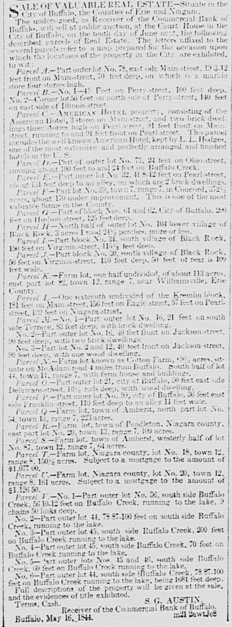 The undersigned, as Receiver of the Commercial Bank of Buffalo. will sell at public auction, at the Court House in the City of Bulfalo, OH the tenth day of June next. the following described parcels of Real Estate. The letters affixed to the several parcels refer to it map prepared for the occasion upon which the locations of the property in the City are exhibited, to wit: Parcel A.-Part outer lot No. 78. east side Main-street, 19.3.12 feet front on Main-street, 70 feet deep, on which 15 a markle store four stories high. Parcel B.-No. 1-45 Feet on Perry-street. 100 feet deep. No. :-Corner lot feet on north side of Perry-street; 140 feet on east side of Illinois-street Parcel C.-AMERICAN HOTEL property, consisting of the American Hotel. stores on Mattistreet, and two brick dwel. lings three stories high on Pearl 91 feet front on Main. street. running to and 91 feet front on Pearl-street This parcel includes the well known American Hotel, kept by L.L. Hodges, one of the most extensive and perfectly arranged and finished hotels III the U.S Parcel 11.-Part of outer lot No. 75. 24 feet on Ohio-street, running about 100 feet to and 24 feet on Buffido Creek. Parcel E.-Part inner int No 32, 41 8.12 feet on Penrlstreet, about 131 feet deep to an alley. on which are 2 brick dwellings. Parcel P-Part lot No. 39, town 7. range7. in Concord. 3721/2 acres. about 170 under improvement. This one of the most valuable farms in the County Parcel G-Part of block Nos. 61 and 62. City of Buffalo, 200 feet on Hudson-street, 125 feet deep. Parcel H-North half of outer lot No. 104 lower village of Black Rock. acres 1 rood 241/2 perches, more or less. Parcel 1.-Part block No. 31. south village of Black Rock, 150 feet on Virginia-street. 115% feet deep. Parcel 1.-Part block No. 30, south village of Black Rock. 50 feet on Virginia-street, 150 feet deep. 50 feet of rear is 100 feet wade. Parcel -Ferm lot. one half undivided. of about 113 acres, east part lot 82. town 12. range 7, near Williamsville, Erie County. Parcel I -One sixteenth undivided of the Kremlin block. 181 feet on Main-street, 156 feet on Eagiestreet, 57 feet ou Pearl. street, 199 feet on Niagarastreet. Parcel 31.-No. 1-Part outer lot No. 16, 21 feet on south side Terrace, 83 feet deep. with brick dwelling. No. 2-Part outer lot No. 16. 40 feet front on Jackson-street, 90 feet deep, with two brick dwellings: No. 3-Part lot No. 2 and 12. 40 feet front on Jackson street, 90 feet deep. with one wood dwelling. Parcel .N.-Farm lot known as Cotton Farm, (9) acres: situnte on McAdam road 4 miles from Burfalo, South half of lot 44. town 11. range with farm house and buildings. Parcel 0.-Part outer lot 21. city of Ruffalo, 50 feet east side Delawarestreet, rods deep. with wood dwelling. Parcel P.-Part inner lot No. 93, city of Buffalo, 36 feet east side Franklin-street, 110 feet deep to an alley 11 feet wide. Parcel 0-Farm lot. town of Amberst, north part lot No. it. town 13, range? 223 acres. Parcel R.-Farm lot. town of Pendleton. Niagara county, east part lot No. 20. town 13, range 100 actes. Parcel S.-Farm lot. town of Amherst, westerly half of lot No. 87. town 12. range 61 acres. Parcel T.-Farm lot. Ningara county. lot No. 18, town 12. range8. 150) acres. Subject to a mortgage to the amount of $1.077 00. Parcel U.-Farm lot. Niagara county. lot No. 20, town 12. range 8. 161 acres. Subject to a mortgage to the amount of $1.126.50. Parcel V.-No. 1-Part outer lot No. 36. south side Buffalo Creek, is 10-12 feet on Buffalo Creek, running to the lake, 3 chains 50 links deep. No. 2-Part outer let 44. 78 87 100 feet on south side Buffalo Creek, running to the lake. No. 3-Part outer lot 45. south side Buffalo Creek, 200 feet on Buffalo Creek running to the lake. No. 4-Part outer lot 45. south side Buffalo Creek. 70 feet on Buffalo Creek running to the lake. No. 5- Part outer lots Nos 45 and 46. south side Buffalo Creek. 60 feet on Buffalo Creek running to the lake. No. 6-Part outer let H. south side Buffalo Creek. 78.87.100 feet on Buffalo Creek running to the lake, being 1681 feet deep. Full descriptions of the property will be given at the sale, and the evidences of title exhibited. S. G. AUSTIN Terms, Cash. Receiver of the Commercial Bank of Buffalo. m21 2awtJe8 Buffalo, May 16, 1844.