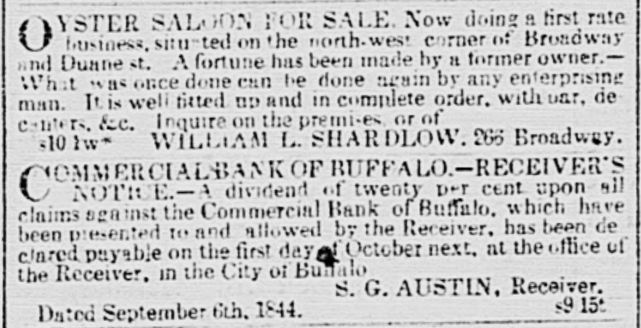 YSTER SALOON FOR SALE Now doing a first rate business, situsted on the north. wes! corner of Broadway and Dunne st. A fortune has been made by it former owner.What was once done can be done again by any enterprising man. It is well titted up and in complete order. with war. de centers. &c. Inquire on the premi-es or of WILLIAM L. SHARDLOW. 266 Broadway. 10 lw IOMMERCIALSANK OF BUFFALO.-RECEIVER'S C NOTICE.-A dividend of twenty per cent upon all claims against the Commercial Bank of Buffalo, which have been presented to and allowed by the Receiver, has been de clared payable on the first day October next. at the office of the Receiver. in the City of Bunalo .AUSTIN, Receiver. $9 15t Dated September 6th. 1844.