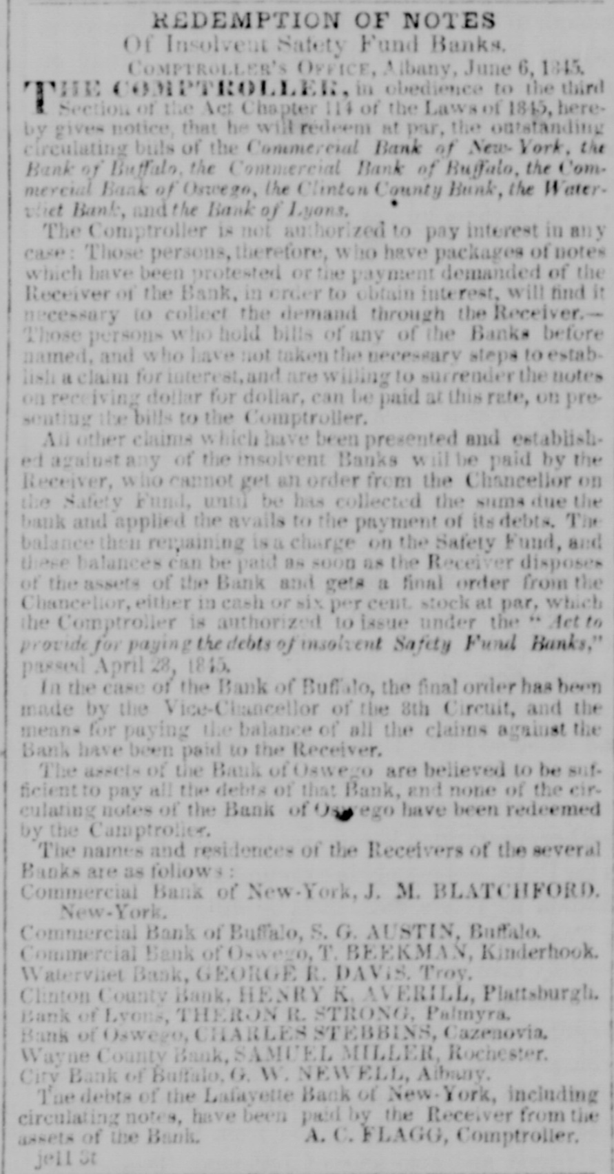 REDEMPTION OF NOTES Of Insolvent Safety Fund Banks. COMPTROLLER'S OFFICE, Albany, June 6, 1845 THE COMPTROLLER, in obedience to the third Section of the Act Chapter 114 of the Laws of 1845, here. by gives notice, that he will redeem at par, the outstanding circulating bills of the Commercial Bank of New York, the Bank of Buffalo, the Commercial Bank of Buffalo, the Commercial Bank of Oswego, the Clinton County Bank, the Watervliet Bank, andth Bank of Lyons. The Comptroller is not authorized to pay interest in any case: Those persons, therefore, who have packages of notes which have been protested or the payment demanded of the Receiver of the Bank, in order to obtain interest, will find it necessary to collect the demand through the Receiver.Those persons who hold bills of any of the Banks before named, and who have not taken the necessary steps to estab. lish a claim for interest, and are willing to surrender the notes on receiving dollar for dollar, can be paid at this rate, on presenting the bills to the Comptroller. All other claims which have been presented and established against any of the insolvent Banks will be paid by the Receiver, who cannot get an order from the Chancellor on the Safety Fund, until be has collected the sums due the bank and applied the avails to the payment of its debts. The balance then remaining is a charge on the Safety Fund, and these balances can be paid as soon as the Receiver disposes of the assets of the Bank and gets a final order from the Chancellor, either in cash or six per cent. stock at par, which the Comptroller is authorized to issue under the " Act to provide for paying the debts of insolvent Safety Fund Banks," passed April 28, 1845. In the case of the Bank of Buffalo, the final order has been made by the Vice-Chancellor of the 8th Circuit, and the means for paying the balance of all the claims against the Bank have been paid to the Receiver. The assets of the Bank of Oswego are believed to be sufficient to pay all the debts of that Bank, and none of the circulating notes of the Bank of Oswego have been redeemed by the Camptroller. The names and residences of the Receivers of the several Banks are as follows: Commercial Bank of New-York, J. M. BLATCHFORD New-York. Commercial Bank of Buffalo, S. G. AUSTIN, Buffalo. Commercial Bank of Oswego, T. BEEKMAN, Kinderhook. Watervliet Bank, GEORGE R. DAVIS. Troy. Clinton County Bank, HENRY K. AVERILL, Plattsburgh. Bank of Lyons, THERON R. STRONG, Palmyra. Bank of Oswego, CHARLES STEBBINS, Cazenovia. Wayne County Bank, SAMUEL MILLER, Rochester. City Bank of Buffalo, G. W. NEWELL, Albany. The debts of the Lafayette Bank of New-York, including circulating notes, have been paid by the Receiver from the A. C. FLAGG, Comptroller. assets of the Bank. jell St