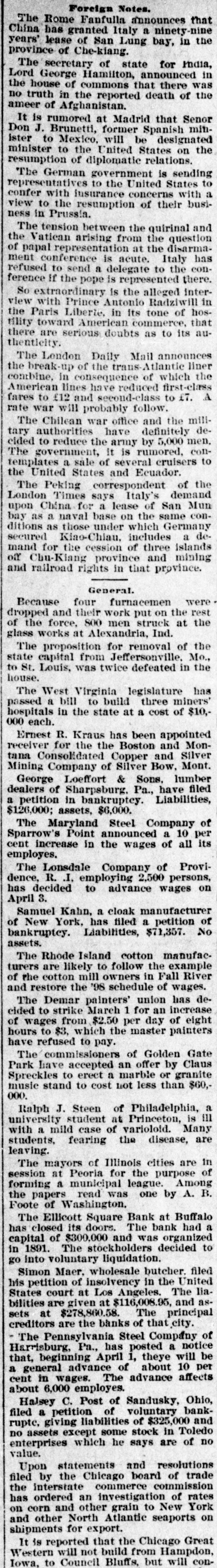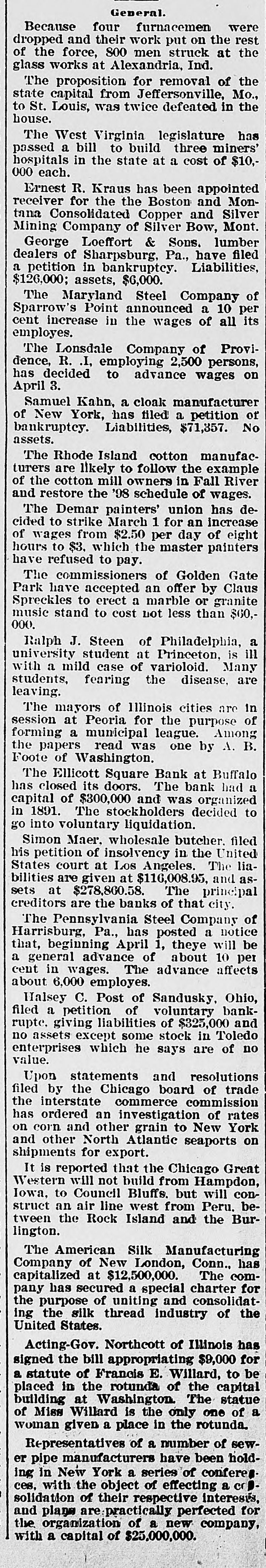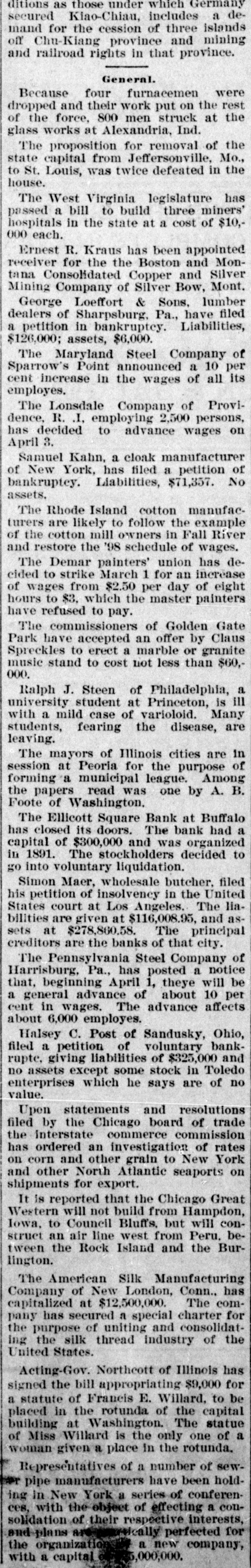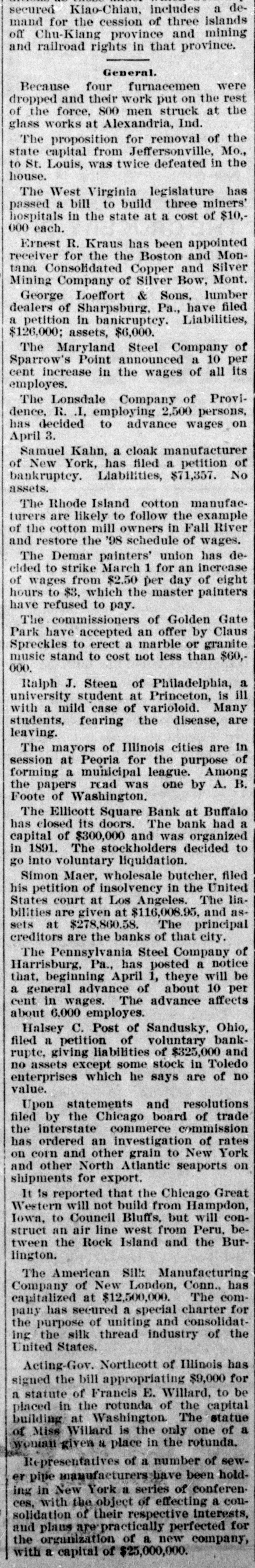 ALL AROUND THE WORLD. SUNDAY. FEB. 26. The Ellicott Square bank, Buffalo, has closed for good. It had a capital of $300,000. The stockholders decided to go into voluntary liquidation. Depositors will be paid in full. An explosion of natural gas wrecked the residence of Daniel Eckton at Walton, Ind. Two women were fatally injured. and three men were seriously injured. The American Silk Manufacturing company of New London, Conn., has been capitalized at $12,500,000. The company has secured a special charter in Connecticut for the purpose of uniting and consolidating the silk thread industry of the United States. On application of some of the stockholders, the Union Savings and Trust company, was appointed receiver for the F. Tuchfarber company, Cincinnati, manufacturers of glass and other signs. Liabilities, $70,000; assets, $175,000. MONDAY, FEB. 27. At the Greenwood Athletic club in Brooklyn Dick O'Brien of Lewiston, Me., knocked out Jack Burke of Boston in the 14th round of what was to have been a 20-round bout. Colonel Amos C. Babcock, an intimate friend of Abraham Lincoln and a prominent figure in the abolitionist movement in the early fifties, died at Chicago. He was born in New York city in 1828. Princeton university is to have a new chair of English literature, and it is confidently expected that Rev. Dr. Henry Van Dyke, now pastor of a Presbyterian church at New York, will be its first occupant. The most positive identification of Jesse James as one of the Leeds train robbers was made at Kansas City by William J. Smith of Stoksberry, Mo., who was a passenger on the Missouri Pacific the night it was held up. He pointed out Jesse James as the man who placed a gun against his breast and ordered him back into the car. TUESDAY, FEB. 28. Archbishop Vilatte of the church organization known as the Old Catholics in America, has withdrawn from that body. He submits himself to the Roman Catholic church. The Duke of Connaught, in laying the foundation stone of the English church at Assouan, on the Nile, said he took great pleasure to lay the stone of the church furtherest south in Egypt, which, he added, "will be a great godsend to our countrymen and to our brethern from the United States, who continue to come in increasing numbers to Egypt." Arrangements have been practically completed for a syndicate to control a large share of the Havana tobacco output. The new corporation is to be known as the Consolidated Tobacco company of Cuba. It will be capitalized at $12,000,000. Lorenz Weihner of New York has filed a petition in bankruptcy with liabilities of $200,753 and no available assets. Weihner was formerly an extensive builder. WEDNESDAY. MARCH 1. Maria Roof Van Evera died at Canajoharie, N. Y., aged 102 years. She was a member of the original Daughters of the Revolution. The American Brewing company of Chicago has gone into the hands of a receiver as the result of complications growing out of the Dreyer bank failure a year ago. The indebtedness of the brewing company is $100,000, in notes and open accounts, and $750,000 covered by the company's bonds. The Earl of Rosebery was elected president of the Eighty club in succession to the late Mr. Gladstone by 50 votes against 11. The election followed a lively meeting. William B. Depew, brother of Chauncey M. Depew, died at Buffalo. Mr. Depew was born in Peekskill, N. Y., in 1836. He had been actively connected with the railroad interests of Buffalo for 39 years. THURSDAY, MARCH 2. Josiah Bailey, a resident of Dickinson, N. Y., who is 95 years of age, has been renominated by the Republicans for town clerk. He is believed to be the oldest office holder in the country. It is announced that the American Pottery company will not be dissolved, as has been reported. This company was incorporated last December in New Jersey, with a capitalization of $27,000,000. It was said to control 90 percent of the entire pottery output of the world. The Maryland Steel company of Baltimore announces a 10-percent increase in the wages of employes, which restores their pay to the old rate of 1893. There are 1700 men at work, but this number, it is expected, will soon be increased to 2500. The Royal Baking Powder company, with an authorized capital of $20,000,000, was incorporated at Trenton. The company is understood to represent the consolidation of the Royal Baking Pow der company, the Cleveland Baking Powder company and the New York Baking Powder company. FRIDAY. MARCH 3. A mortgage deed for $6,000,000 was filed for record at Youngstown, O., by the Central Union Telephone company in favor of the Old Colony Trust company of Massachusetts. The mortgage bears date of Jan. 2, and is given to secure 5 percent gold bonds in the above amount. A combination of the leading paper bag manufacturers of the country was brought about at New York when the last of the stock subscriptions were deposited. The new company will be known as the Union Bag and Paper com-