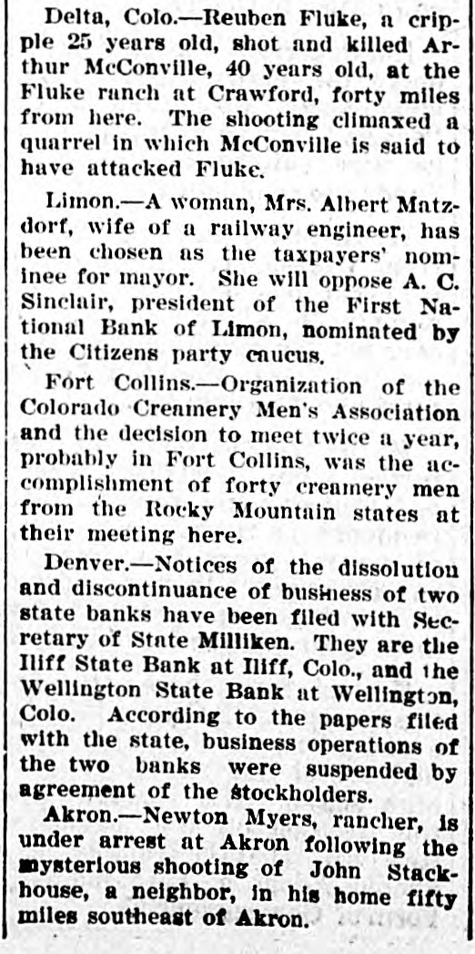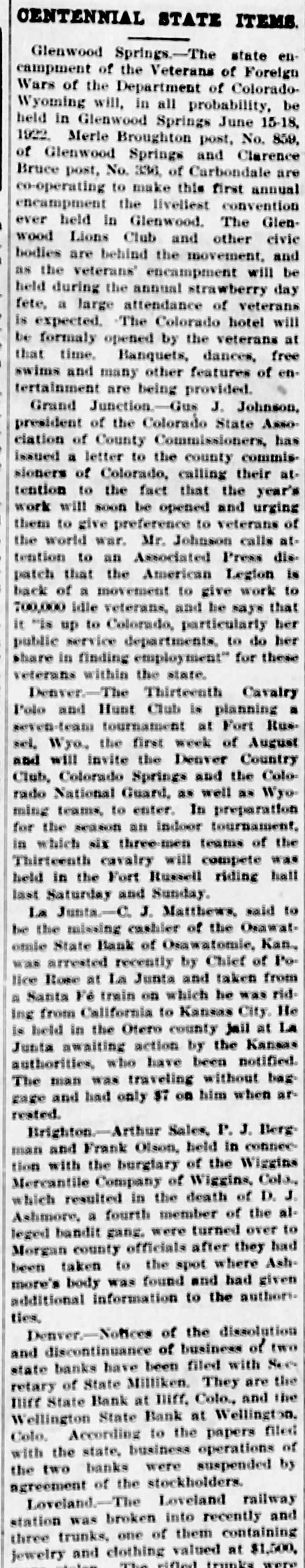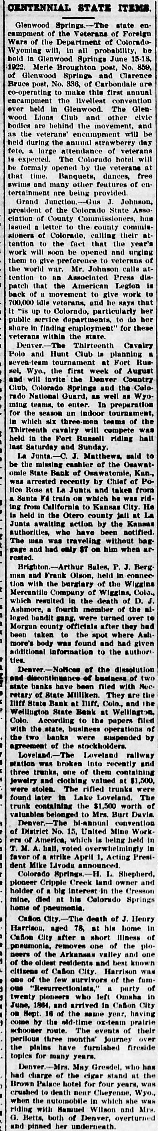CENTENNIAL STATE ITEMS. Glenwood Springs.-The state encampment of the Veterans of Foreign Wars of the Department of ColoradoWyoming will, in all probability. be held in Glenwood Springs June 15-18, 1922 Merle Broughton post, No. 859, of Glenwood Springs and Clarence Bruce post, No. 836, of Carbondale are co-operating to make this first annual encampment the livellest convention ever held in Glenwood. The Glenwood Lions Club and other civic bodies are behind the movement, and as the veterans' encampment will be held during the annual strawberry day fete, a large attendance of veterans is expected. The Colorado hotel will be formaly opened by the veterans at that time. Banquets, dances, free swims and many other features of entertainment are being provided Grand Junction.--Gus J. Johnson, president of the Colorado State Asso ciation of County Commissioners, has issued a letter to the county commissioners of Colorado, calling their attention to the fact that the year's work will soon be opened and urging them to give preference to veterans of the world war. Mr. Johnson calls attention to an Associated Press dispatch that the American Legion is back of a movement to give work to 700,000 Idle veterans, and he says that It "is up to Colorado, particularly her public service departments, to do her share in finding employment" for these veterans within the state. Denver.-The Thirteenth Cavalry Polo and Hunt Club is planning a seven-team tournament at Fort Rus sel, Wyo., the first week of August and will invite the Denver Country Club, Colorado Springs and the Colorado National Guard, as well as Wyoming teams, to enter. In preparation for the season an indoor tournament, in which six three-men teams of the Thirteenth cavalry will compete was held in the Fort Russell riding hall last Saturday and Sunday. La Junta.-C. J. Matthews, said to be the missing cashier of the Osawatomie State Bank of Osawatomie, Kan., was arrested recently by Chief of Police Rose at La Junta and taken from a Santa F6 train on which he was riding from California to Kansas City. He is held in the Otero county jall at La Junta awaiting action by the Kansas authorities, who have been notified. The man was traveling without baggage and had only ST on him when ar rested. Brighton.-Arthur Sales, P. J. Berg man and Frank Olson, held in connection with the burgiary of the Wiggins Mercantile Company of Wiggins, Colo., which resulted in the death of D. J. Ashmore, a fourth member of the alleged bandit gang. were turned over to Morgan county officials after they had been taken to the spot where Ash more's body was found and had given additional information to the author ties. Denver.-Notices of the dissolution and discontinuance of business of two state banks have been filed with Sec. retary of State Milliken. They are the Illff State Bank at Illff, Colo., and the Wellington State Bank at Wellington, Colo. According to the papers filed with the state, business operations of the two banks were suxpended by agreement of the stockholders. Loveland.-The Loveland railway station was broken Into recently and three trunks, one of them containing jewelry and clothing valued at $1,500, were stolen. The rifled trunks were found later in Lake Loveland. The trunk containing the $1,500 worth of valuables belonged to Mrs. Burt Davis Denver.-The bi-annual convention of District No. 15. United Mine Work ers of America, which is being held In M. A. hall, voted overwhelmingly in favor of a strike April 1, Acting President Mike Livoda announced. Colorado Spring*.-H L. Shepherd, pioneer Cripple Creek land owner and holder of a big Interest in the Cresson mine, died at his Colorado Springs home of pneumonia. Cafion City.-The death of J. Henry Harrison. aged 78, at his home in Cafion City after a short Illness of pneumonia, removes one of the ploneers of the Arkansax valley and one of the oldest residents and best known citizens of Cafion City. Harrison was one of the few survivors of the fain, ous "Resurrectionists." a party of twenty pioneers who left Omaha in June, 1864, and arrived In Cafion City on Sept. 16 of the name year, having come by the old-time ox-team prairie schooner route. The events of their perilous three months' Journey over the plains have furnished fireside topics for many years. Denver.-Mrs. May Greadel, who has had charge of the cigar stand at the Brown Palace hotel for four years, was crushed to death near Cheyenne, Wyo., when the automobile in which she was riding with Manuel Wilson and Mrs. G. Betts. both of Denver, overturned and pinned her underneath.