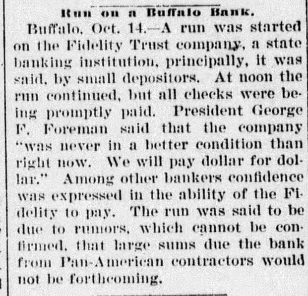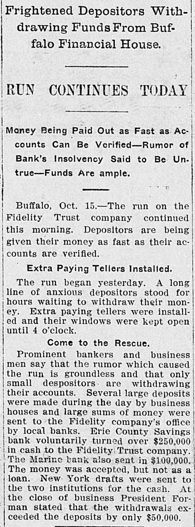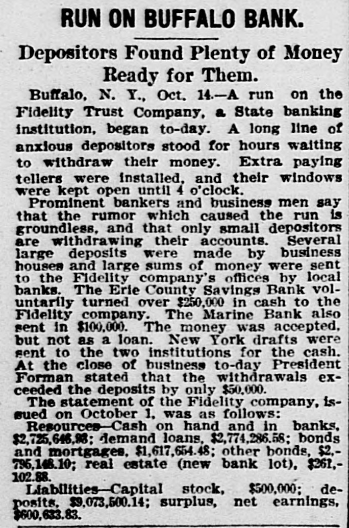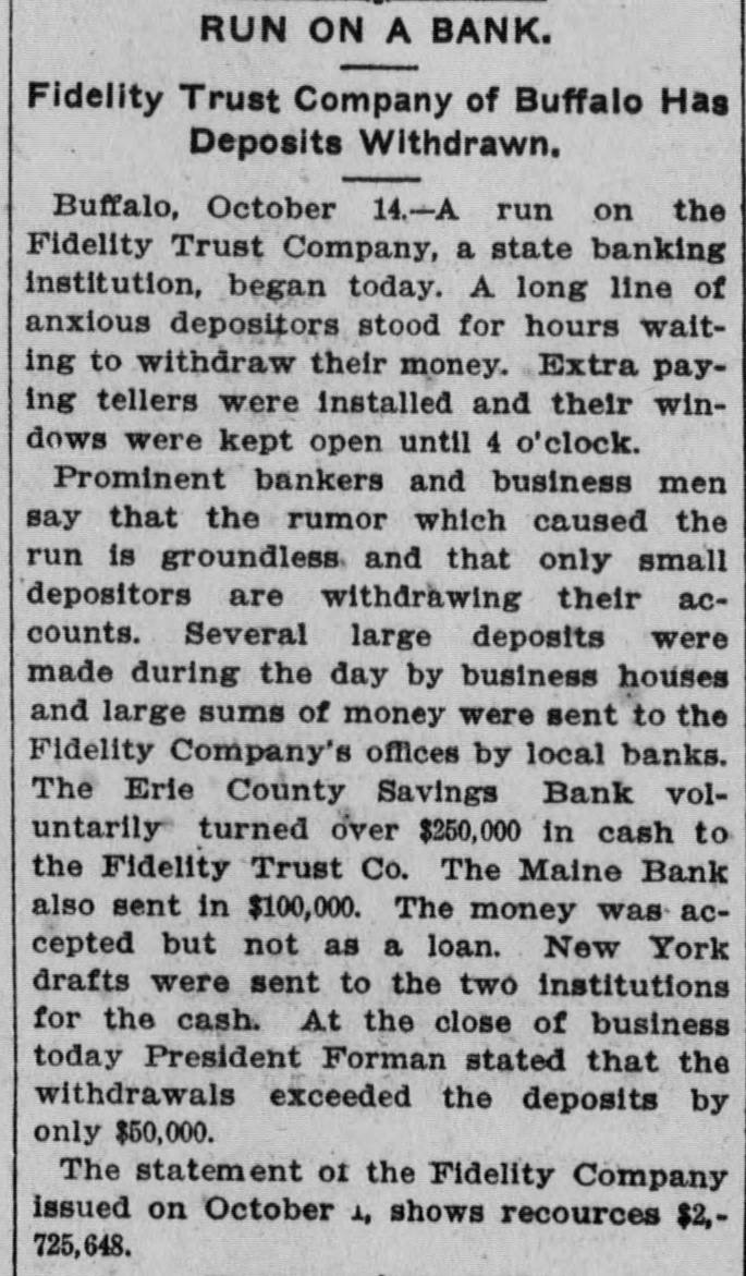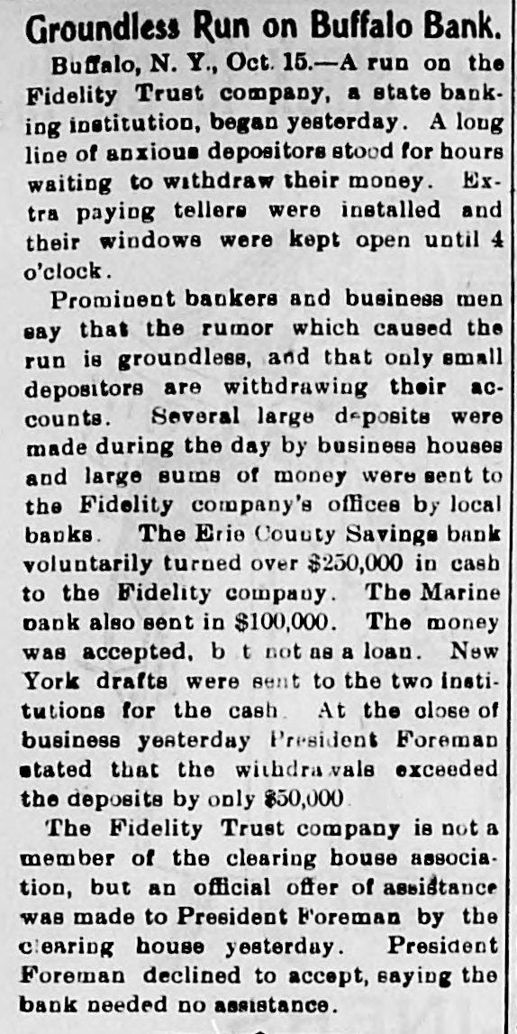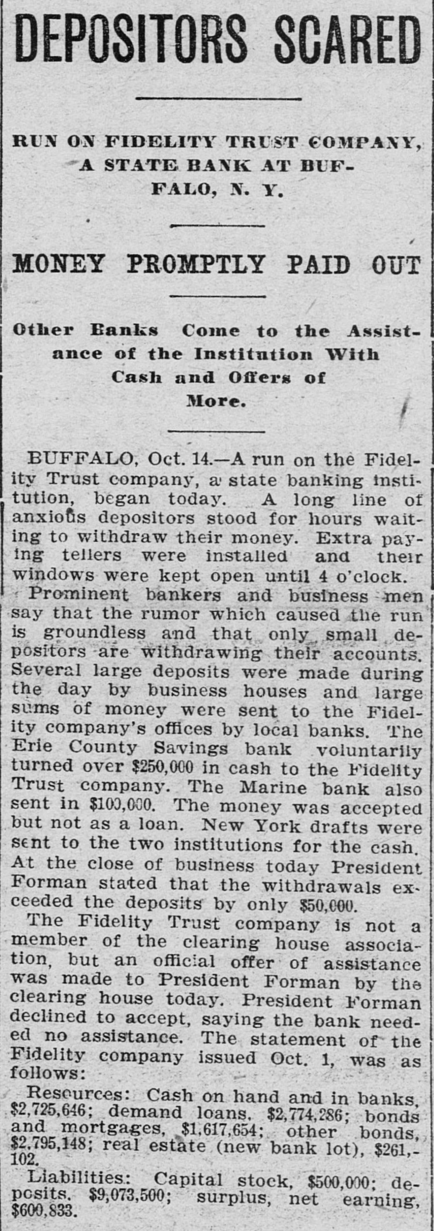 A run by small depositors on the Fidelity Trust company of Buffalo was met by the assistance of the banks of the city to such an extent as to cause the Fidelity company to stop it as they had enough.