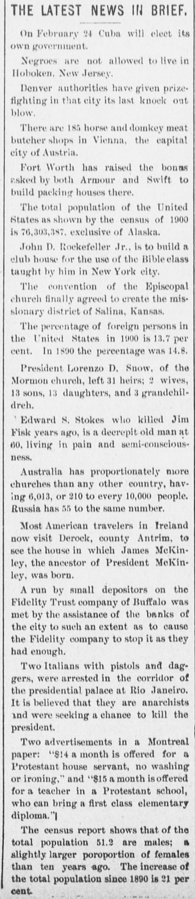 The census report shows that of the total population 51.2 are males; a slightly larger poroportion of females than ten years ago. The increase of the total population since 1890 is 21 per cent.