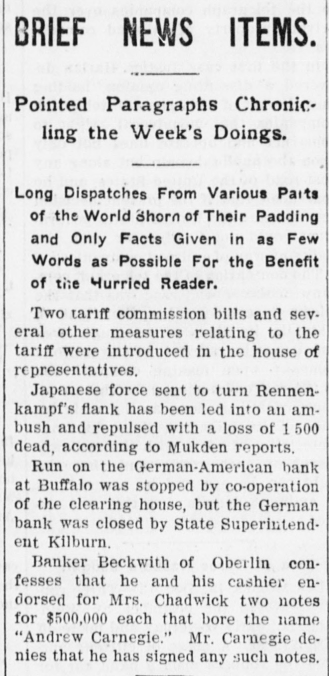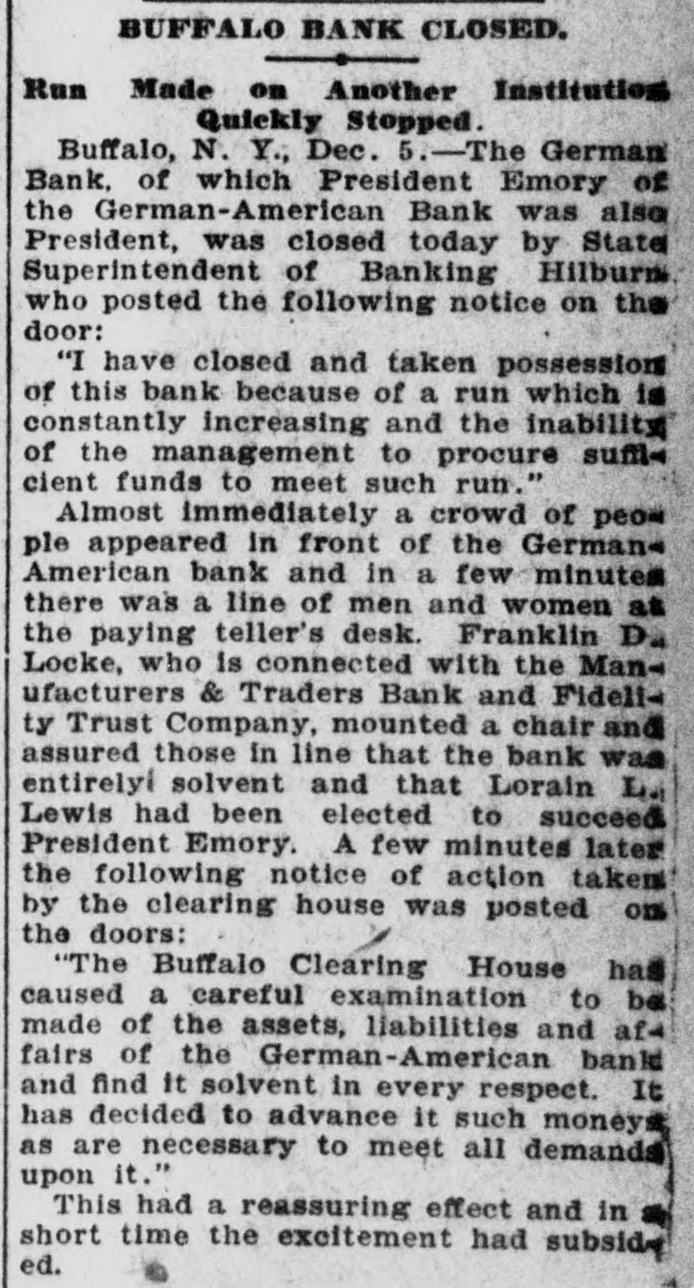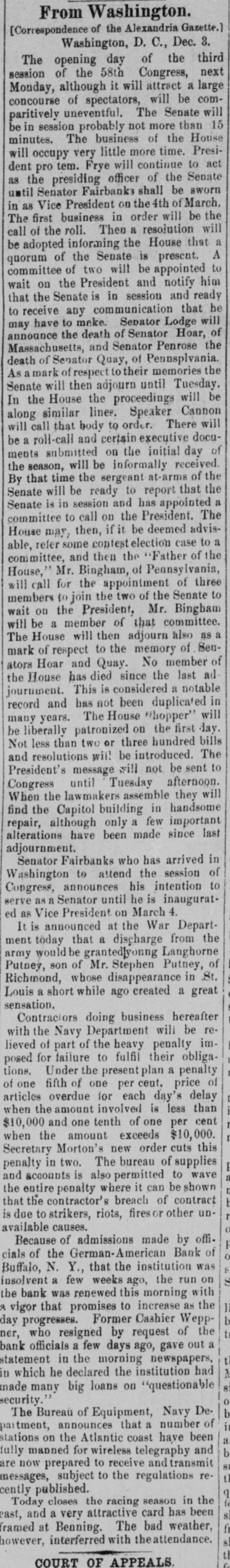 From Washington. [Correspondence of the Alexandria Gazette.] Washington, D. C., Dec. 3. The opening day of the third session of the 58th Congress, next Monday, although it will attract a large concourse of spectators, will be comparitively uneventful. The Senate will be in session probably not more than 15 minutes. The business of the House will occupy very little more time. President pro tem. Frye will continue to act as the presiding officer of the Senate until Senator Fairbanks shall be sworn in as Vice President on the 4th of March. The first business in order will be the call of the roll. Then a resolution will be adopted informing the House that a quorum of the Senate is present. A committee of two will be appointed to wait on the President and notify him that the Senate is in session and ready to receive any communication that be may have to make. Sepator Lodge will announce the death of Senator Hoar, of Massachusetts, and Senator Penrose the death of Senator Quay, of Pennsplvania. As a mark of respect to their memories the Senate will then adjourn until Tuesday. In the House the proceedings will be along similar lines. Speaker Cannon will call that body to order. There will be a roll-call and certain executive documents submitted on the initial day of the season, will be informally received. By that time the sergeant at-arms of the Senate will be ready to report that the Senate is in session and has appointed a committee to call on the President. The House may, then, if it be deemed advisable, refer some contest election case to a committee, and then the "Father of the House," Mr. Bingham, of Pennsylvania, will call for the appointment of three members to join the two of the Senate to wait on the President, Mr. Bingham will be a member of that committee. The House will then adjourn also as a mark of respect to the memory of Senators Hoar and Quay. No member of the House has died since the last ad jourument. This is considered a notable record and has not been duplicated in many years. The House "hopper" will be liberally patronized on the first day. Not less than two or three hundred bills and resolutions will be introduced. The President's message will not be sent to Congress until Tuesday afternoon. When the lawmakers assemble they will find the Capitol building in handsome repair, although only a few important alterations have been made since last adjournment. Senator Fairbanks who has arrived in Washington to attend the session of Congress, announces his intention to serve as a Senator until he is inauguratas Vice President on March 4. It is announced at the War Department today that a discharge from the army would be grantedlyonng Langhorne Putney, son of Mr. Stephen Putney, of Richmond, whose disappearance in St. Louis a short while ago created a great sensation. Contractors doing business hereafter with the Navy Department will be relieved of part of the heavy penalty imposed for failure to fulfil their obligaions. Under the present plan a penalty one fifth of one per cent. price of articles overdue for each day's delay when the amount involved is less than $10,000 and one tenth of one per cent when the amount exceeds $10,000. Secretary Morton's new order cuts this penalty in two. The bureau of supplies I as and accounts is also permitted to wave he entire penalty where it can be shown hat the contractor's breach of contract r due to strikers, riots, fires other unvailable causes. o Because of admissions made by offiP ials of the German-American Bank of o Buffalo, N. Y., that the institution was on asolvent a few weeks ago, the run on bank was renewed this morning with vigor that promises to increase as the b progresses. Former Cashier Weppti who resigned by request of the officials a few days ago, gave out a t atement in the morning newspapers, which he declared the institution had N 8 many big loans on "questionable o ecurity." b The Bureau of Equipment, Navy Deaitment, announces that a number of in ations on the Atlantic coast have been a b manned for wireless telegraphy and now prepared to receive and transmit SU ti essages, subject to the regulations reently published. 9 Today closes the racing season in the for and a very attractive card has been