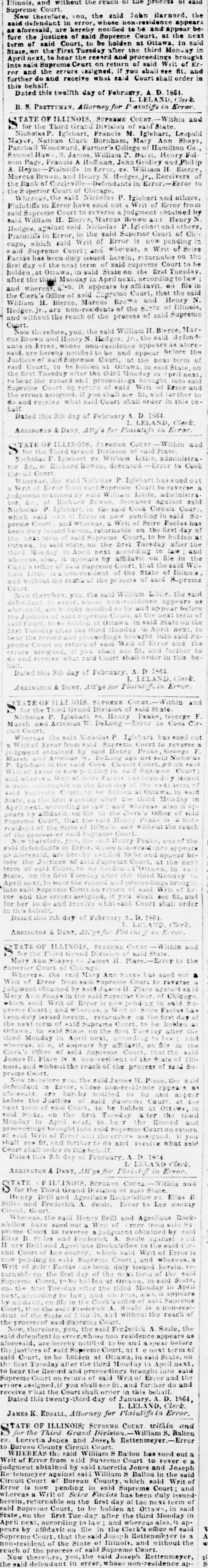 Elinois, and without the reach of the process of said Supreme Court. Now therefore, vou, the said John Barnard, the said defendant in error, whose non-residence appears as aforesaid, are hereby notified to be and appear be- fore the justices of said Supreme Court, at the next term of said Court, to be holden at Ottawa, in said State, on the First Tuesday after the third Moncay in April next, to hear the reeerd and proceedings brought ints said Supreme C Ceurt on return of said Writ of Er- ror and the errors assigned, if you shail see fit, and further do and receive what said Court shall order in this behalf. Dated this twelfth day of February, A. D. 1861. L. LELAND, Clerk B. S. PRETTYMAN, Attorney for Paintiffs in Error. STATE OF ILLINOIS, SUPREME COURT. Within and for the Third Grand Division of said State. Nicholas P. Iglchart, Francis M. Iglehart, Leopold Mayer, Nathan Clark Burnham, Mary Ann Shays, Paschall Woodward, Farmer's College of Hamilton Co., Samuel Haw, S. James, William P. Darst, Henry Fol- som Page, Francia A iloffman, John Gridley and Philip A. Heyne-Plaintiffs in Error, es. William H. Bierce, Marcus Brown, and Heary N. Hedges, jr.. Receivers of the Bank of Circleville-Defendants in Error, Error to the Superior Court of Chicago. Whereas, the said Nicholas P. Iziehart and others, Plaintiffs in Error have sued out a Writ of Error from said Supreme Court to reverse a judgment obtained by said William H. Bierce, Marcus Brown and Henry N. Hedges, against said Nicholas P. Iglehart and others, Plaintiffs in Error, in the said Superior Court of Chi cago, which said Writ of Error is now pending in said Supreme Court; and whereas, a Writ of Scire Facias has been duly issued herein, returnable on the first day of the next term of said supreme Court to be holden at Ottawa, in said State on the first Tuesday, after the third Monday in April next, necording to law; and whereas, also, it appears by affilavit. on file in the Clerk's Office of said Supreme Court, that the said William H. Bierce, Marcus reus Browa and Henry N. Hedges, jr., ars non-residents of the Siste of Illinois, and without the reach of the process of said Supreme Court. Now therefore, you, the said William H. Bierce, Mar- cus Brown and Henry N. Hedges, jr., the said defend- ants in Error, whose non-residence appears as alore- said, are hereby notifßel to be and appear before the Justices of sald Supreme Court, at the next term of said Court, to be holden at Ottawa, in said State, on the first Tuesday after the third Monday in april next, to hear the record and proceedings brought into said Supreme Court op return of said Writ of of Error Er and the errors assigned, if you shall see fit, and further to do and receive what said Court shall order in this be- balf Dated this 9th day of February A. D. 1864. L. LELAND, Clerk. ARRINGTON & DEST, Atty's for Plaintiffs in Error. STATE OF ILLINOIS, SUPREME COURT Within and for the Third Grand Division of said State. Nicholas P. Izlehart vs. Wiliam Little, administra- tor &c., or Richard Bowen, deceased. Error to Cook Circuit Court. Whereas, the said Nicholas P. Iglehart has sued out a Writ of Error from sald Supreme Court to reverse a judgment oitained by said William Little, administra- tor, &c., of Richard Bowen, deceased against said Nicholas P. Izlehart, in the said Cook Circuit Court, which said rit of Error is now pending in said Su- preme Court; and whereas, a Writ of Seire Facias has been duty issued herein, returnable on the first day of the next term of said Supreme Court, to be holden at Ottawa, in said state, on the first Tuesday after the third Monday in April next according to law; and whereas, also, it appears by affidavit on file in the Cleric's Office of said Supreme Court, that the said Wil- liam Little is a non-resident of the State of Illinois, and without the reath of the process of said Supreme Court. Now therefore, you, the said William Little, the said defendant in error, whose non-residence appears as aforesaid, are hereby notified to be and appear before the Justices of sald Supreme Court, at the next term of said Court, to be holden at Ottawa, in said State on the first Tuesday after the third Monday in April next, to bear the record and proceedings brought into said Su- preme Court on return of said Writ of Error and the errors assigned, if you shall see fit, and further to do and receive what said Court shall order in this be- half. L. LELAND, Clerk. Dated this 9th day of February, A. D. 1564. ARRINGTON & DEST, Att'ys for Plaintiffs in Error. STATE OF ILLLIOIS, SUPREME COURT. Within and for the Third Grand Division of said State. Nicholas P. Igicharts. Henry leake, George F. Marsh and Artemas W. DeLong-Error to Cook Cir- cuit Court. Whereas the said Nickolas P. Iglchart has sued out a Writ of Error from said Supreme Court to reverse a Judgment obtained by said Henry Peake, George F. Marsh and Artemas w. DeLong against said Nicho'as P. Iglehart in the said Cook Cacuit Court, which said Writ of Error is now penting is said Supreme Court; and wherasa Writ of Scire Facias has been day issued acrein, returnable on the first day of the next term of said Supreme Court, to be holden at Ostawa, in said State, on the first Tuesday after the third Monday in April next, according to law; and whereas, also it ap pears by affidavit, on file in the Jierk's Office of said Supreme Court, that the said Henry Peake is a non- resident of the State of Illinois, and without the reach of the process of said sand Supreme Court. Now therefore, you, the sad Henry Peake, one of the asid defendants in Error, whose non-residence appeara as aforesaid, are hereby tied to be and appear be- fore the Justices of said Zupreme Court, at the next term of sald Court, to be hoiden at Ottawa, in ea State, on the first Tuesday after the third Monasy in April next, to hear the record and proceedings brought into said Supreme Court on return Writ Er ror and the errors assigned, if you shali 