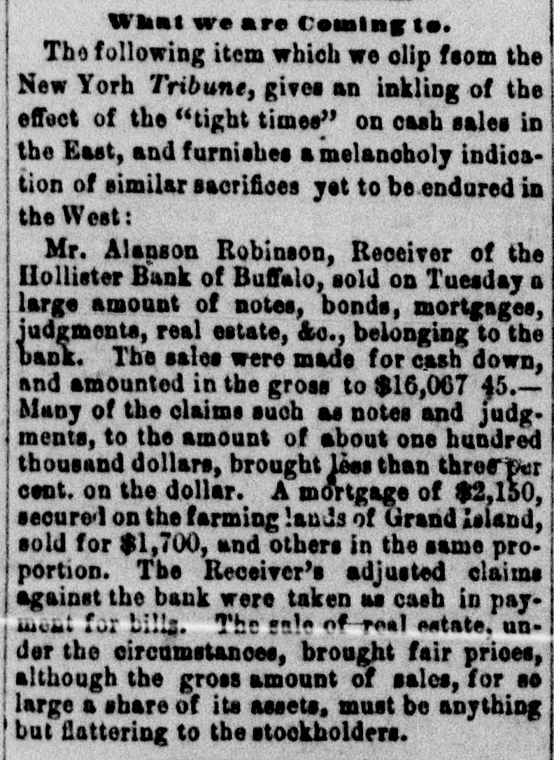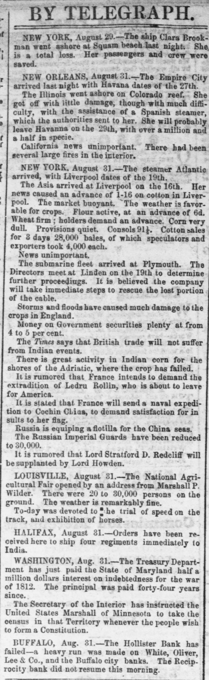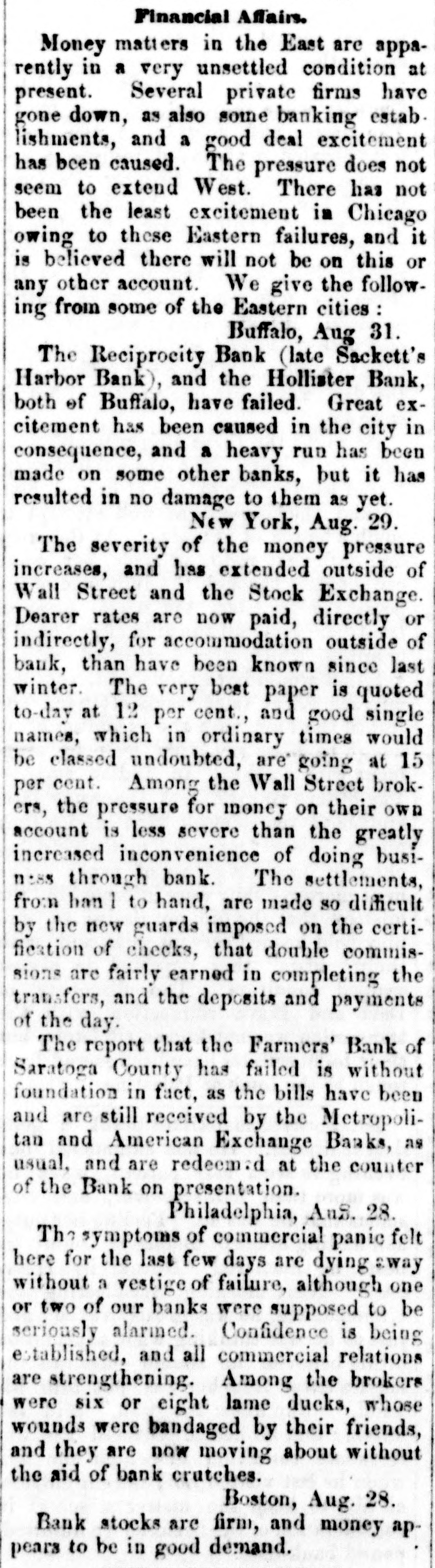 SUSPENSIONS, FAILURES, ASSIGNMENTS [From the Independent, Sept. 3.] The following are the reported failures, assignments, &c., for the week:Crawford & Darforth, Concord, N И., suspended. Jefferson Ktowler, Man chester, N. H, filled. Benjamin A. Smith, Boston, Mass, suspended. Mechanics' Banking Association, New York city, waspended. Beebe & Co, bankers, New York city, suspended. Atwood & Co., bankers, New York city, suspended. J. H. Prentice, hats, New York city, suspensed; liabilities large, but a surplas of about $600,000, and will undoubtedly soon resume. Adams & Buckingham, flour, New York city, suspend. ed; have large surplus, and will probably BOOD resume. Williams, Stevens & Williams, New York city, failed. Ja. & J. O. Secor, founders, New York city, suspended; liabilities large-offer forty cents secured. John Thompson, brower, New York city, before reported, has assigned to Platt Adams. Goldsmith & Gutman, cloths, New York city, suspended; liabilities said about $100,000. Chambers & Heiser, New York city, fatted and Msigned. Henry Antler, clothing, New York city failed. Louis Wusterman, furs, New York city, failed. John Allen, New York city, falled. J. L Wycoff, Williamsburg, N. Y., failed. John W. Bates, broker, Troy, N. Y., suspended. Reciprocity Bank, Baffalo, N. Y., suspended tempora. rily. Hollister Bank, Buffalo. N. Y., suspended. Swartz Iron Works, Buifalo, N Y., assigned. Wm Flanagan, Buffalo, N. failed. John C. Crosby, Buffaio, N. X., assigned. Drury & Monell, Delphi, N. Y., falled. W. & H. Dollman, Salima, N. Y., failed. W. I. Coyler, Ouylersville, N. Y., suspended; Habilities said about $90,000. Shephen Childs, New Hartford, N. Y, assigned. Harvey Pierce, Essex county, N. Y., assigned. B ceze, Kneeland & Co., locometives, Jersey any, N. 3., suspended. Relph Lee, Camden, N. J., failed. Noam & Gaddis, Hightstown, NJ, alled Jacob Sline, "D G.,' Philadelphia, Penn., fail d. chark & Do, Trement, Penn., failed. Flatas & Lohman, fancy goods, Bakinrore, Maryland, failed B. Wallack, Baltimore, Md., assigned. Thereton & Ely, Louisville, Kg, assigned H. Harmon, Marion, Ohio, assigned. Robert & Moffait, Cincinnati, Oalo, assigned. Casper Bess, Dayton, Ohio, failed. Wm. Ward Easton, Obicago, III.. suspended. signed. Adams & Herrick, New Bedford, III., falled and m. J. B. Smith, Urbana, IH., sold out. James I. Lyell, banker, Detroit, Mich, suspended. Burne & Wheeler, Signaw City, Mich, failed. Reibschilds & Bro, Muscatine, Iowa, failed. S. T. & R. Largley, Gallipolis, Ohio, reported some time since as suspended and assigned, have obtained an exten-