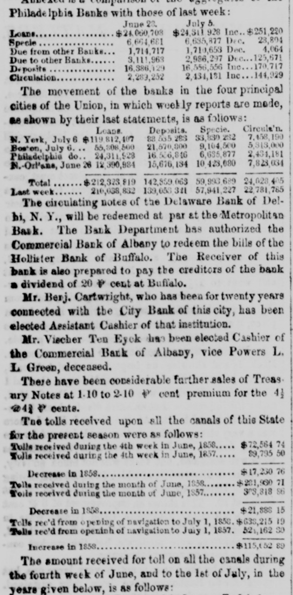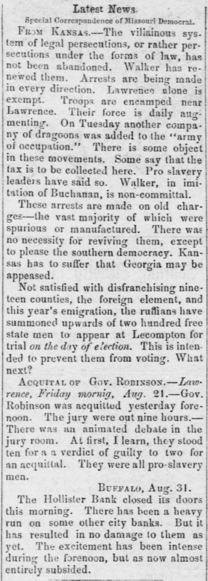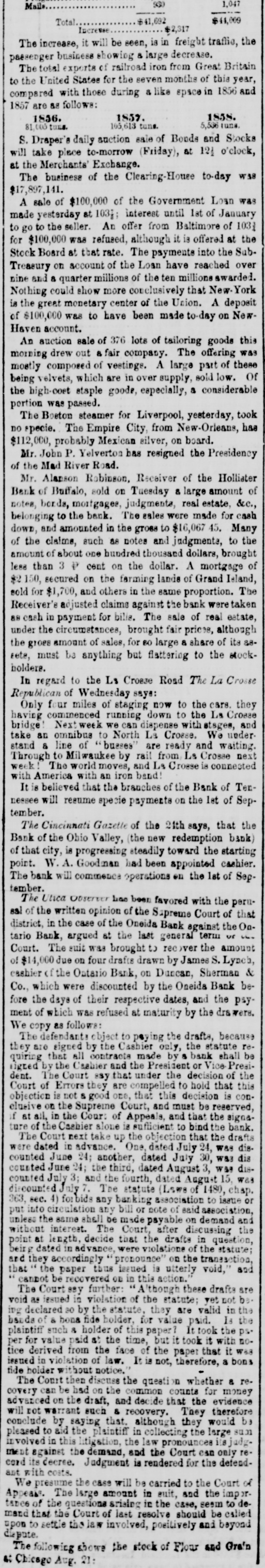 SUSPENSIONS, FAILURES, ASSIGNMENTS [From the Independent, Sept. 3.] The following are the reported failures, assignments, &c., for the week:Crawford & Darforth, Concord, N И., suspended. Jefferson Ktowler, Man chester, N. H, filled. Benjamin A. Smith, Boston, Mass, suspended. Mechanics' Banking Association, New York city, waspended. Beebe & Co, bankers, New York city, suspended. Atwood & Co., bankers, New York city, suspended. J. H. Prentice, hats, New York city, suspensed; liabilities large, but a surplas of about $600,000, and will undoubtedly soon resume. Adams & Buckingham, flour, New York city, suspend. ed; have large surplus, and will probably BOOD resume. Williams, Stevens & Williams, New York city, failed. Ja. & J. O. Secor, founders, New York city, suspended; liabilities large-offer forty cents secured. John Thompson, brower, New York city, before reported, has assigned to Platt Adams. Goldsmith & Gutman, cloths, New York city, suspended; liabilities said about $100,000. Chambers & Heiser, New York city, fatted and Msigned. Henry Antler, clothing, New York city failed. Louis Wusterman, furs, New York city, failed. John Allen, New York city, falled. J. L Wycoff, Williamsburg, N. Y., failed. John W. Bates, broker, Troy, N. Y., suspended. Reciprocity Bank, Baffalo, N. Y., suspended tempora. rily. Hollister Bank, Buffalo. N. Y., suspended. Swartz Iron Works, Buifalo, N Y., assigned. Wm Flanagan, Buffalo, N. failed. John C. Crosby, Buffaio, N. X., assigned. Drury & Monell, Delphi, N. Y., falled. W. & H. Dollman, Salima, N. Y., failed. W. I. Coyler, Ouylersville, N. Y., suspended; Habilities said about $90,000. Shephen Childs, New Hartford, N. Y, assigned. Harvey Pierce, Essex county, N. Y., assigned. B ceze, Kneeland & Co., locometives, Jersey any, N. 3., suspended. Relph Lee, Camden, N. J., failed. Noam & Gaddis, Hightstown, NJ, alled Jacob Sline, "D G.,' Philadelphia, Penn., fail d. chark & Do, Trement, Penn., failed. Flatas & Lohman, fancy goods, Bakinrore, Maryland, failed B. Wallack, Baltimore, Md., assigned. Thereton & Ely, Louisville, Kg, assigned H. Harmon, Marion, Ohio, assigned. Robert & Moffait, Cincinnati, Oalo, assigned. Casper Bess, Dayton, Ohio, failed. Wm. Ward Easton, Obicago, III.. suspended. signed. Adams & Herrick, New Bedford, III., falled and m. J. B. Smith, Urbana, IH., sold out. James I. Lyell, banker, Detroit, Mich, suspended. Burne & Wheeler, Signaw City, Mich, failed. Reibschilds & Bro, Muscatine, Iowa, failed. S. T. & R. Largley, Gallipolis, Ohio, reported some time since as suspended and assigned, have obtained an exten-