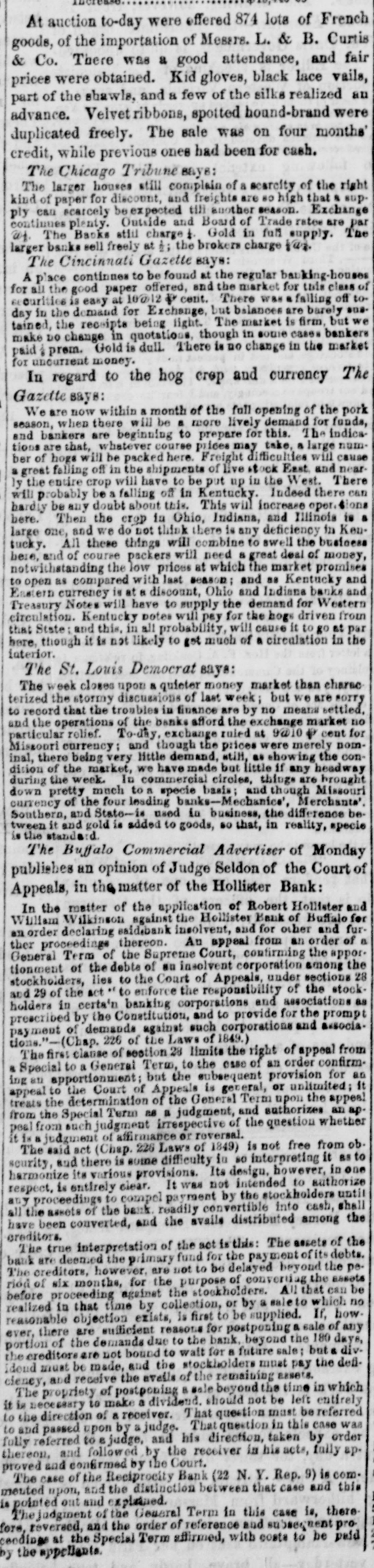 At auction to-day were offered 874 lota of French goods, of the importation of Messre. L. & B. Curtis & Co. There was a good attendance, and fair prices were obtained. Kid gloves, black lace vails, part of the shawle, and a few of the silks realized an advance. Velvet ribbons, spotted bound-brand were duplicated freely. The sale was on four months credit, while previous ones had been for cash. The Chicago Tribune says: The larger houses still complain of a scarcity of the right kind of paper for discount, and freights are 80 high that & sup. ply can scarcely be expected till another season. Exchange continues plenty. Outside and Board of Trade rates are par wt. The Banks still charge 1. Gold in full supply. The larger banks sell freely at #: the brokers charge Var. The Cincinnati Gazette says: A place continues to be found at the regular bar king-houses for all the good paper offered, and the market for this class of securities is easy at 10012 & cent. There was a failing off today in the demand for Exchange, but balances are barely and tained, the receipts being light. The market is firm, but we make DO change in quotations, though in some cases bankers paid prem. Gold is dull. There is no change in the market for uncurrent money. In regard to the hog crop and currency The Gazette says: We are now within a month of the full opening of the pork season, when there will be a more lively demand for funds, and bankers are beginning to prepare for this. The indications are that, whatever course prices may take, a large number of hogs will be packed here. Freight difficulties will cause great falling off in the shipments of live st lock East and nearly the entire crop will have to be put up in the West. There will probably be a falling off in Kentucky. Indeed there can hardly be any doubt about this. This will increase open. ions a here. Then the crop in Ohio, Indiana, and Illinois is large one, and we do not think there is any deficiency in Kentucky. All these things will combine to swell the business here, and of course packers will need a great deal of money, notwithstanding the low prices at which the market promises open as compared with last season and as Kentucky and Eastern currency is at a discount, Ohio and Indiana banks and Treasury Notes will have to supply the demand for Western circulation. Kentucky notes will pay for the hogs driven from that State and this, in all probability, will cause it to go at par here, though it is not likely to gst much of a circulation in the interior. The St. Louis Democrat says: The week closes upon a quieter money market than charge terized the stormy discussions of last week; but we are sorry to record that the troubles in finance are by no means settled and the operations of the banks afford the exchange market no particular relief. To-day. exchange ruled at 9@10 ₽ cent for Missouri currency; and though the prices were merely nominal, there being very little demand, still, as showing the condision of the market, we have made but little if any headway during the week. In commercial circles, things are brought down pretty much to a specie basis; and though Missouri currency of the four leading banks-Mechanice', Merchants' Southern, and State-in used in business, the difference be tween it and gold is added to goods, so that, in reality, specie is the standard The Buffalo Commercial Advertiser of Monday an of of in the matter Appeals, publishes opinion of Judge the Hollister Seldon of Bank: the Court In the matter of the application of Robert Hollister and William Wilkinson against the Hollister Bank of Buffalo for on order declaring said.bank insolvent, and for other and further proceedings thereon. An appeal from an order of a General Term of the Supreme Court, confirming the appor. tionment of the debts of an insolvent corporation among the stockholders, lies to the Court of Appeals, under sections 28 and 29 of the act to enforce the responsibility of the stock holders in certa'n banking corporations and associations as prescribed by the Constitution, and to provide for the prompt payment of demands against such corporations and associations."-(Chap. 226 of the Laws of 1849.) The first clause of section 28 limits the right of appeal from Special to a General Term, to the esse of an order confirm& apportionment; but the subsequent provision for as ingan to the Court of Appeals is general, or unlimited; it appeal the determination of the General Term upon the appeal from treats the Special Term as a judgment, and authorizes an ap. pealfrom auch judgment irrespective of the question whether judgment of affirmance or reversal. The said act (Chap. 226 Laws of 1849) is not free from ob. and there is some difficulty in so interpreting it in as one to harmonize security, its various provisions. Its design. however, is entirely clear. It was not intended to authorize until respect, proceedings to compel payment by the stockholders shall any all assets of the bank. readily convertible into cash, the have the been converted, and the avails distributed among creditors. true interpretation of the act this: The assets of debts. the The deemed the primary fund for the payment of its bank The creditors, are however, are not to be delayed beyond the pe. of six months, for the purpose of converting the assets be before riod proceeding against the stockholders. All that which can no that time by collection, or by a sale exists, is first to be are sufficient reasons for postposing & reasonable realized there in objection supplied. sale 180 If, of days, how any ever, of the demands due to the bank, beyond the divportion creditore are not bound to wait for 8 future sale: but & defithe idend must be made, and the stockholders must pay the cieney, and receive the aveils of the remaining assets. The propriety of postponing beyond the time in which is necessary to make a dividend. should not be left entirely it the direction of a receiver. That question must be referred 