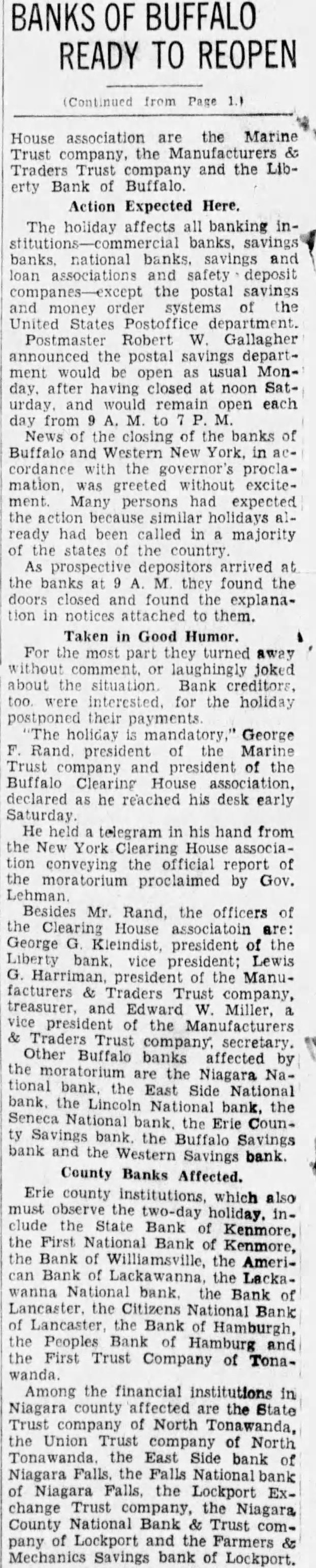 BANKS OF BUFFALO READY TO REOPEN 1.1 House are Marine Trust company. company and the Liberty Bank of Buffalo. Action Expected Here. The holiday affects banking national and associations and safety deposit postal savings and systems the United States Postoffice Postmaster Robert Gallagher announced postal savings department open closed and remain open each day banks Buffalo and York, cordance with proclamation, greeted without excitement. Many persons expected the holidays ready had been called majority the states the country. As the they found the tion in them. Taken in Good Humor. For turned joked about situation Bank too. the holiday payments. holiday George Rand. president Marine Trust and president the Buffalo he reached his early telegram in his hand from the York the official of the moratorium proclaimed by Gov. Besides Mr. Rand, the officers the House are: George Kleindist, president the president: Lewis the ManuTraders Miller, the Trust Other Buffalo banks affected the are the Niagara the East National bank. the Erie Counthe Buffalo Savings and Savings bank. County Banks Affected. Erie county institutions, which also two-day holiday. inState Bank Kenmore, the First Bank Kenmore, the Bank the Amerithe LackaLancaster, the Bank Hamburgh, the Peoples Bank Trust Company of Tonawanda. Among the financial institutions in Niagara are the Trust company North Tonawanda, Union company of North Niagara the the Lockport Exchange Trust Niagara County National Bank pany the Farmers Savings bank of Lockport.