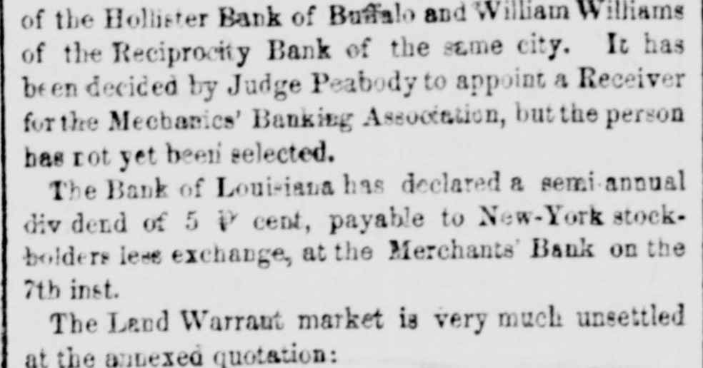 of the Hollister Bank of Buffalo and William Williams of the Reciprocity Bank of the same city. It has be en decided by Judge Peabody to appoint a Receiver for the Mechanics' Banking Association, but the person has not yet been selected. The Bank of Louisiana has declared a semi-annual div dend of 5 P cent, payable to New-York stockbolders less exchange, at the Merchants' Bank on the 7th inst. The Land Warraut market is very much unsettled at the annexed quotation: