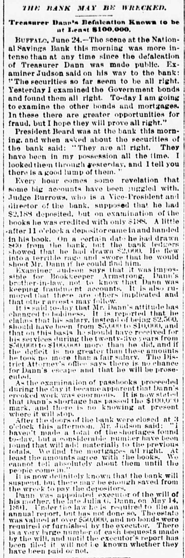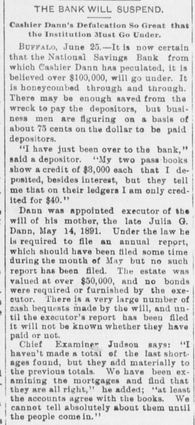 THE BANK WILL SUSPEND. Cashier Dann's Defalcation So Great that the Institution Must Go Under. BUFFALO, June 25.-It is now certain that the National Savings Bank from which Cashier Dann has peculated, it is believed over $100,000, will go under. It is honeycombed through and through. There may be enough saved from the wreck to pay the depositors, but business men are figuring on a basis of about 75 cents on the dollar to be paid depositors. "I have just been over to the bank," said a depositor. "My two pass books show a credit of $3,000 each that I deposited, besides interest, but they tell me that on their ledgers I am only credited for $40." Dann was appointed executor of the will of his mother, the late Julia G. Dann, May 14, 1891. Under the law he is required to file an annual report, which should have been filed some time during the month of May but no such report has been filed. The estate was valued at over $50,000, and no bonds were required or furnished by the executor. There is a very large number of cash bequests made by the will, and until the executor's report has been filed it will not be known whether they have paid or not. Chief Examiner Judson says: "I haven't made a total of the last shortages found, but they add materially to the previous totals. We have been examining the mortgages and find that they are all right," he added; "at least the accounts agree with the books. We cannot tell absolutely about them until the people come in."