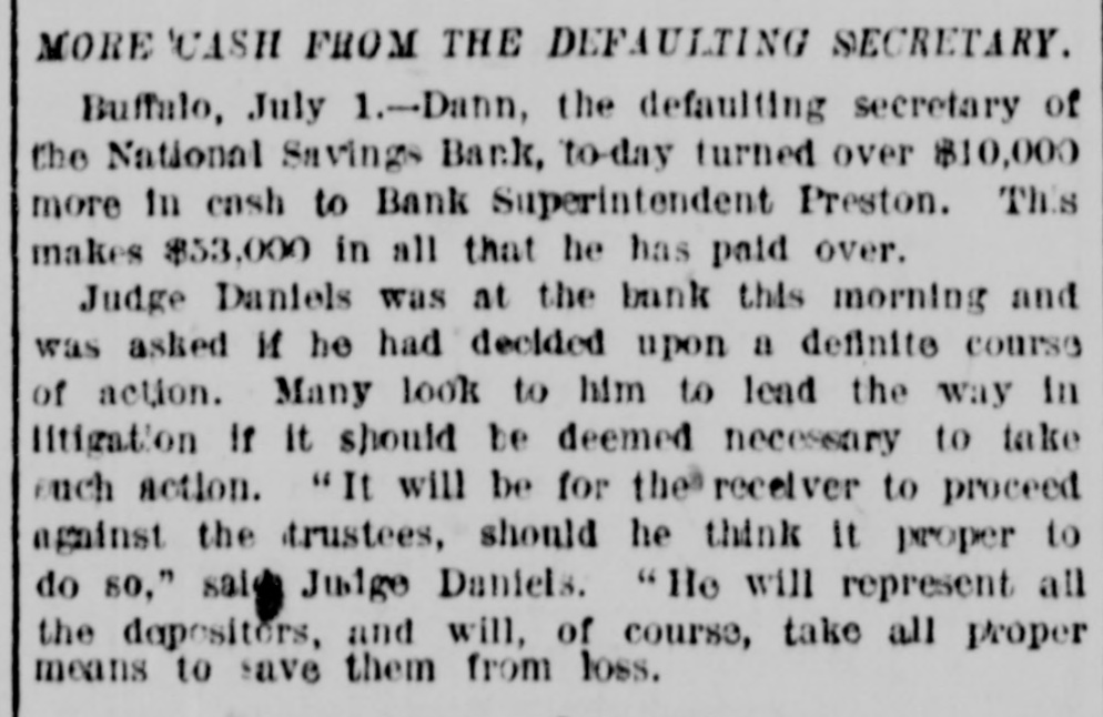 MORE CASH FROM THE DEFAULTING SECRETARY. Buffalo, July 1.-Dann, the defaulting secretary of the National Savings Bank, to-day turned over $10,000 more in cash to Bank Superintendent Preston. This makes $53,000 in all that he has paid over. Judge Daniels was at the bank this morning and was asked if he had decided upon a definite course of action. Many look to him to lead the way In litigation If It should be deemed necessary to take such action. "It will be for the receiver to proceed against the trustees, should he think it proper to do so," sai Judge Daniels. "He will represent all the depositors, and will, of course, take all proper means to save them from loss.
