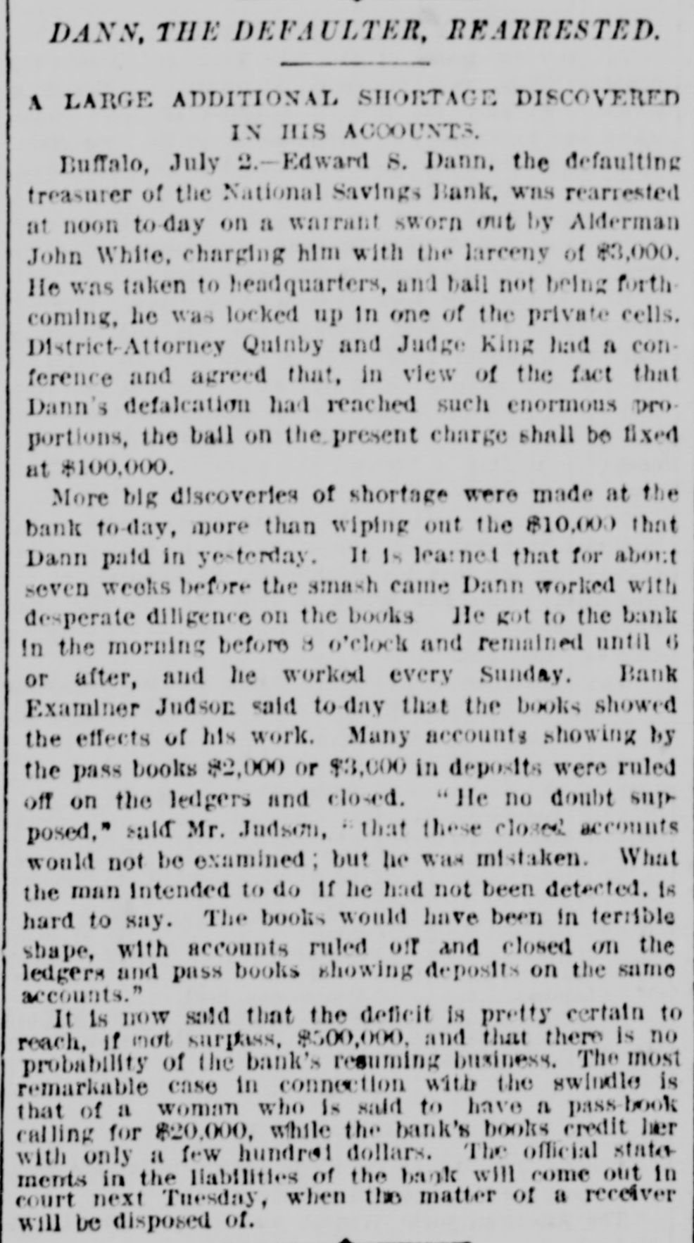 DANN, THE DEFAULTER, REARRESTED. A LARGE ADDITIONAL SHORTAGE DISCOVERED IN HIS ACCOUNTS. Buffalo, July 2.-Edward S. Dann, the defaulting treasurer of the National Savings Bank, was rearrested at noon to-day on a warrant sworn out by Alderman John White, charging him with the larceny of $3,000. He was taken to headquarters, and ball not being forthcoming, he was locked up in one of the private cells. District-Attorney Quinby and Judge King had a conference and agreed that, in view of the fact that Dann's defalcation had reached such enormous proportions, the ball on the present charge shall be fixed at $100,000. More big discoveries of shortage were made at the bank to-day, more than wiping out the $10,000 that Dann paid in yesterday. It 18 learned that for about seven weeks before the smash came Dann worked with desperate diligence on the books He got to the bank In the morning before 8 o'clock and remained until 6 or after, and he worked every Sunday. Bank Examiner Judson said to-day that the books showed the effects of his work. Many accounts showing by the pass books $2,000 or $3,000 in deposits were ruled off on the ledgers and closed. "He no doubt supposed," said Mr. Judson, "that these closed accounts would not be examined; but he was mistaken. What the man Intended to do If he had not been detected. is hard to say. The books would have been in terrible shape, with accounts ruled off and closed on the ledgers and pass books showing deposits on the same accounts." It is now sald that the deficit is pretty certain to reach, if not surpass, $500,000, and that there is no probability of the bank's resuming business. The most remarkable case in connection with the swindle is that of a woman who is said to have a pass-book calling for $20,000, while the bank's books credit her with only a few hundred dollars. The official statements in the liabilities of the bank will come out in court next Tuesday, when the matter of a receiver will be disposed of.