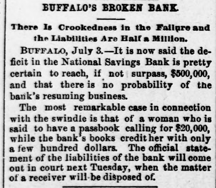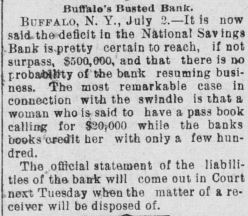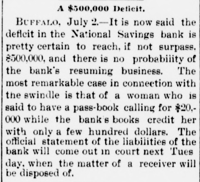 Buffalo's Busted Bank. BUFFALO, N. Y., July 2.-It is now said the deficit in the National Savings Bank is pretty certain to reach, if not surpass, $500,000, and that there is no probability of the bank resuming business. The most remarkable case in connection with the swindle is that a woman who is said to have a pass book calling for $20,000 while the banks books credit her with only a few hundred. The official statement of the liabilities of the bank will come out in Court next Tuesday when the matter of a receiver will be disposed of.