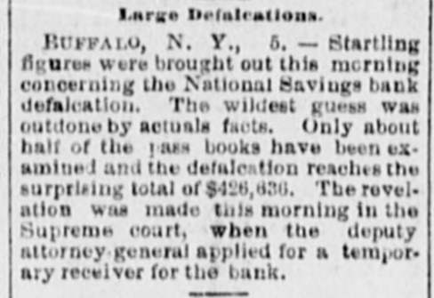 Large Defalcations. BUFFALO, N. Y., 5. - Startling figures were brought out this morning concerning the National Savings bank defalcation. The wildest guess was outdone by actuals facts. Only about half of the pass books have been examined and the defalcation reaches the surprising total of $426,636. The revelation was made this morning in the Supreme court, when the deputy attorney. general applied for a temporary receiver for the bank.