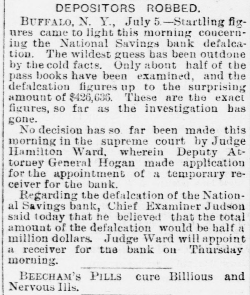 DEPOSITORS ROBBED. BUFFALO, N. Y., July 5.-Startling figures came to light this morning concerning the National Savings bank defalcation. The wildest guess has been outdone by the cold facts. Only about half of the pass books have been examined, and the defalcation figures up to the surprising amount of $426,636. These are the exact figures, so far as the investigation has gone. No decision has SO far been made this morning in the supreme court by Judge Hamilton Ward, wherein Deputy Attorney General Hogan made application for the appointment of a temporary receiver for the bank. Regarding the defalcation of the National Savings bank, Chief Examiner Judson said today that he believed that the total amount of the defalcation would be half a million dollars. Judge Ward will appoint a receiver for the bank on Thursday morning. BEECHAM'S PILLS cure Billious and Nervous Ills.