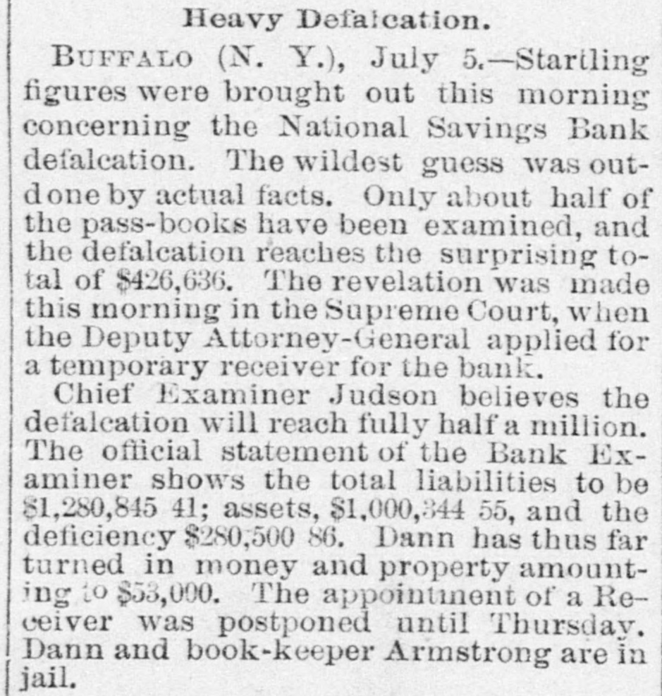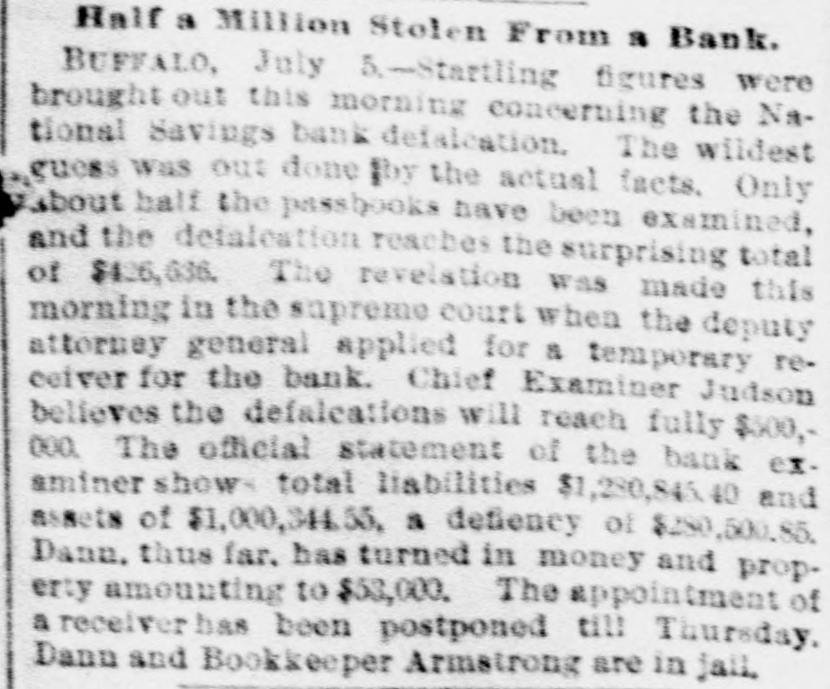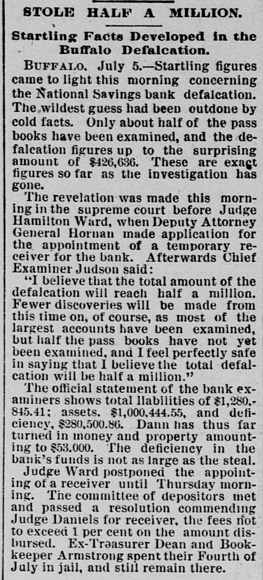 STOLE HALF A MILLION. Startling Facts Developed in the Buffalo Defalcation. BUFFALO. July 5.-Startling figures came to light this morning concerning the National Savings bank defalcation. The wildest guess had been outdone by cold facts. Only about half of the pass books have been examined, and the defalcation figures up to the surprising amount of $426,636. These are exact figures so far as the investigation has gone. The revelation was made this morning in the supreme court before Judge Hamilton Ward, when Deputy Attorney General Hornan made application for the appointment of a temporary receiver for the bank. Afterwards Chief Examiner Judson said: "I believe that the total amount of the defalcation will reach half a million. Fewer discoveries will be made from this time on, of course, as most of the largest accounts have been examined, but half the pass books have not yet been examined, and I feel perfectly safe in saying that I believe the total defalcation will be half a million." The official statement of the bank examiners shows total liabilities of $1,280.845.41; assets. $1,000,444.55, and deficiency, $280,500.86. Dann has thus far turned in money and property amounting to $53,000. The deficiency in the bank's funds is not as large as the steal. Judge Ward postponed the appointing of a receiver until Thursday morning. The committee of depositors met and passed a resolution commending Judge Daniels for receiver, the fees not to exceed 1 per cent on the amount disbursed. Ex-Treasurer Dean and Bookkeeper Armstrong spent their Fourth of July in jail, and still remain there.