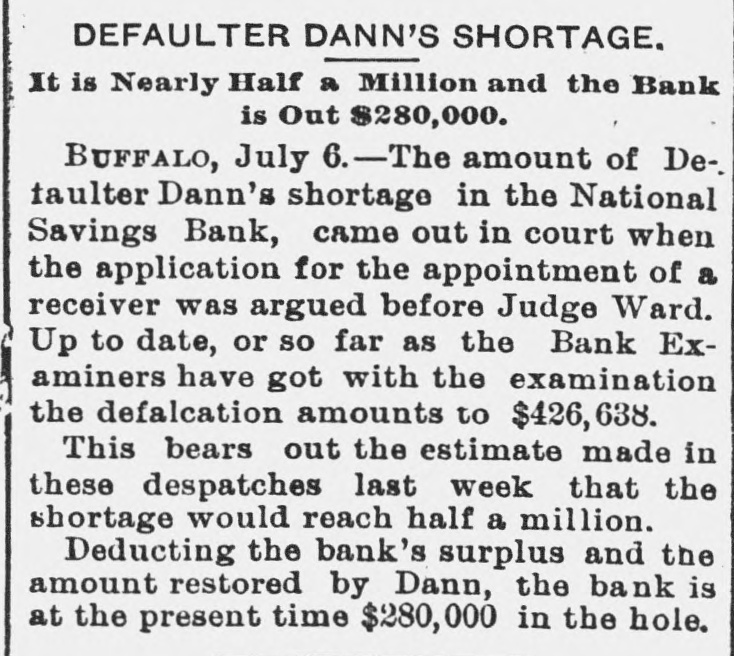DEFAULTER DANN'S SHORTAGE. It is Nearly Half a Million and the Bank is Out $280,000. BUFFALO, July 6.-The amount of Detaulter Dann's shortage in the National Savings Bank, came out in court when the application for the appointment of a receiver was argued before Judge Ward. Up to date, or so far as the Bank Examiners have got with the examination the defalcation amounts to $426,638. This bears out the estimate made in these despatches last week that the shortage would reach half a million. Deducting the bank's surplus and the amount restored by Dann, the bank is at the present time $280,000 in the hole.