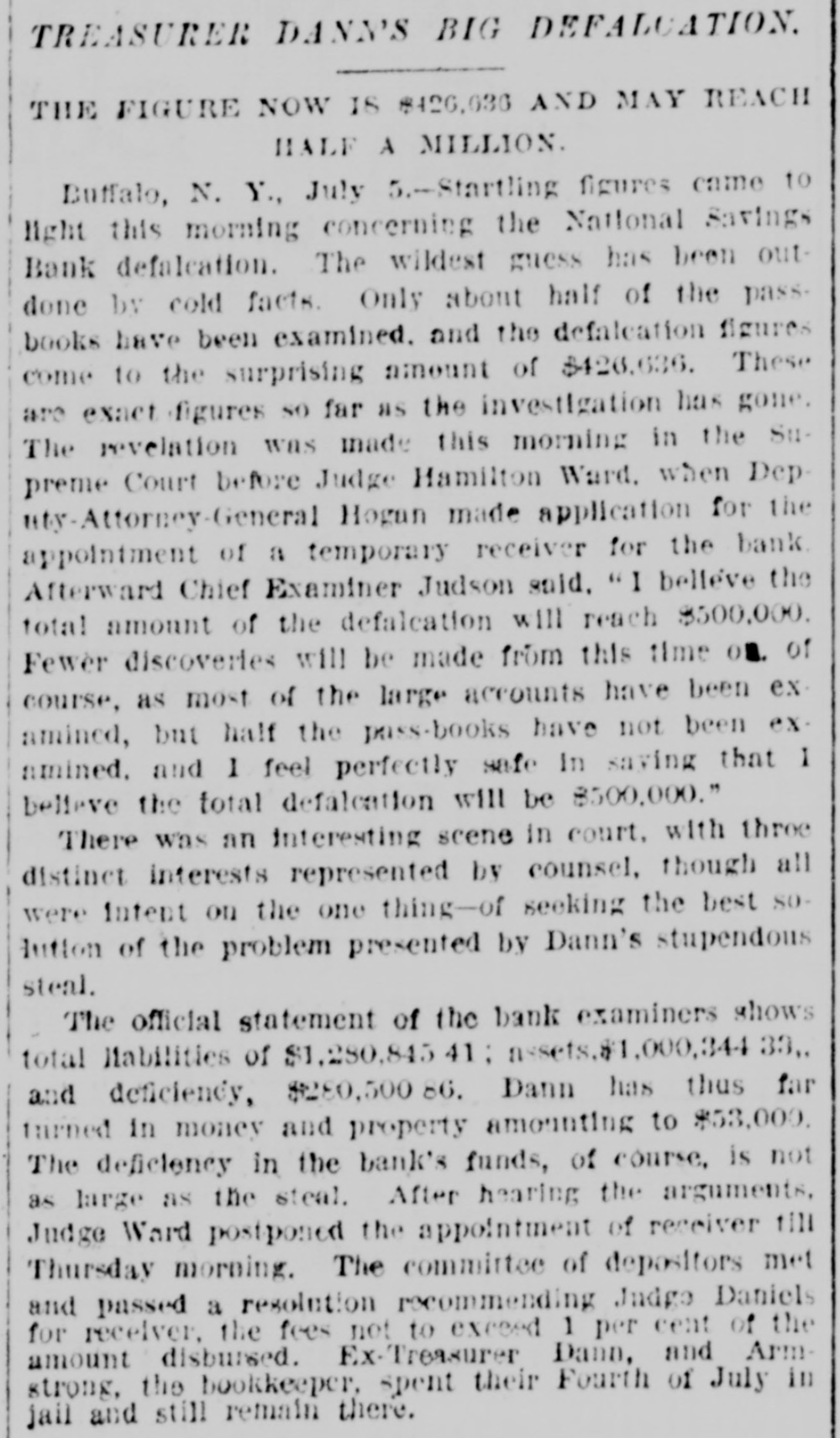 TREASURER DANN'S BIG DEFALCATION. THE FIGURE NOW IS $426,030 AND MAY REACH HALF A MILLION. Buffalo, N. Y., July 5.-Startling figures came to light this morning concerning the National Savings Bank defalcation. The wildest guess has been outdone by cold facts. Only about half of the passbooks have been examined. and the defalcation figures come to the surprising amount of $426,636. These are exact figures so far as the investigation has gone. The revelation was made this morning in the Supreme Court before Judge Hamilton Ward. when Deputy-Attorney-General Hogan made application for the appointment of a temporary receiver for the bank. Afterward Chief Examiner Judson said. "I believe the total amount of the defalcation will reach $500,000. Fewer discoveries will be made from this time on. of course, as most of the large accounts have been examined, but half the pass-books have not been examined. and 1 feel perfectly safe In saying that 1 believe the total defalcation will be $500,000." There was an interesting scene in court, with throe distinct interests represented by counsel, though all were intent on the one thing-of seeking the best soButton of the problem presented by Dann's stupendous steal. The official statement of the bank examiners shows total liabilities of $1,280,845 4 nssets,$1,000,344 3 and deficiency, $280,500.86. Dann has thus far turned in money and property amounting to $53,000. The deficiency in the bank's funds, of course, is not as large as the steal. After hearing the arguments, Judge Ward postponed the appointment of receiver fill Thursday morning. The committee of depositors met and passed a resolution recommending Judge Daniels for receiver, the fees not to exceed 1 per cent of the amount disbursed. Ex-Treasurer Dann, and Armstrong, the bookkeeper, spent their Fourth of July in jail and still remain there.