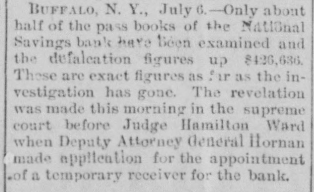 BUFFALO, N. Y., July 6.-Only about half of the pass books of the National Savings bank have Been examined and the defalcation figures up $436,636. These are exact figures as far as the investigation has gone. The revelation was made this morning in the supreme court before Judge Hamilton Ward when Deputy Attorney General Hornan made application for the appointment of a temporary receiver for the bank.