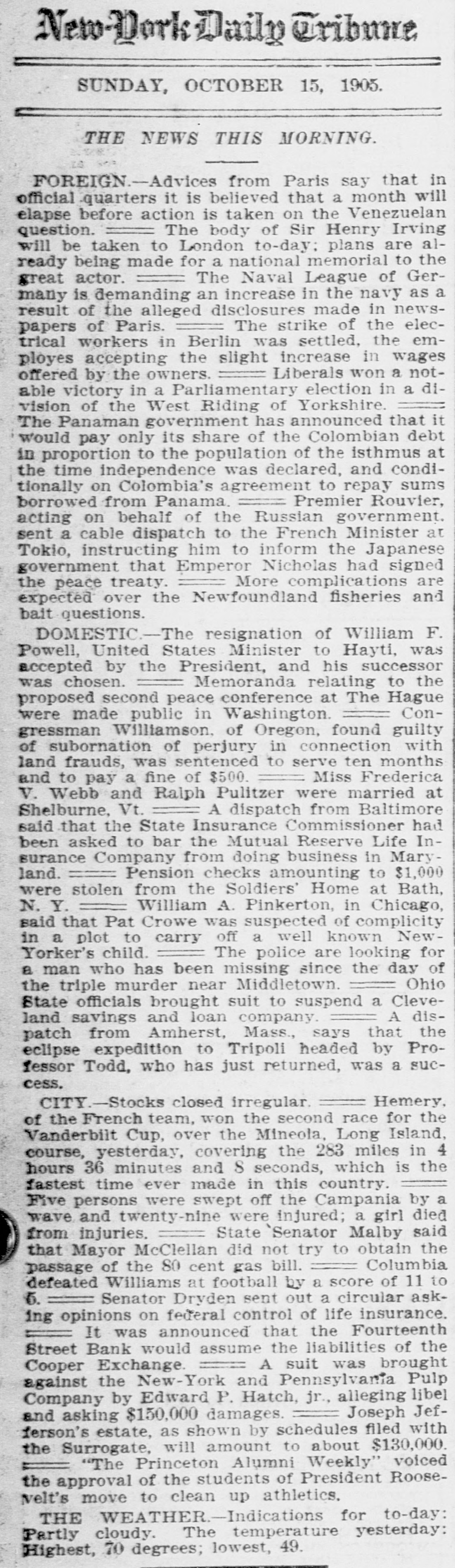 New-Dork-Daily Cribune SUNDAY, OCTOBER 15, 1905. THE NEWS THIS MORNING. FOREIGN.-Advices from Paris say that in official quarters it is believed that a month will elapse before action is taken on the Venezuelan question. The body of Sir Henry Irving will be taken to London to-day; plans are already being made for a national memorial to the great actor. The Naval League of Germany is demanding an increase in the navy as a result of the alleged disclosures made in newspapers of Paris. The strike of the electrical workers in Berlin was settled, the employes accepting the slight increase in wages offered by the owners. Liberals won a notable victory in a Parliamentary election in a division of the West Riding of Yorkshire. The Panaman government has announced that it would pay only its share of the Colombian debt in proportion to the population of the isthmus at the time independence was declared, and conditionally on Colombia's agreement to repay sums borrowed from Panama. Premier Rouvier, acting on behalf of the Russian government. sent a cable dispatch to the French Minister at Tokio, instructing him to inform the Japanese government that Emperor Nicholas had signed the peace treaty. More complications are expected over the Newfoundland fisheries and bait questions. DOMESTIC.-The resignation of William F. Powell, United States Minister to Hayti, was accepted by the President, and his successor was chosen. Memoranda relating to the proposed second peace conference at The Hague were made public in Washington. Congressman Williamson. of Oregon, found guilty of subornation of perjury in connection with land frauds, was sentenced to serve ten months Miss Frederica and to pay a fine of $500. V. Webb and Ralph Pulitzer were married at Shelburne, Vt. A dispatch from Baltimore said that the State Insurance Commissioner had been asked to bar the Mutual Reserve Life Insurance Company from doing business in Maryland. Pension checks amounting to $1,000 were stolen from the Soldiers' Home at Bath, N. Y. William A. Pinkerton, in Chicago, said that Pat Crowe was suspected of complicity in a plot to carry off a well known NewYorker's child. The police are looking for a man who has been missing since the day of the triple murder near Middletown. Ohio State officials brought suit to suspend a Cleveland savings and loan company. A dispatch from Amherst, Mass., says that the eclipse expedition to Tripoli headed by Professor Todd, who has just returned, was a success. Hemery, CITY.-Stocks closed irregular. of the French team, won the second race for the Vanderbilt Cup, over the Mineola, Long Island, course, yesterday, covering the 283 miles in 4 hours 36 minutes and 8 seconds, which is the fastest time ever made in this country. Five persons were swept off the Campania by a wave and twenty-nine were injured; a girl died State Senator Malby said from injuries. that Mayor McClellan did not try to obtain the passage of the 80 cent gas bill. Columbia defeated Williams at football by a score of 11 to 6. Senator Dryden sent out a circular asking opinions on federal control of life insurance. It was announced that the Fourteenth Street Bank would assume the liabilities of the was suit brought A Cooper Exchange against the New-York and Pennsylvania Pulp Company by Edward P. Hatch, jr., alleging libel Joseph Jefand asking $150,000 damages. ferson's estate, as shown by schedules filed with the Surrogate, will amount to about $130,000. "The Princeton Alumni Weekly" voiced the approval of the students of President Roosevelt's move to clean up athletics. THE WEATHER-Indications for to-day: Partly cloudy. The temperature yesterday: Highest, 70 degrees; lowest, 49.