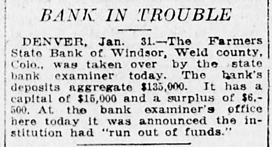 BANK IN TROUBLE DENVER, Jan. 31.-The Farmers State Bank of Windsor, Weld county, Colo., was taken over by the state bank examiner today. The bank's deposits aggregate $135,000. It has a capital of $15,000 and a surplus of $6.500. At the bank examiner's office here today it was announced the institution had "run out of funds."