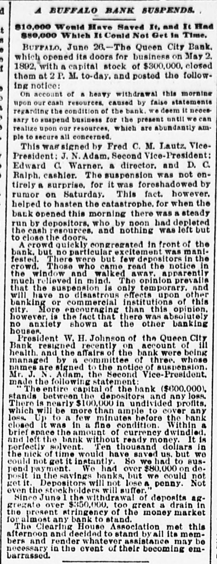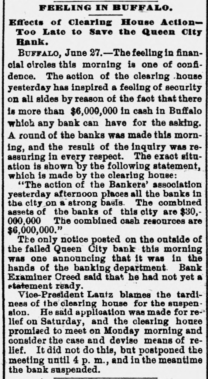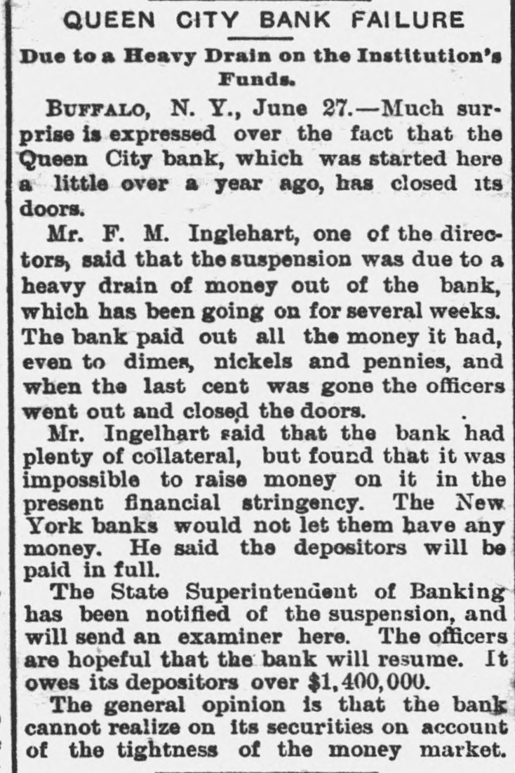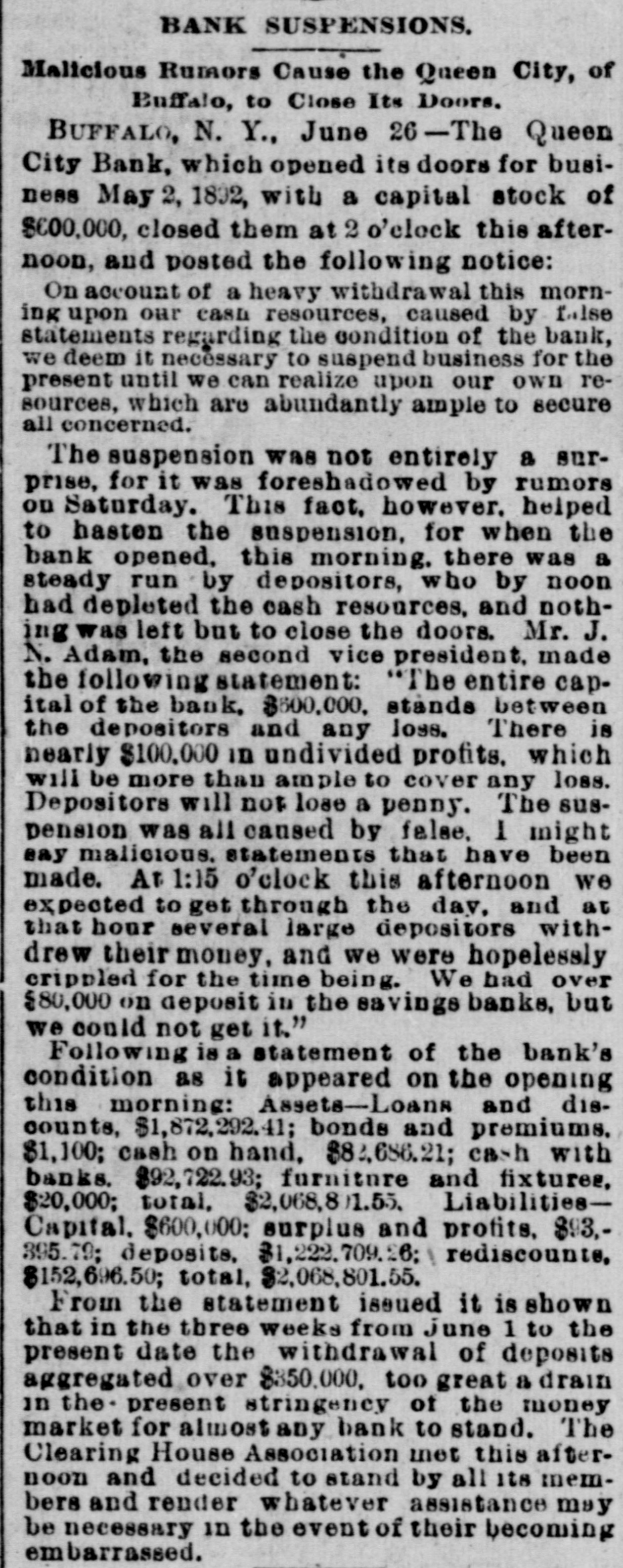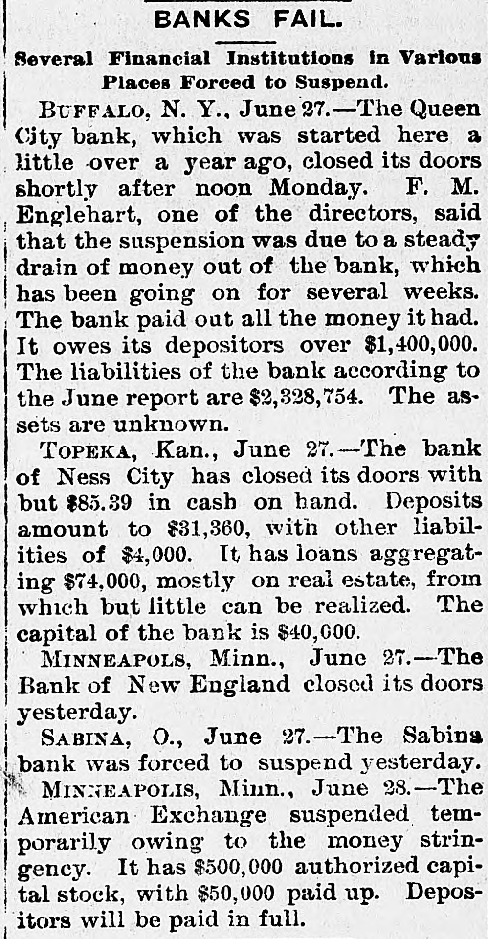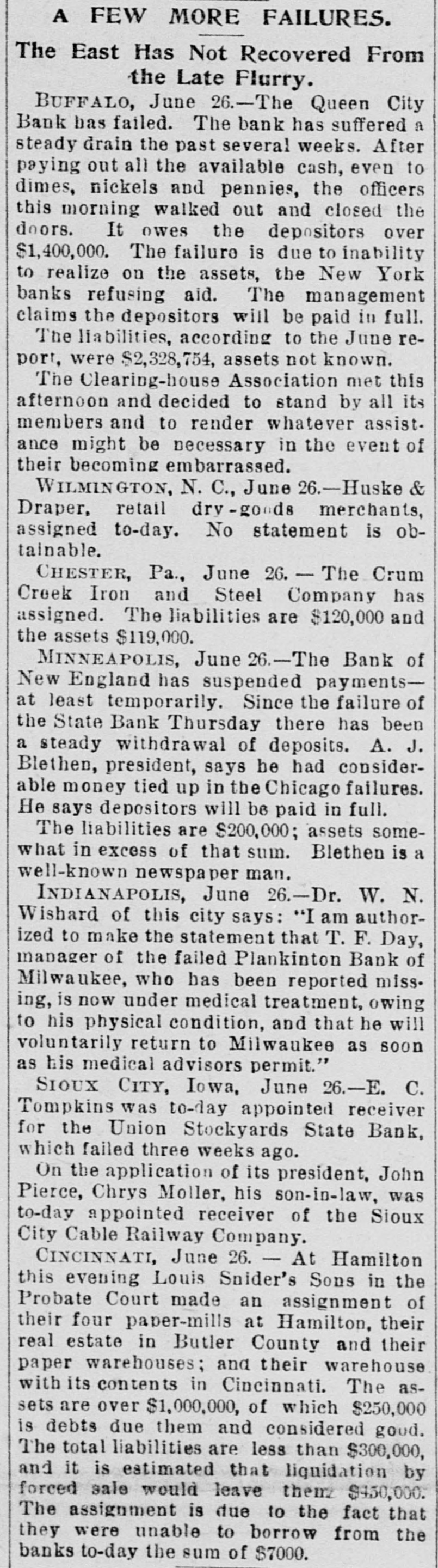 A FEW MORE FAILURES. The East Has Not Recovered From the Late Flurry. BUFFALO, June 26.-The Queen City Bank has failed. The bank has suffered a steady drain the past several weeks. After paying out all the available cash, even to dimes, nickels and pennies, the officers this morning walked out and closed the doors. It owes the depositors over $1,400,000. The failure is due to inability to realize on the assets, the New York banks refusing aid. The management claims the depositors will be paid in full. The liabilities, according to the June report. were $2,328,754, assets not known. The Clearing-house Association met this afternoon and decided to stand by all its members and to render whatever assist. ance might be necessary in the event of their becoming embarrassed. WILMINGTON, N. C., June 26.-Huske & Draper, retail dry-goods merchants, assigned to-day. No statement is obtainable. CHESTER, Pa., June 26. - The Crum Creek Iron and Steel Company has assigned. The liabilities are $120,000 and the assets $119,000. MINNEAPOLIS, June 26.-The Bank of New England has suspended paymentsat least temporarily. Since the failure of the State Bank Thursday there has been a steady withdrawal of deposits. A. J. Blethen, president, says he had considerable money tied up in the Chicago failures. He says depositors will be paid in full. The liabilities are $200,000; assets somewhat in excess of that sum. Blethen is a well-known newspaper man. INDIANAPOLIS, June 26.-Dr. W. N. Wishard of this city says: "I am authorized to make the statement that T. F. Day, manager of the failed Plankinton Bank of Milwaukee, who has been reported miss. ing, is now under medical treatment, owing to his physical condition, and that he will voluntarily return to Milwaukee as soon as his medical advisors permit." SIOUX CITY, Iowa, June 26.-E. C. Tompkins was to-day appointed receiver for the Union Stockyards State Bank, which failed three weeks ago. On the application of its president, John Pierce, Chrys Moller, his son-in-law, was to-day appointed receiver of the Sioux City Cable Railway Company. CINCINNATI, June 26. - At Hamilton this evening Louis Snider's Sons in the Probate Court made an assignment of their four paper-mills at Hamilton, their real estate in Butler County and their paper warehouses; and their warehouse with its contents in Cincinnati. The assets are over $1,000,000, of which $250,000 is debts due them and considered good. The total liabilities are less than $300,000, and it is estimated that liquidation by forced sale would leave them $430,000. The assignment is due to the fact that they were unable to borrow from the banks to-day the sum of $7000.
