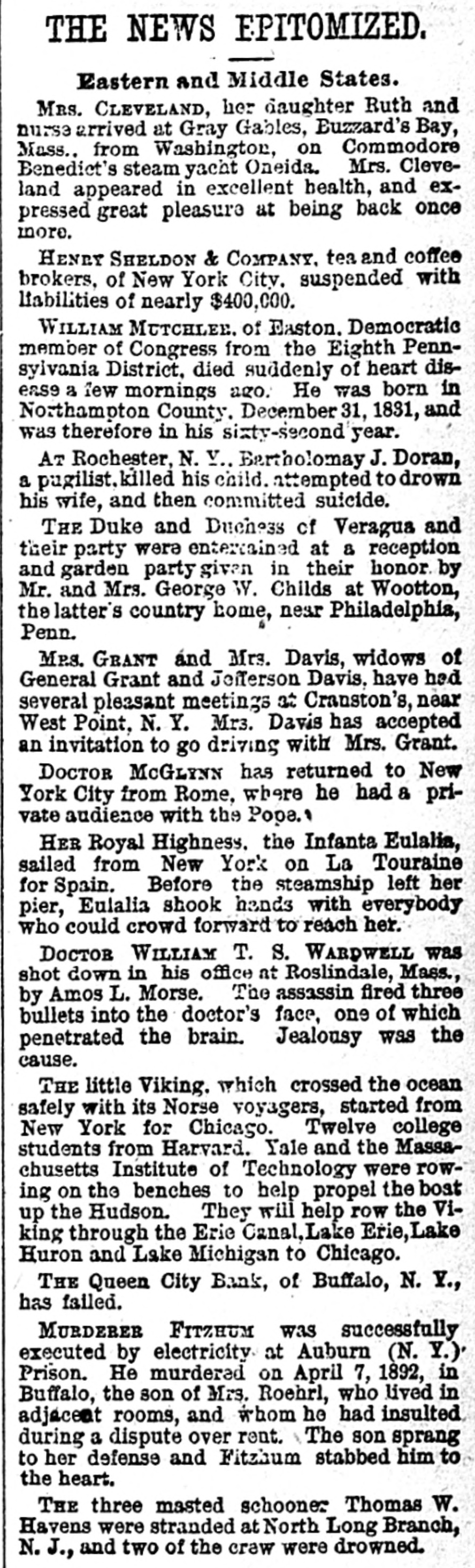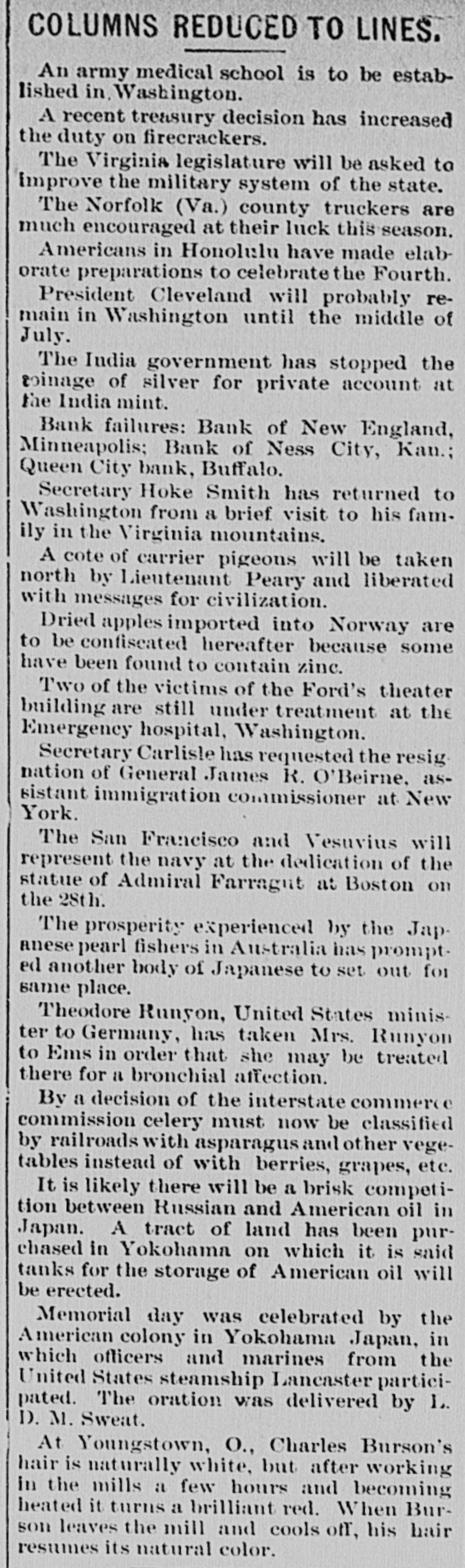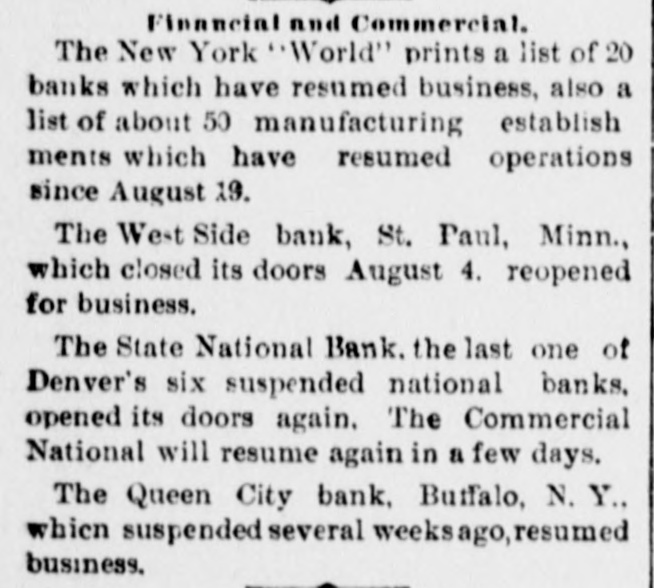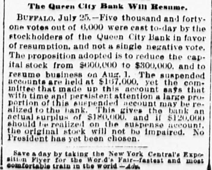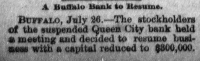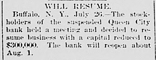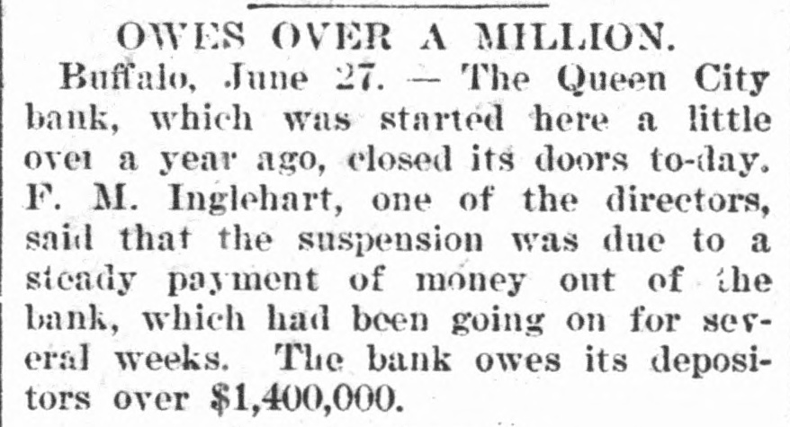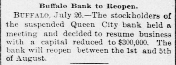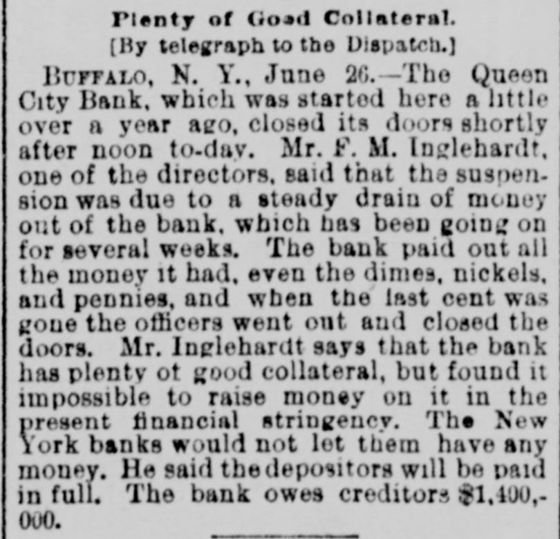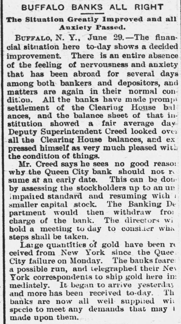 A FEW MORE FAILURES. The East Has Not Recovered From the Late Flurry. BUFFALO, June 26.-The Queen City Bank has failed. The bank has suffered a steady drain the past several weeks. After paying out all the available cash, even to dimes, nickels and pennies, the officers this morning walked out and closed the doors. It owes the depositors over $1,400,000. The failure is due to inability to realize on the assets, the New York banks refusing aid. The management claims the depositors will be paid in full. The liabilities, according to the June report. were $2,328,754, assets not known. The Clearing-house Association met this afternoon and decided to stand by all its members and to render whatever assist. ance might be necessary in the event of their becoming embarrassed. WILMINGTON, N. C., June 26.-Huske & Draper, retail dry-goods merchants, assigned to-day. No statement is obtainable. CHESTER, Pa., June 26. - The Crum Creek Iron and Steel Company has assigned. The liabilities are $120,000 and the assets $119,000. MINNEAPOLIS, June 26.-The Bank of New England has suspended paymentsat least temporarily. Since the failure of the State Bank Thursday there has been a steady withdrawal of deposits. A. J. Blethen, president, says he had considerable money tied up in the Chicago failures. He says depositors will be paid in full. The liabilities are $200,000; assets somewhat in excess of that sum. Blethen is a well-known newspaper man. INDIANAPOLIS, June 26.-Dr. W. N. Wishard of this city says: "I am authorized to make the statement that T. F. Day, manager of the failed Plankinton Bank of Milwaukee, who has been reported miss. ing, is now under medical treatment, owing to his physical condition, and that he will voluntarily return to Milwaukee as soon as his medical advisors permit." SIOUX CITY, Iowa, June 26.-E. C. Tompkins was to-day appointed receiver for the Union Stockyards State Bank, which failed three weeks ago. On the application of its president, John Pierce, Chrys Moller, his son-in-law, was to-day appointed receiver of the Sioux City Cable Railway Company. CINCINNATI, June 26. - At Hamilton this evening Louis Snider's Sons in the Probate Court made an assignment of their four paper-mills at Hamilton, their real estate in Butler County and their paper warehouses; and their warehouse with its contents in Cincinnati. The assets are over $1,000,000, of which $250,000 is debts due them and considered good. The total liabilities are less than $300,000, and it is estimated that liquidation by forced sale would leave them $430,000. The assignment is due to the fact that they were unable to borrow from the banks to-day the sum of $7000.